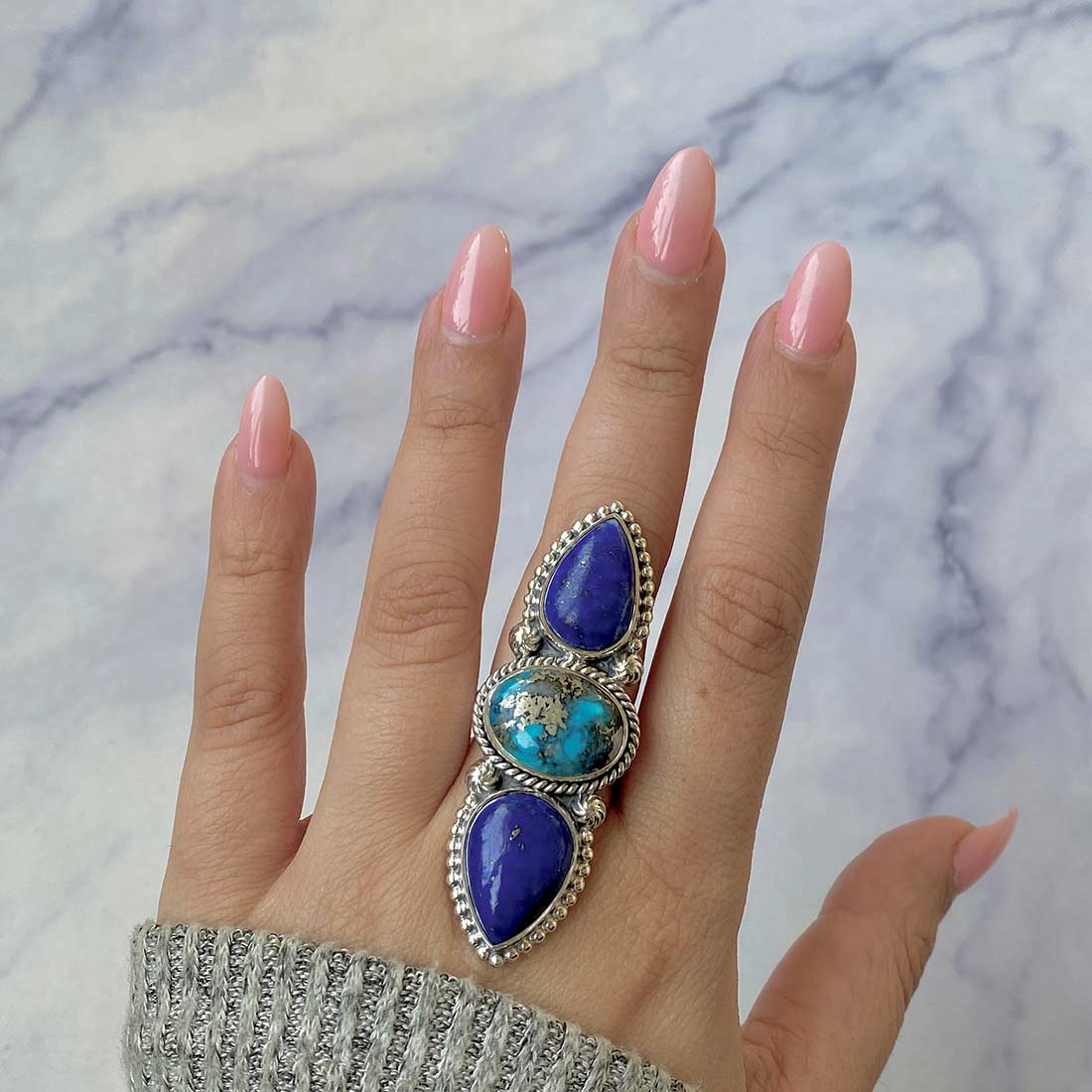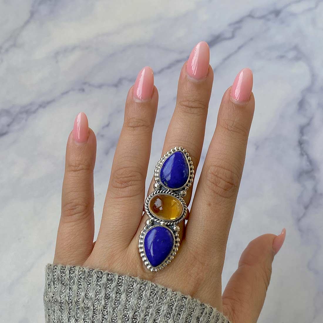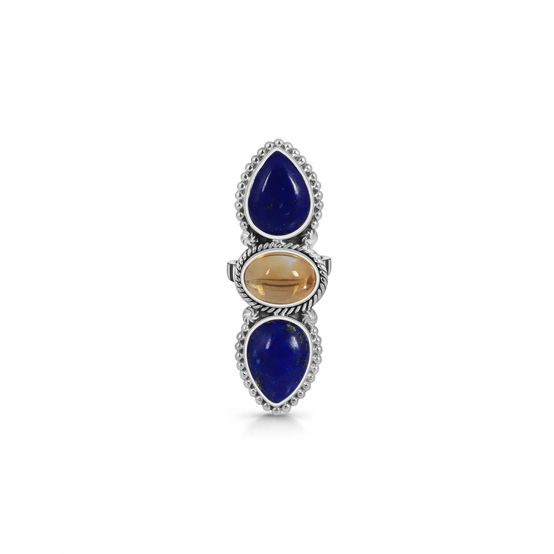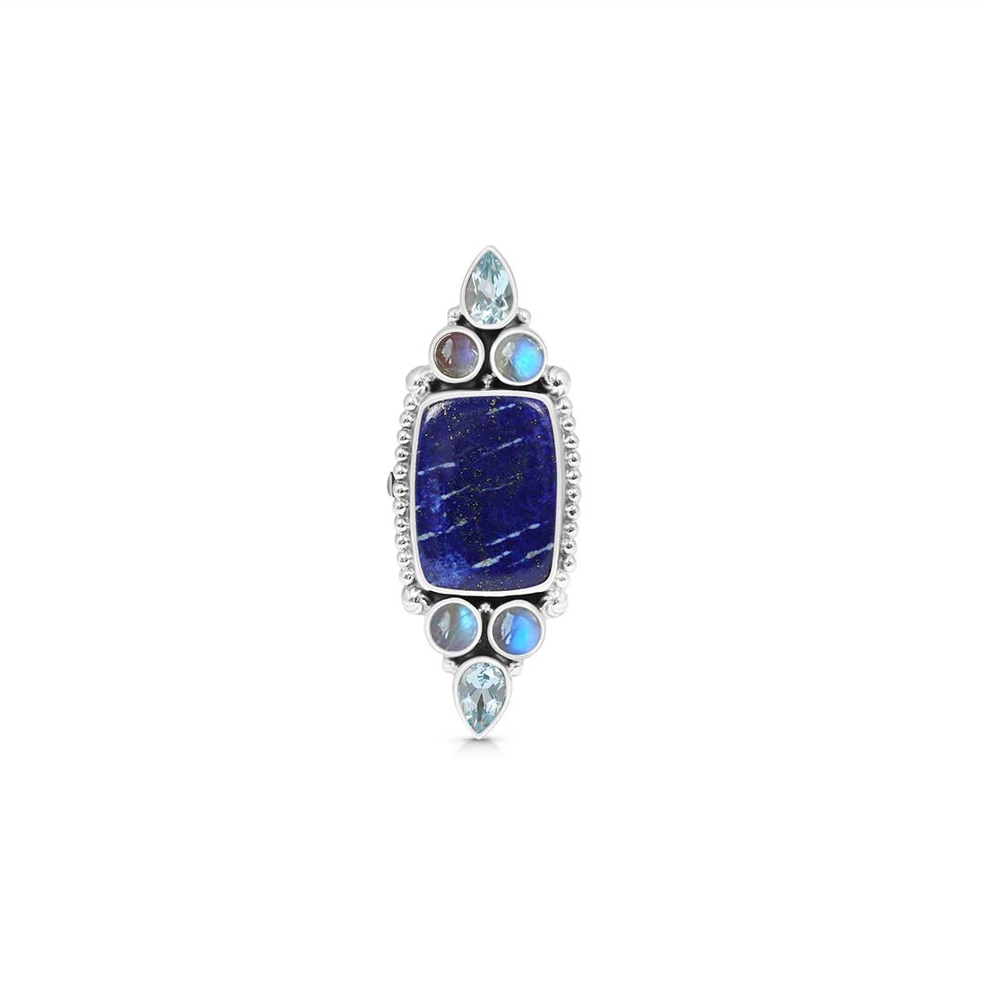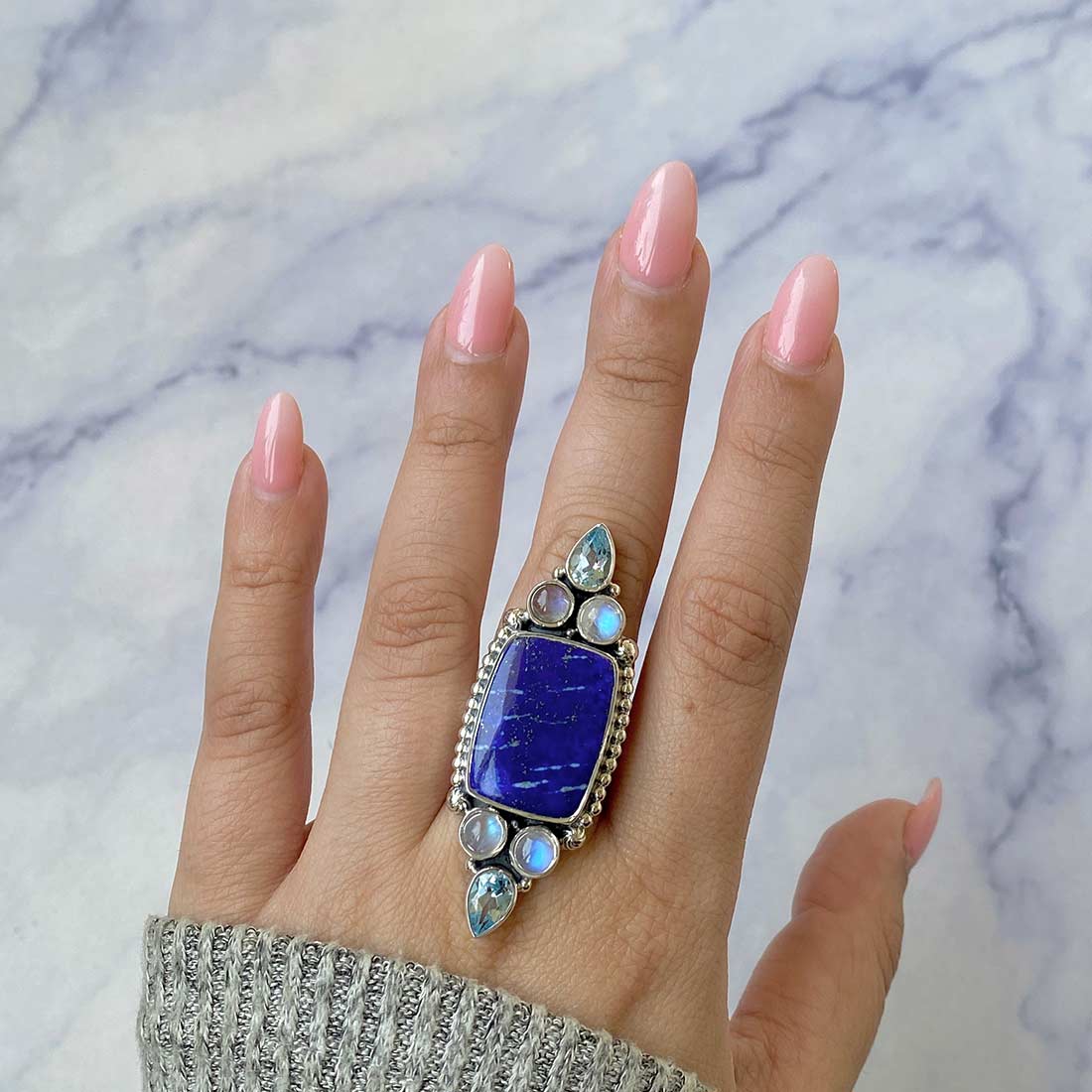 Last but not least, the statement lapis lazuli, blue topaz, and moonstone adjustable rings enhance the intuitive powers and activate the crown chakra, enabling the wearer to strengthen the sixth sense and other sensory organs.