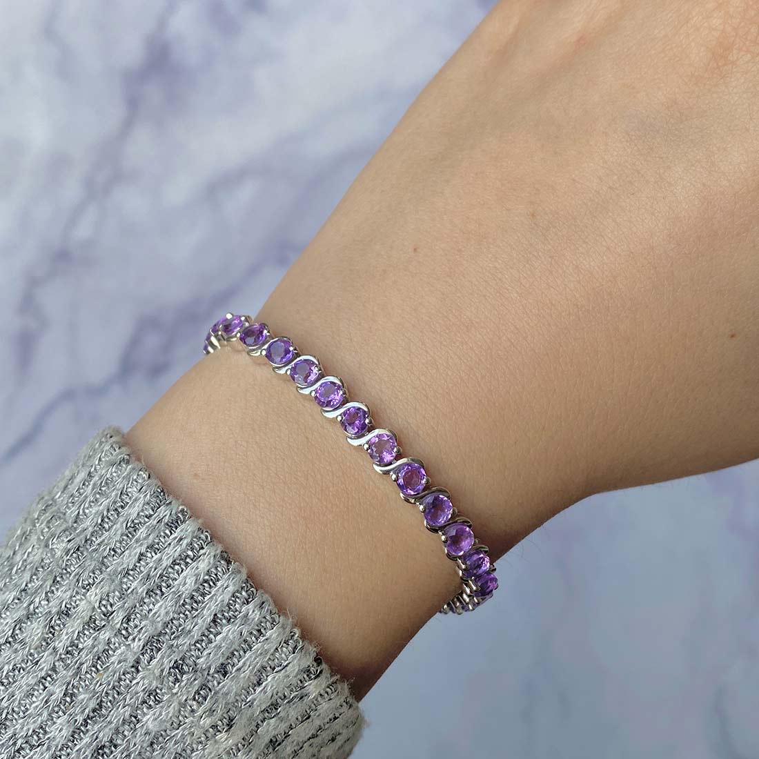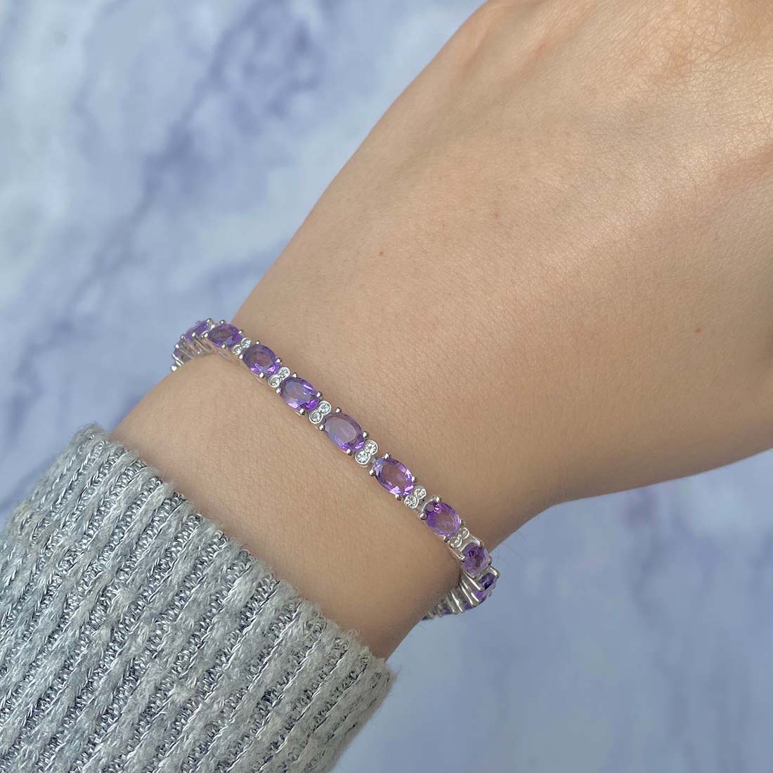 Amethyst bracelets hold a timeless allure with their rich purple hues that can effortlessly complement a range of outfits. For a relaxed look, pair them with jeans and white T-shirts or plain blouses and jackets. Opt for delicate Amethyst stud earrings or a sleek Amethyst pendant to complement your professional attire. These understated pieces can bring a refined elegance to your work clothing. If dressing for special occasions, choose a black sheath cocktail dress, a white bodycon mini skirt, or a blue knit sweater and pair it with eye-catching Amethyst Jewelry.