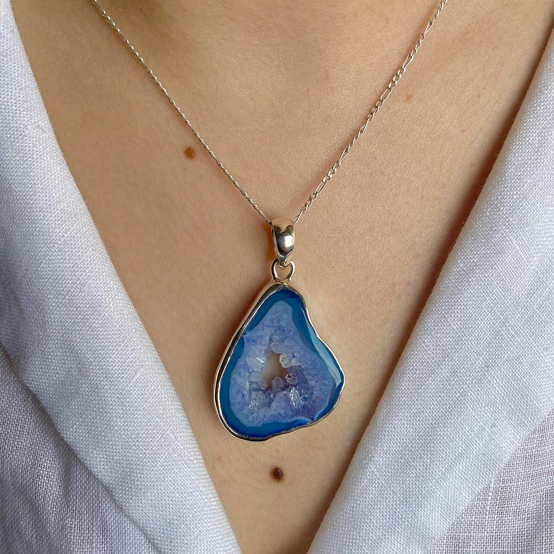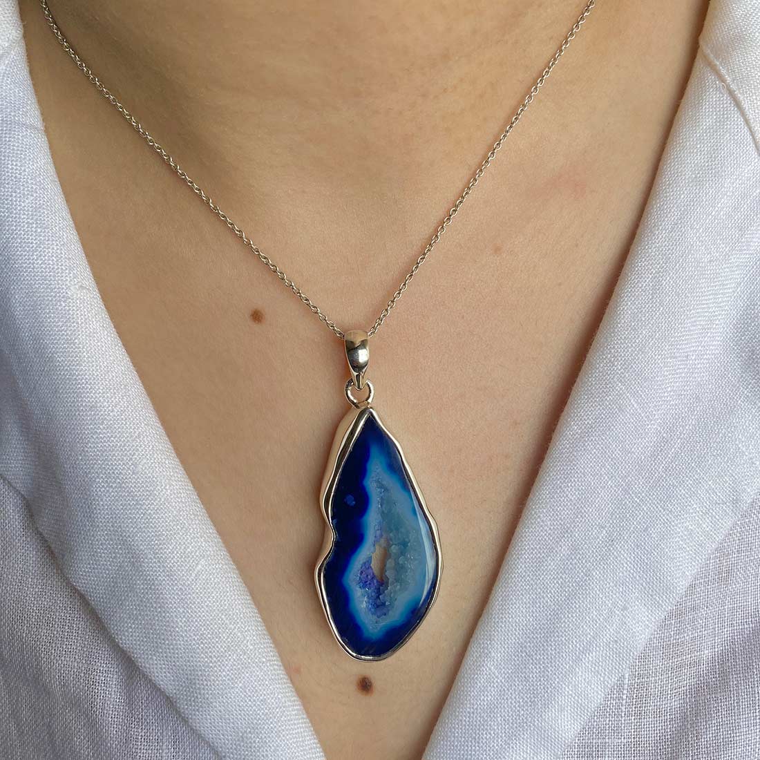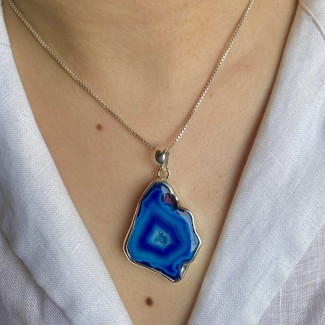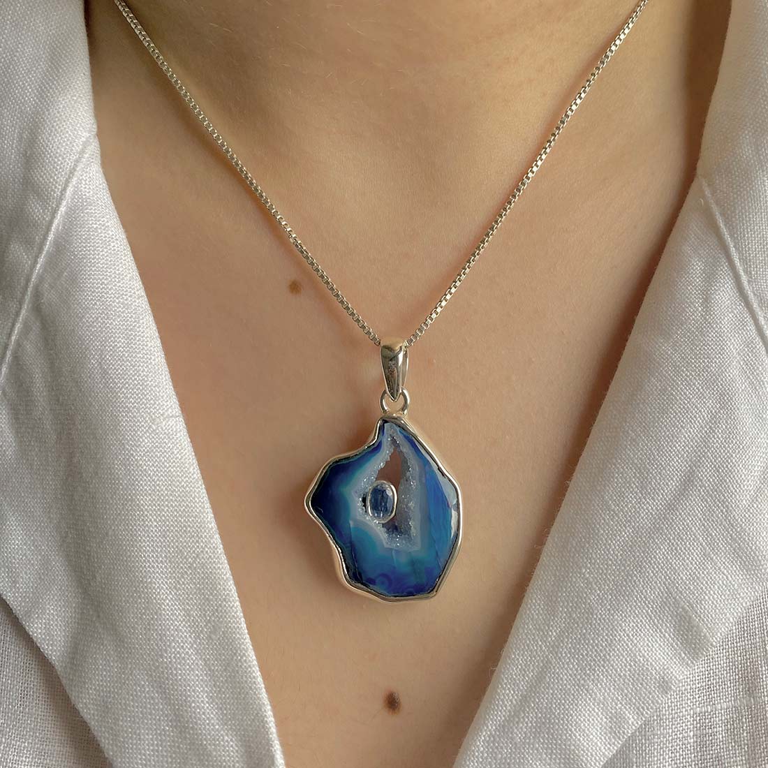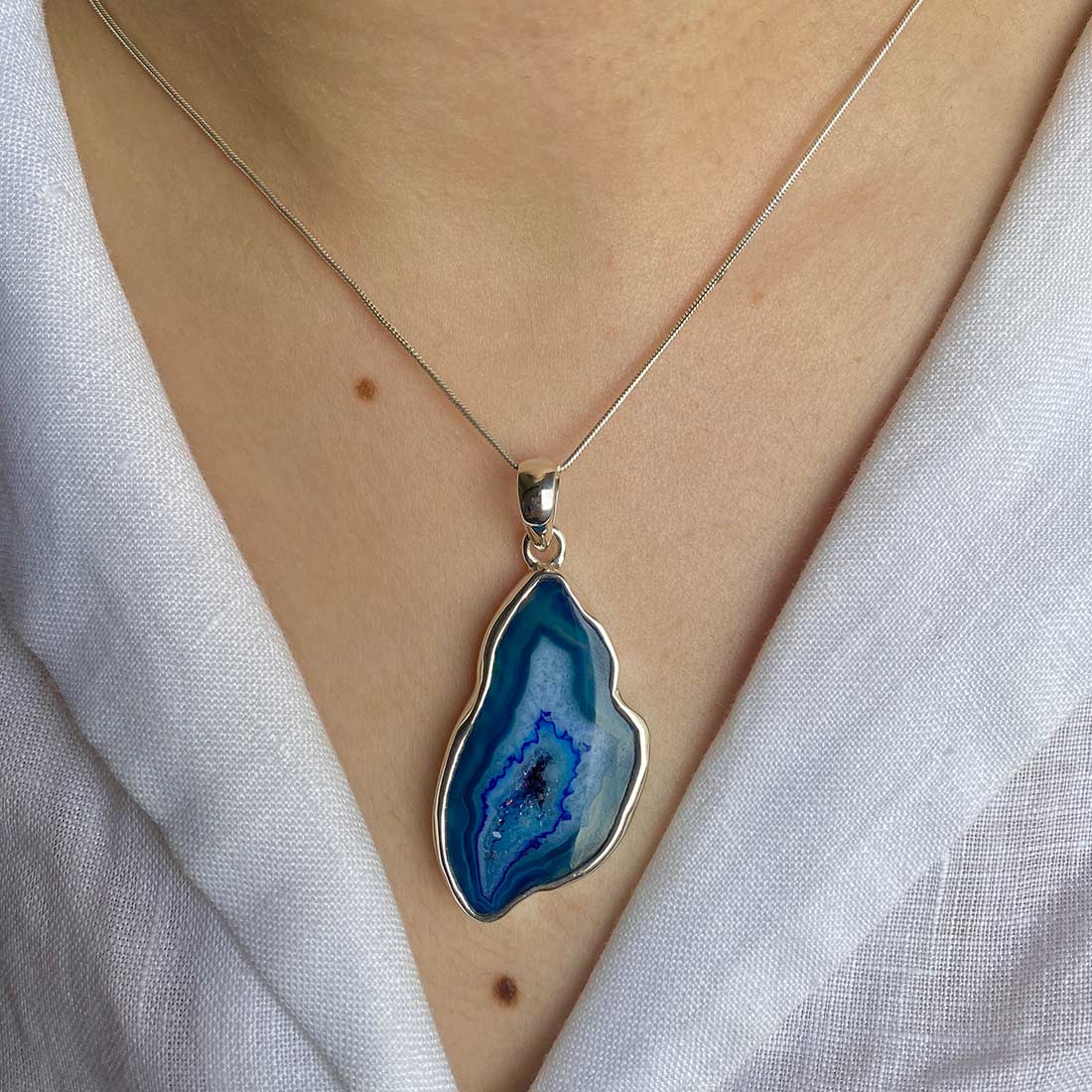 The blue agate pendant is such a masterpiece that it enhances the look of the wearer. Just once it adorns the neckline, it forces people to turn their heads at any event or occasion, whether it is formal or informal. When curated in 925 sterling silver, its shine reaches this range that no one can resist purchasing a beautiful piece of blue agate pendant. After purchasing, styling the jewelry is another important factor that will enhance the overall appeal. It can be beautifully paired with white pants and a black crop top or can be adorned with a pleasing short pink dress. Additionally, pairing the pendant with an blue agate ring, blue agate bracelet, or any other gemstone jewelry like variscite, rose quartz, or red coral makes it the most appealing contrast. The way it blends with other gemstones easily makes it the most astonishing accessory for a lifetime.