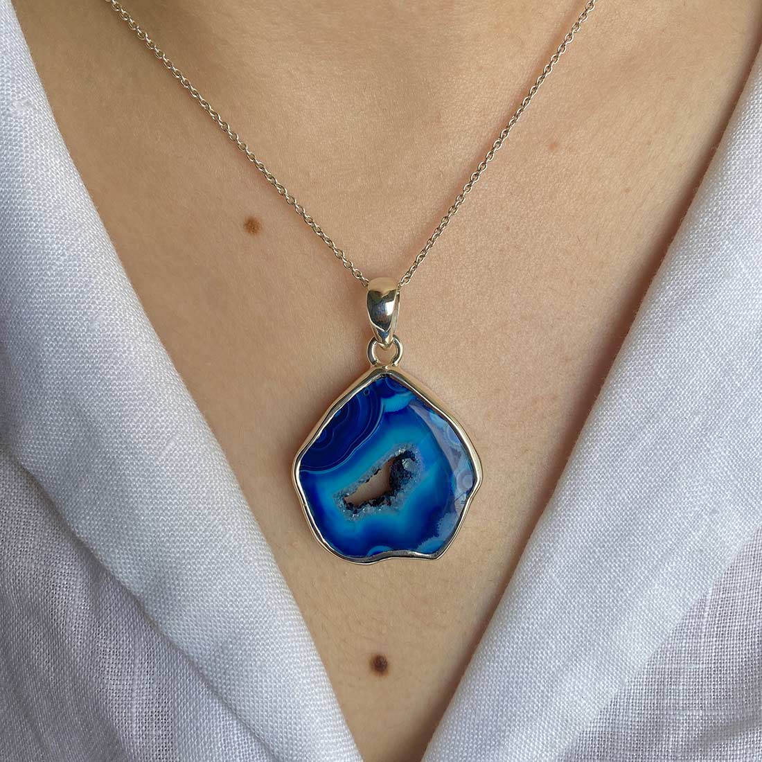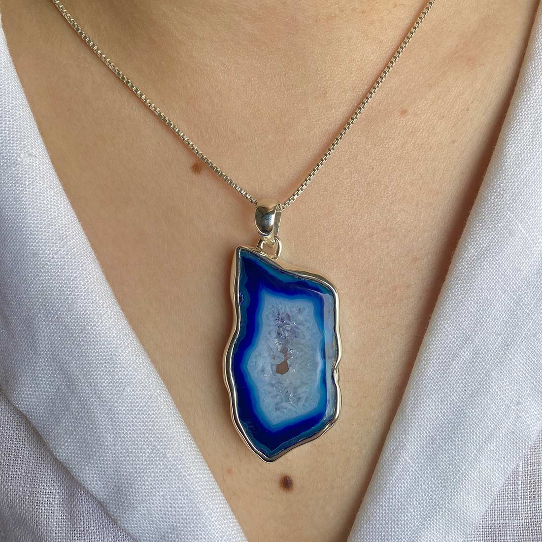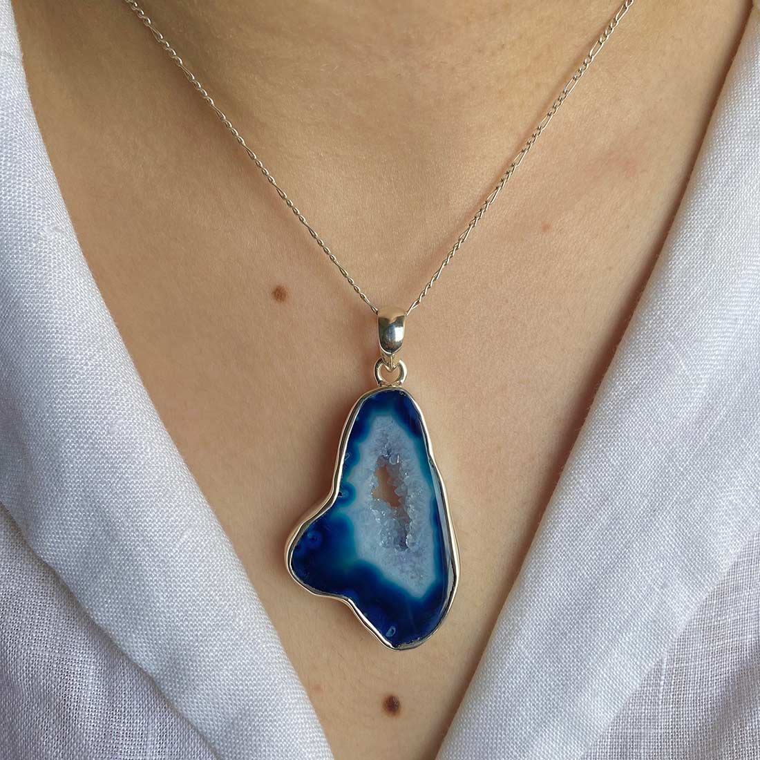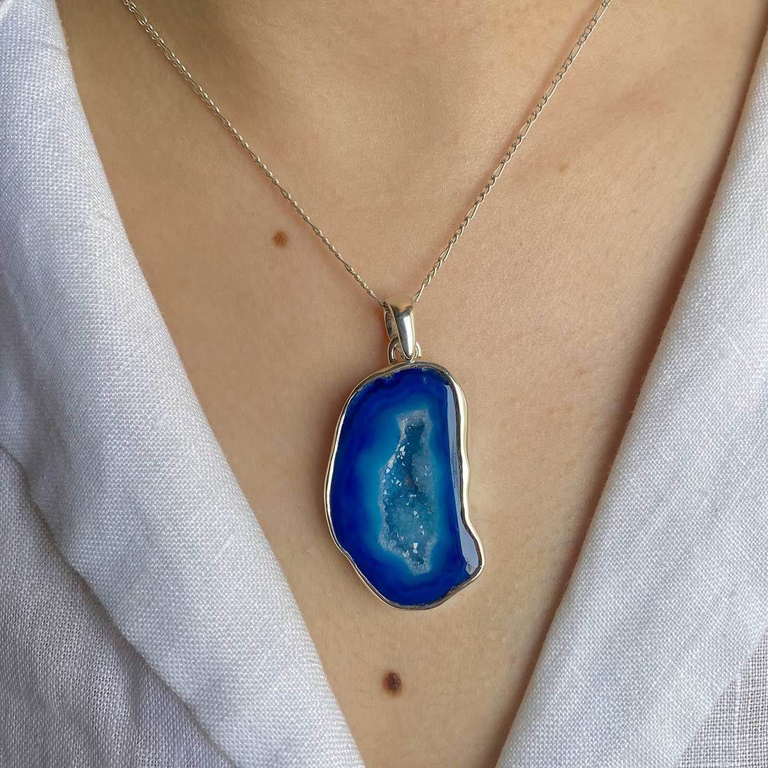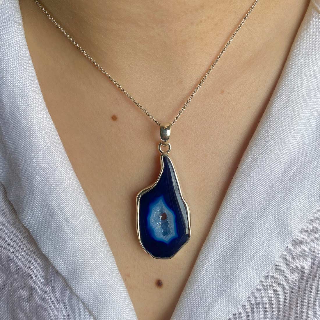 The blue agate pendant is such a masterpiece that it enhances the look of the wearer. Just once it adorns the neckline, it forces people to turn their heads at any event or occasion, whether it is formal or informal. When curated in 925 sterling silver, its shine reaches this range that no one can resist purchasing a beautiful piece of blue agate pendant. After purchasing, styling the jewelry is another important factor that will enhance the overall appeal. It can be beautifully paired with white pants and a black crop top or can be adorned with a pleasing short pink dress. Additionally, pairing the pendant with an blue agate ring, blue agate bracelet, or any other gemstone jewelry like variscite, rose quartz, or red coral makes it the most appealing contrast. The way it blends with other gemstones easily makes it the most astonishing accessory for a lifetime.