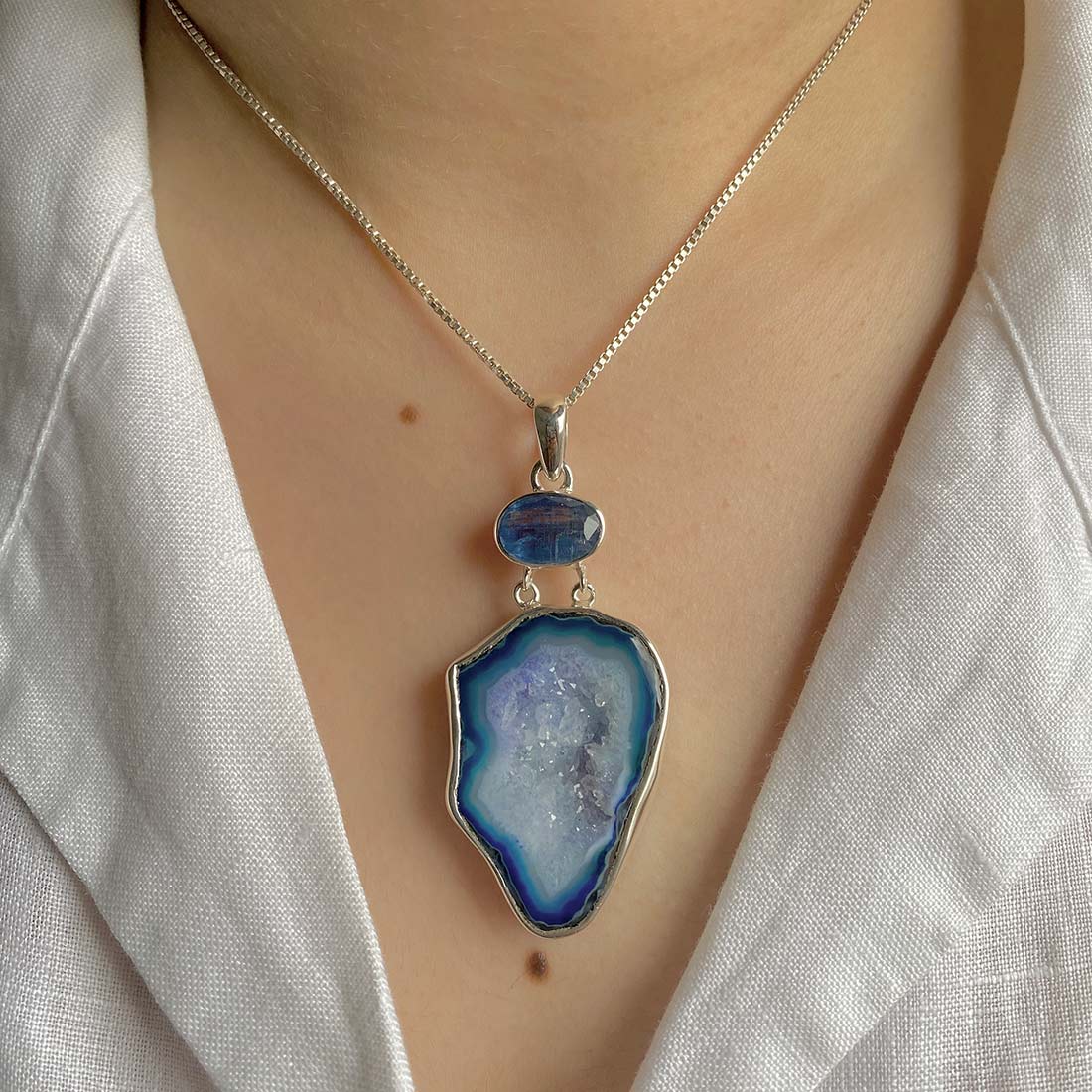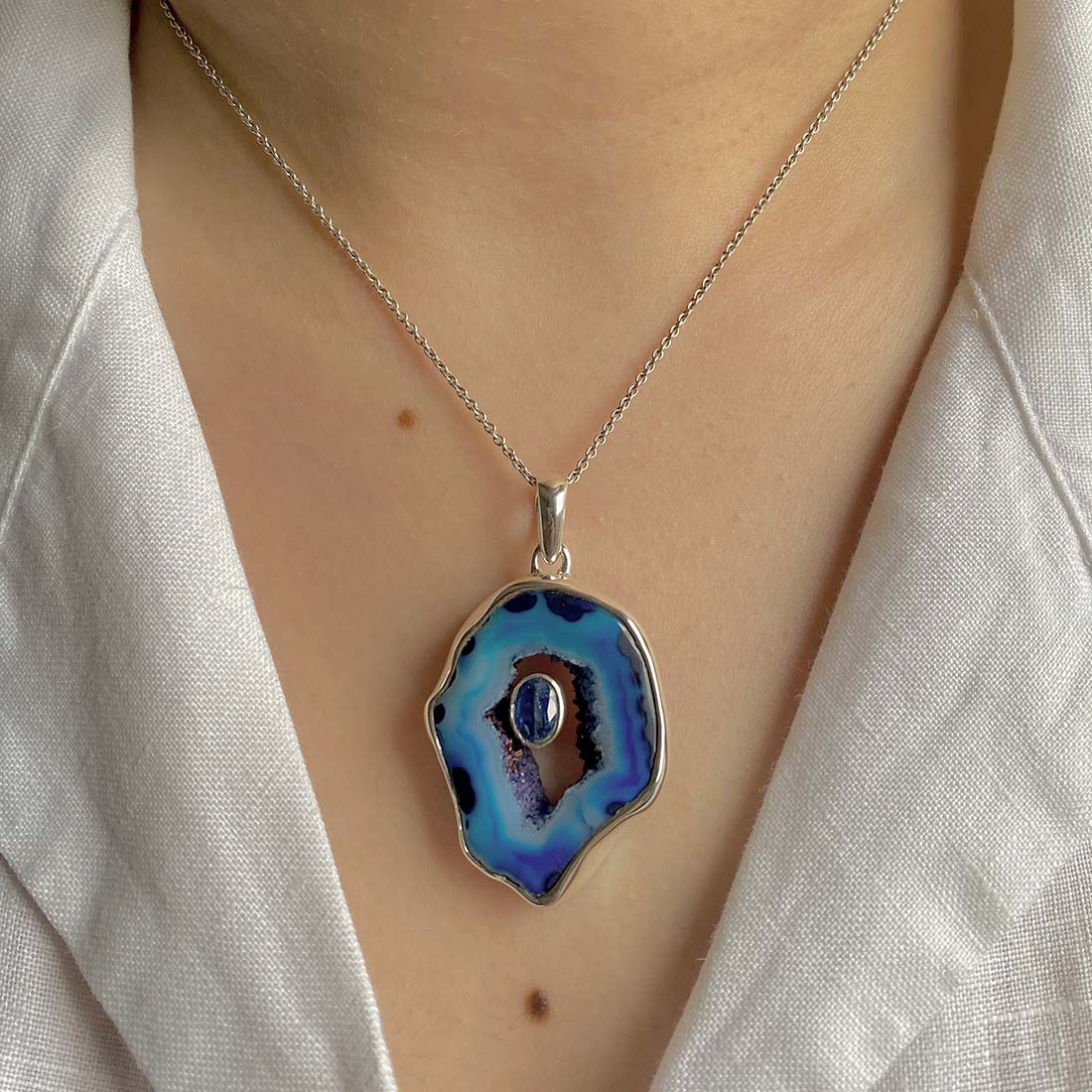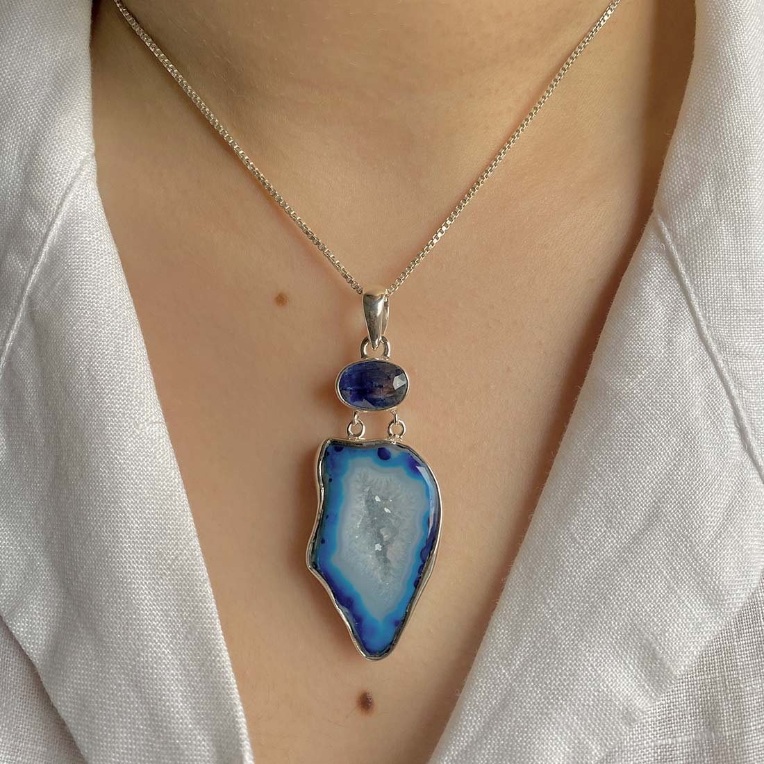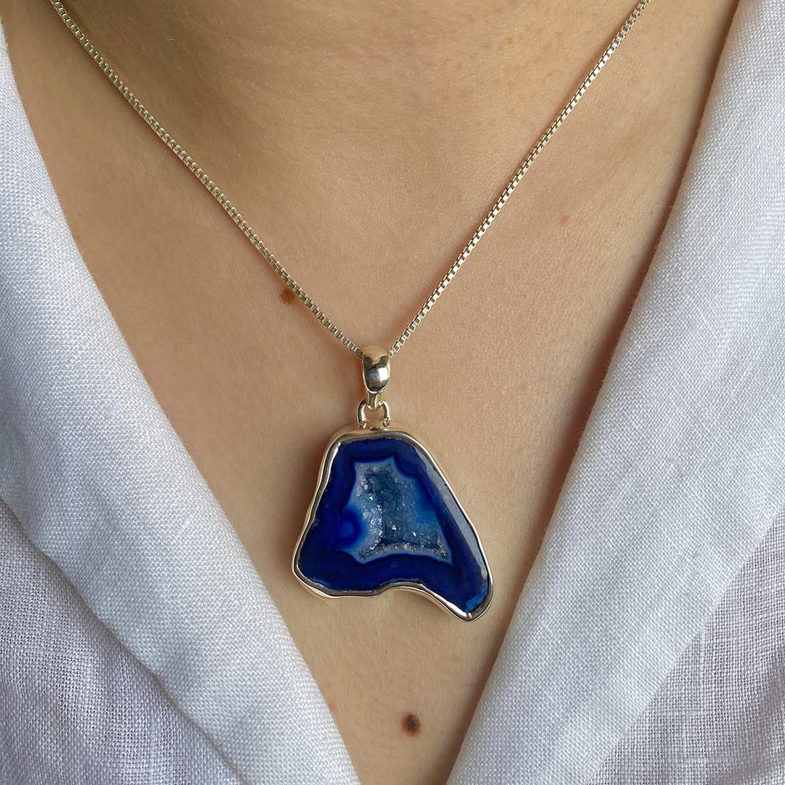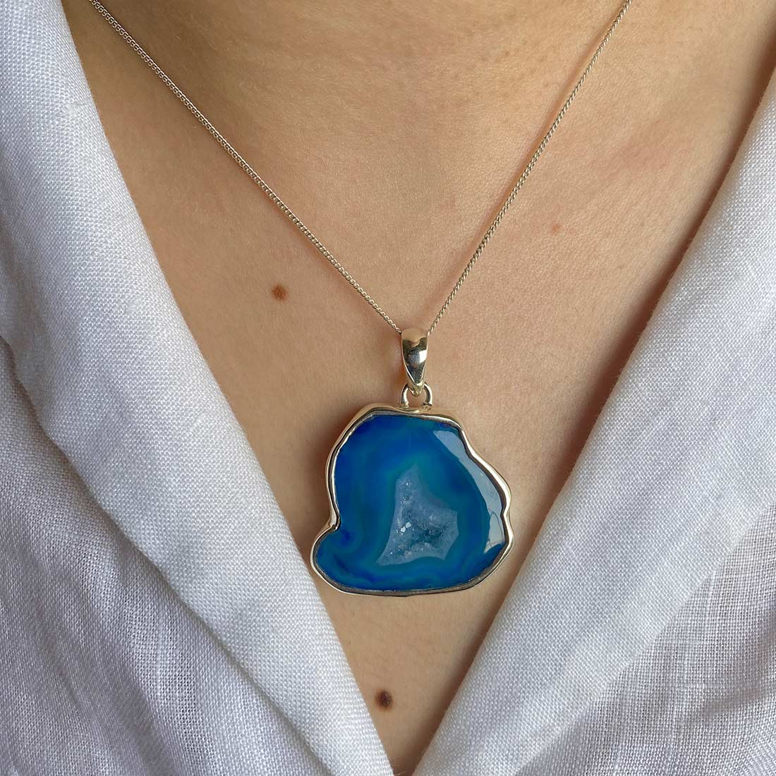 The blue agate pendant is such a masterpiece that it enhances the look of the wearer. Just once it adorns the neckline, it forces people to turn their heads at any event or occasion, whether it is formal or informal. When curated in 925 sterling silver, its shine reaches this range that no one can resist purchasing a beautiful piece of blue agate pendant. After purchasing, styling the jewelry is another important factor that will enhance the overall appeal. It can be beautifully paired with white pants and a black crop top or can be adorned with a pleasing short pink dress. Additionally, pairing the pendant with an blue agate ring, blue agate bracelet, or any other gemstone jewelry like variscite, rose quartz, or red coral makes it the most appealing contrast. The way it blends with other gemstones easily makes it the most astonishing accessory for a lifetime.
