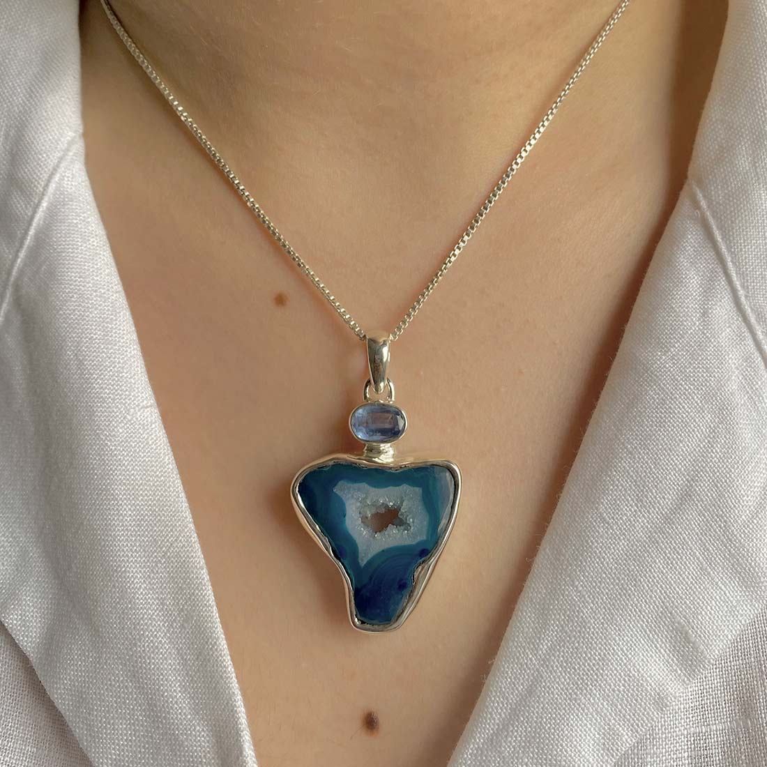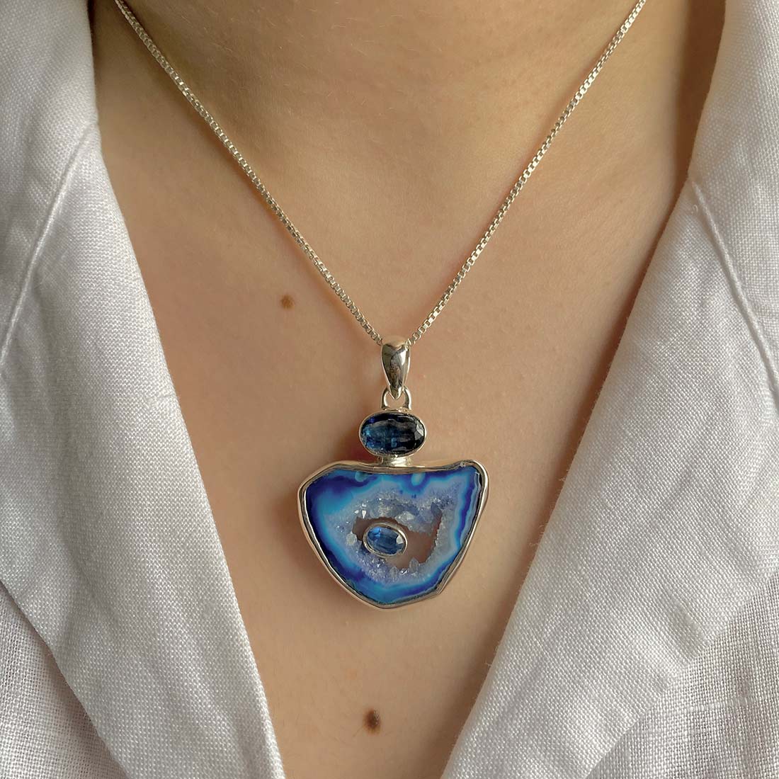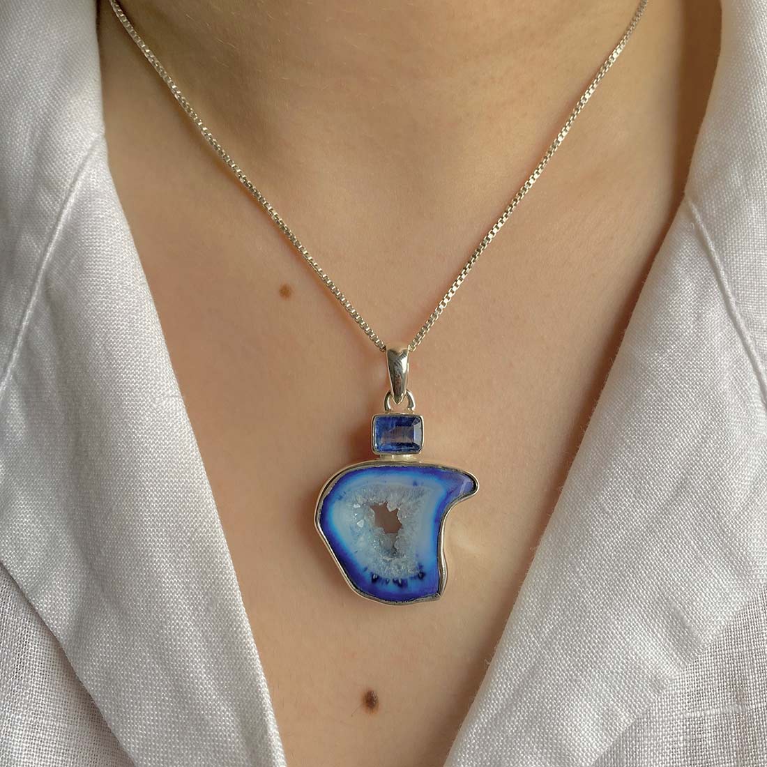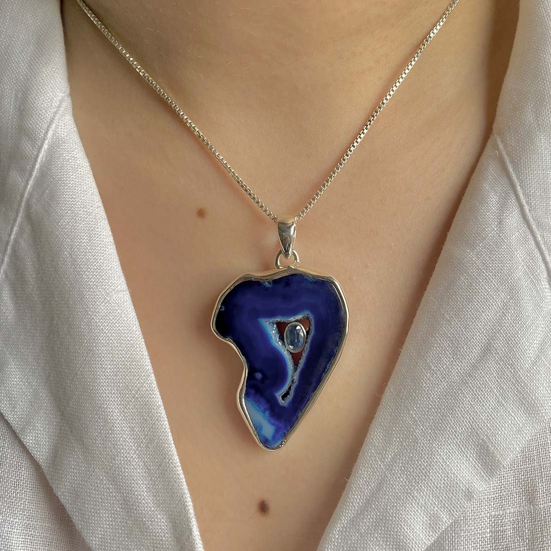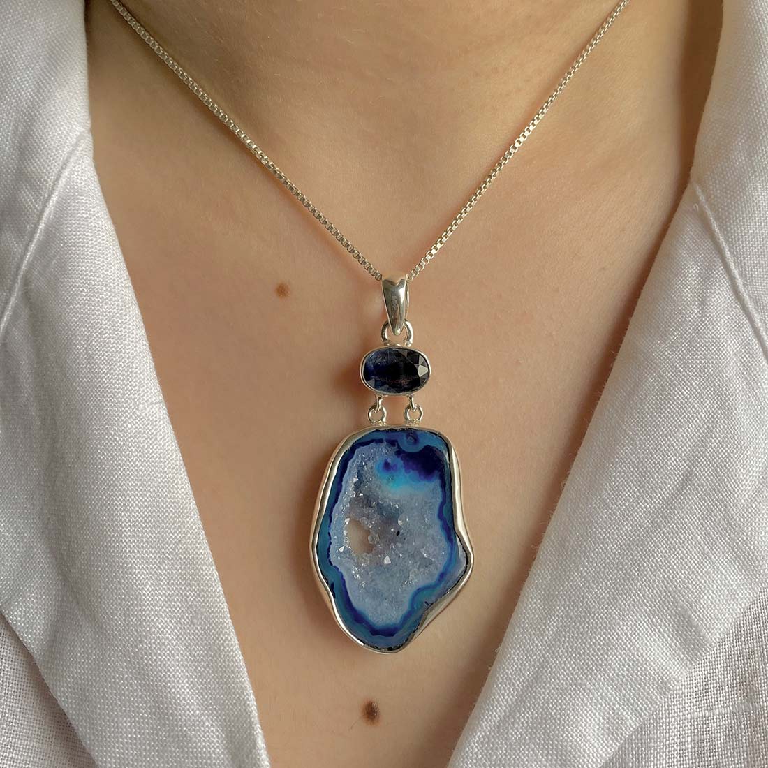 The blue agate pendant is such a masterpiece that it enhances the look of the wearer. Just once it adorns the neckline, it forces people to turn their heads at any event or occasion, whether it is formal or informal. When curated in 925 sterling silver, its shine reaches this range that no one can resist purchasing a beautiful piece of blue agate pendant. After purchasing, styling the jewelry is another important factor that will enhance the overall appeal. It can be beautifully paired with white pants and a black crop top or can be adorned with a pleasing short pink dress. Additionally, pairing the pendant with an blue agate ring, blue agate bracelet, or any other gemstone jewelry like variscite, rose quartz, or red coral makes it the most appealing contrast. The way it blends with other gemstones easily makes it the most astonishing accessory for a lifetime.