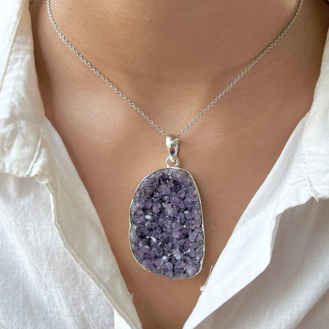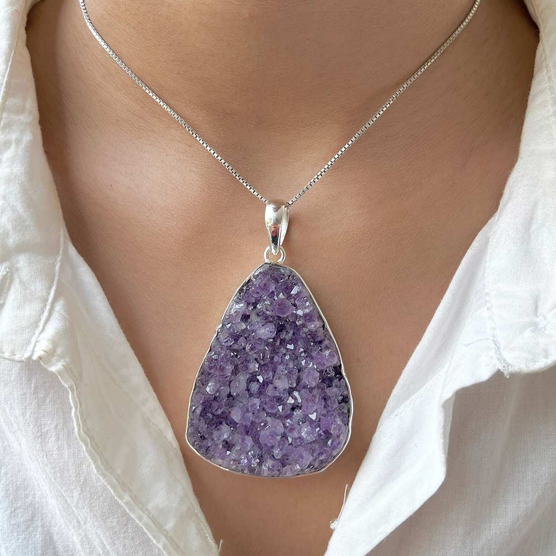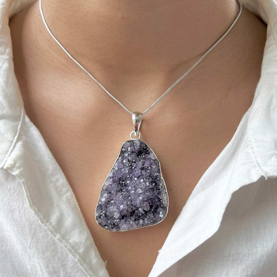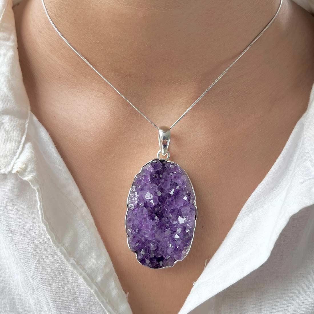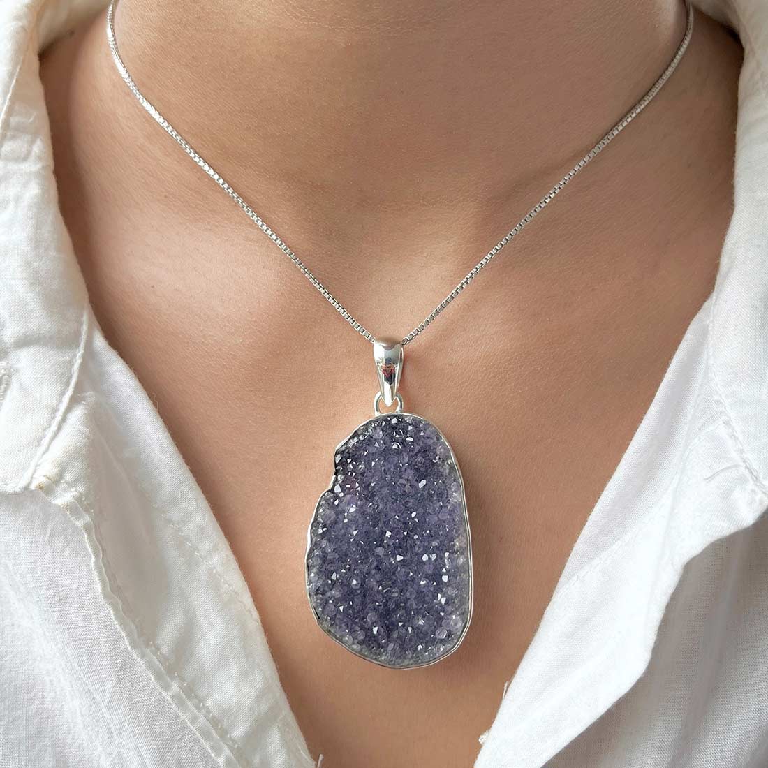 Pendants - the minimalist kind of jewelry. Pendants are the love for ladies. Gifting a classy pendant to your lady love seems like decorating your house with orchids on the occasion of your marriage anniversary. Well, we all know for women, jewelry is love. A single bracelet, ring, or even a pair of earrings can change the whole look. And these accessories capture the shine of eyes more effectively. Even going for a casual office meeting, a woman might forget their makeup but never forgets to style her hair and carry a jewelry piece. And a simple pair of gemstone earrings can add more sparkle to any look. So, let's analyze the deepness of the statement amethyst druzy pendant.