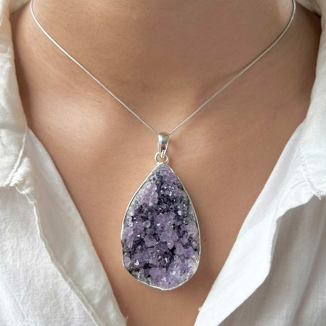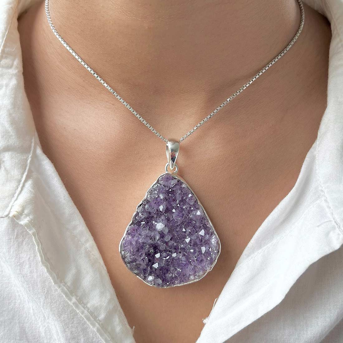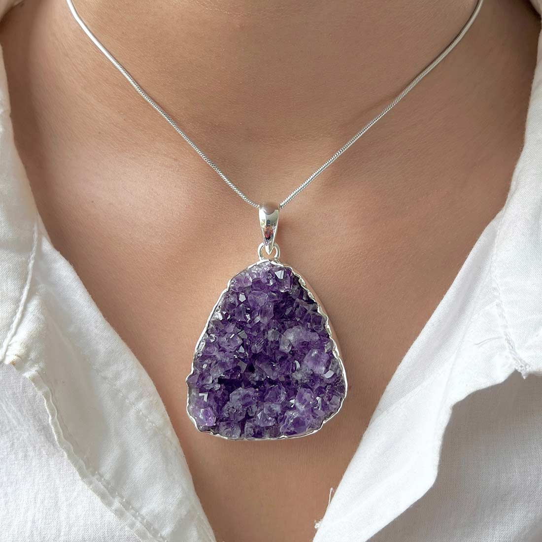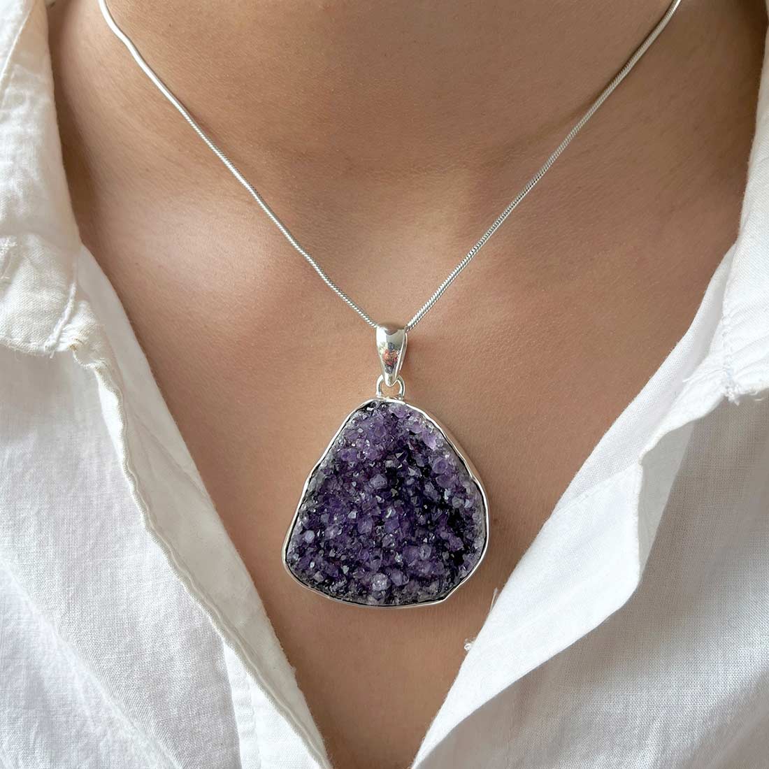 Pendants - the minimalist kind of jewelry. Pendants are the love for ladies. Gifting a classy pendant to your lady love seems like decorating your house with orchids on the occasion of your marriage anniversary. Well, we all know for women, jewelry is love. A single bracelet, ring, or even a pair of earrings can change the whole look. And these accessories capture the shine of eyes more effectively. Even going for a casual office meeting, a woman might forget their makeup but never forgets to style her hair and carry a jewelry piece. And a simple pair of gemstone earrings can add more sparkle to any look. So, let's analyze the deepness of the statement amethyst druzy pendant.