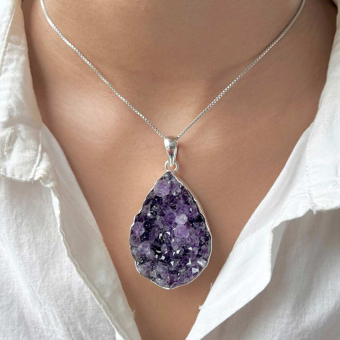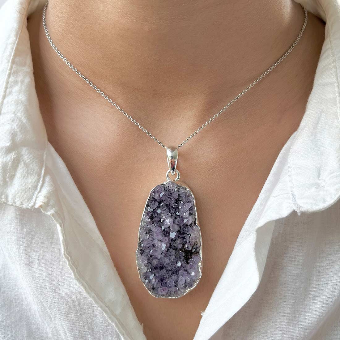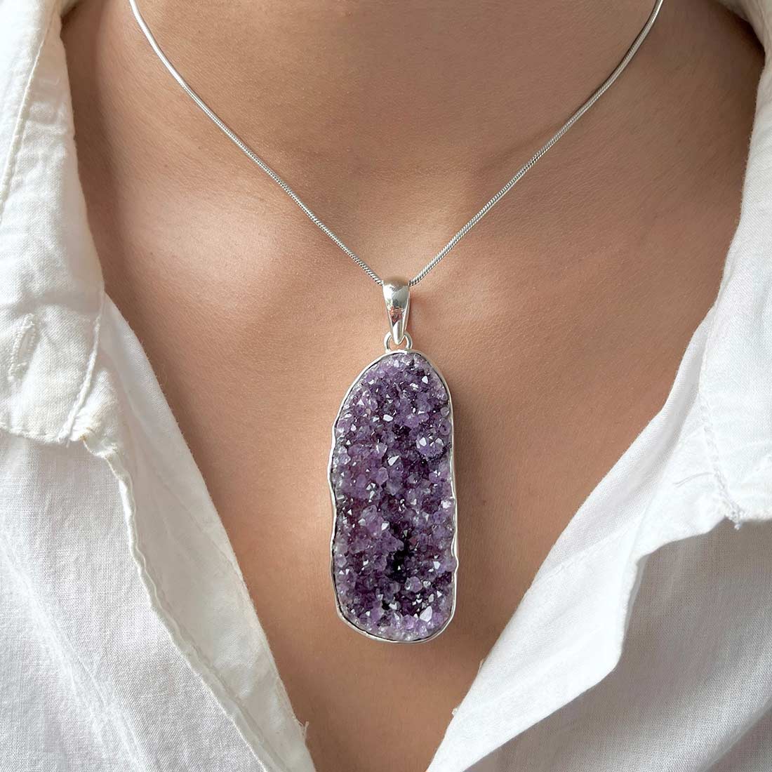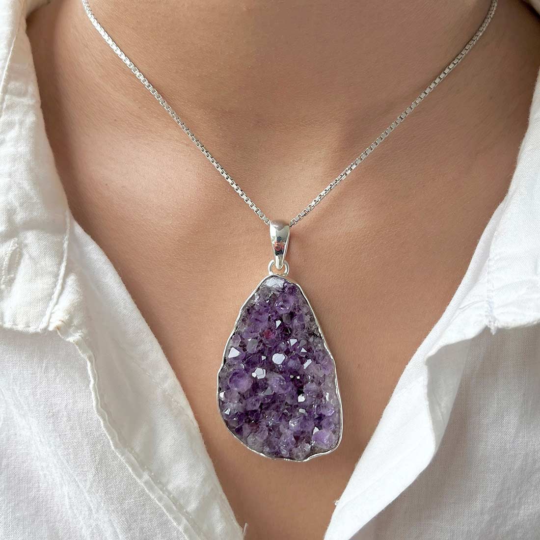 Pendants - the minimalist kind of jewelry. Pendants are the love for ladies. Gifting a classy pendant to your lady love seems like decorating your house with orchids on the occasion of your marriage anniversary. Well, we all know for women, jewelry is love. A single bracelet, ring, or even a pair of earrings can change the whole look. And these accessories capture the shine of eyes more effectively. Even going for a casual office meeting, a woman might forget their makeup but never forgets to style her hair and carry a jewelry piece. And a simple pair of gemstone earrings can add more sparkle to any look. So, let's analyze the deepness of the statement amethyst druzy pendant.
