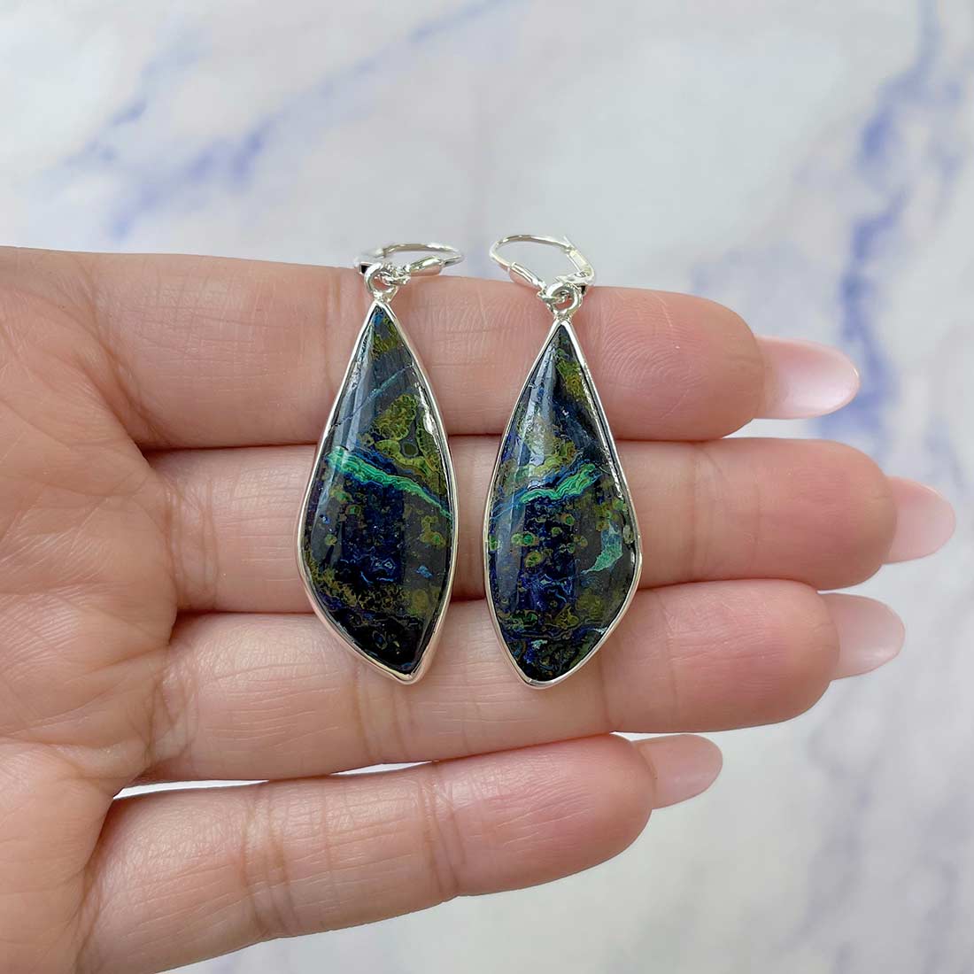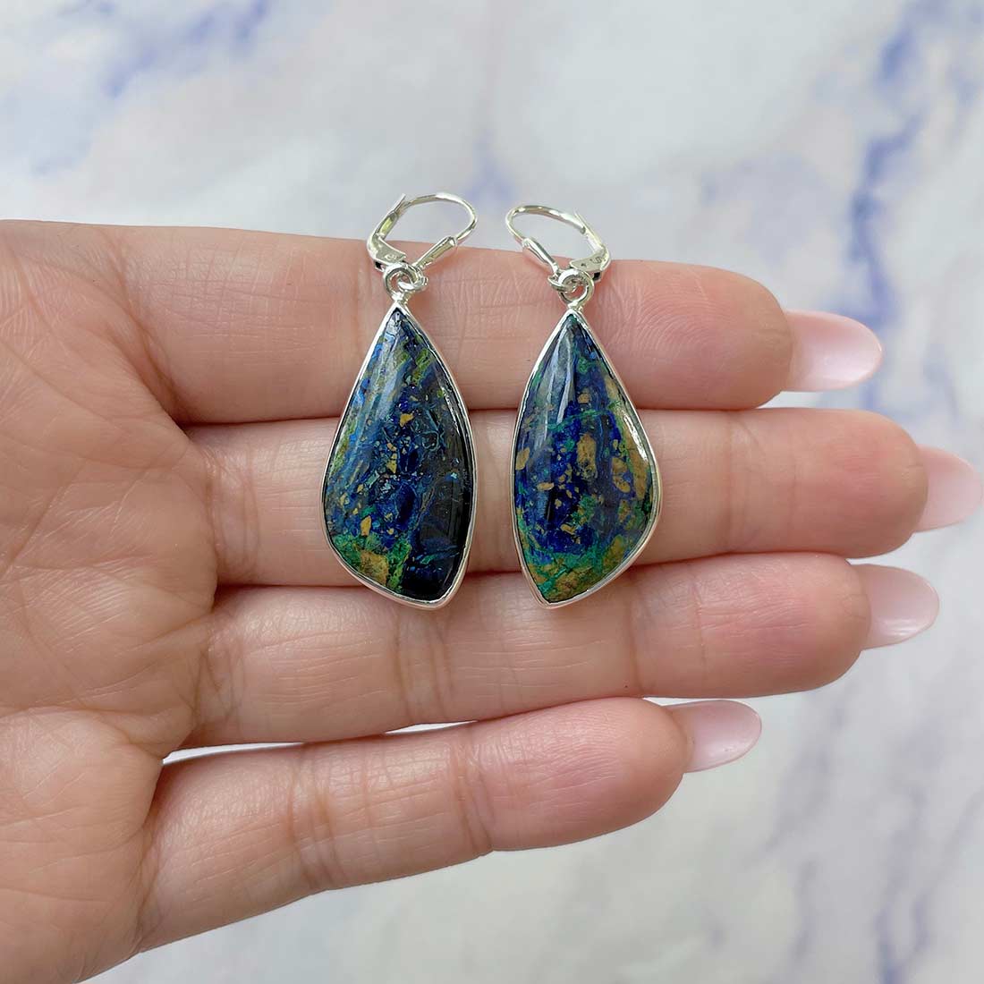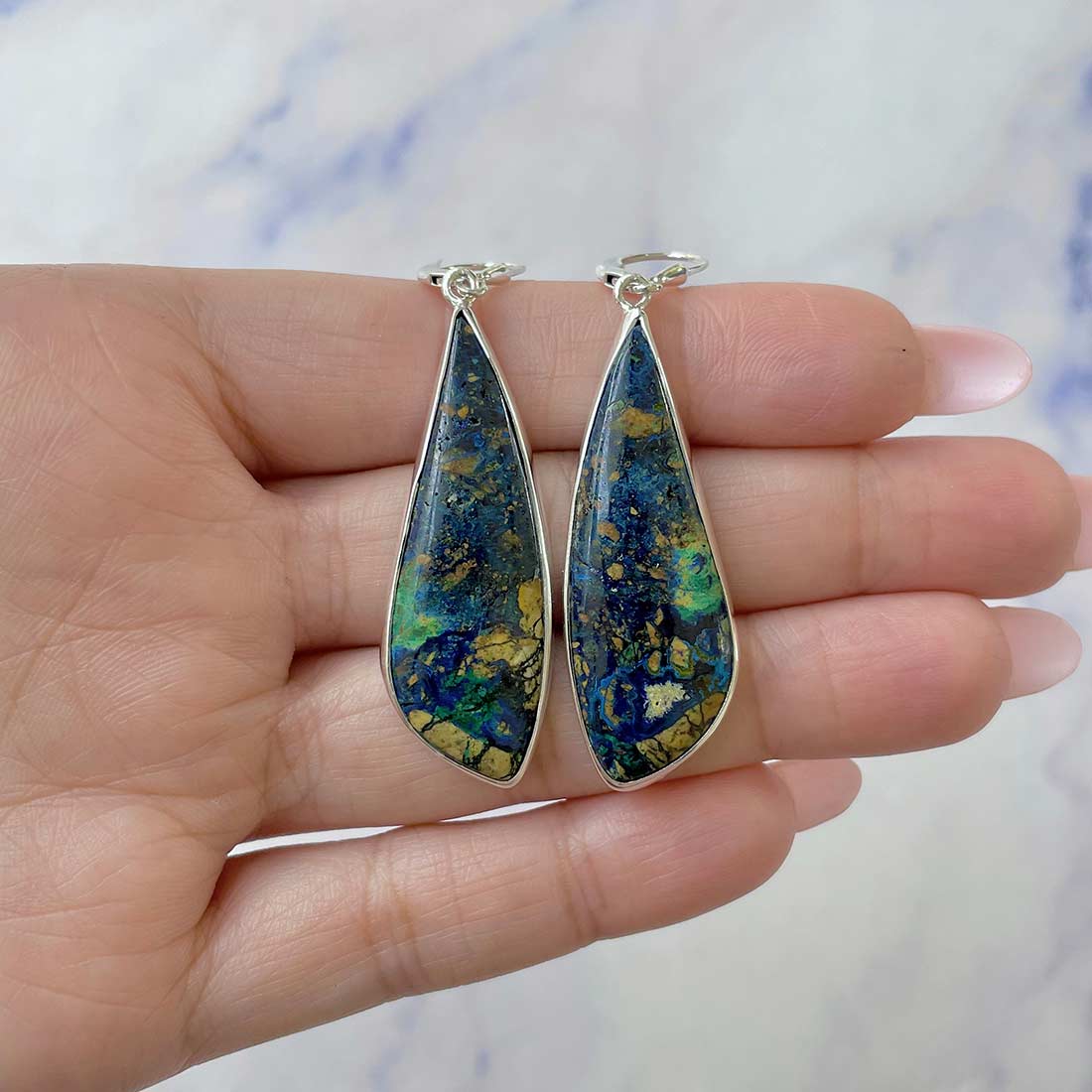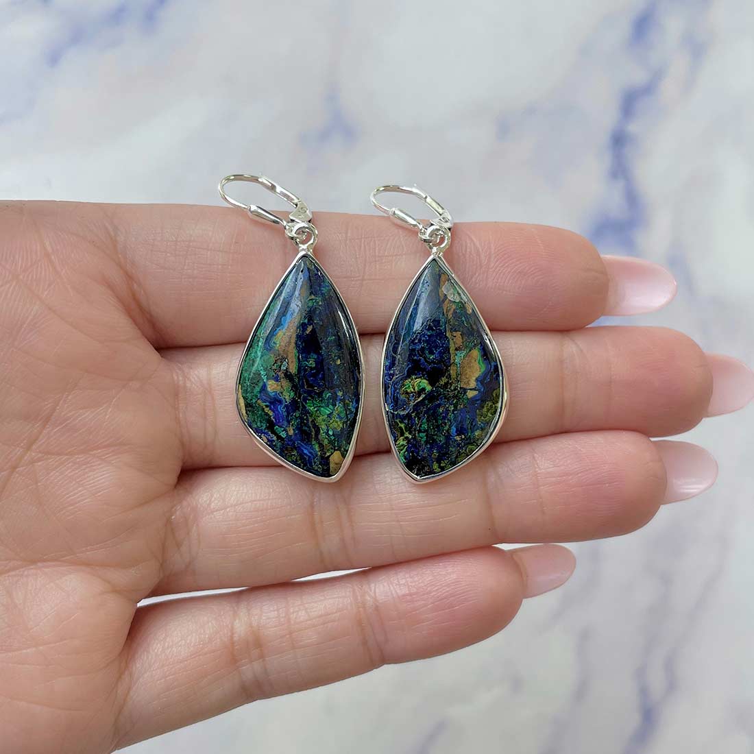Create a contrasting look with the appealing blend of azurite and malachite in statement earrings, which will give both an elegant and dramatic look. The intense blue shades of the azurite are well complemented by the vibrant green shades of the malachite, which results in a captivating visual display that is sure to turn heads. Azurite malachite earrings, when curated in sterling silver, add one more layer of luxury and grace because the setting of the metal not only enhances the beauty of the crystal but also provides a striking frame that captures the attention of the intricacy of the gemstones.