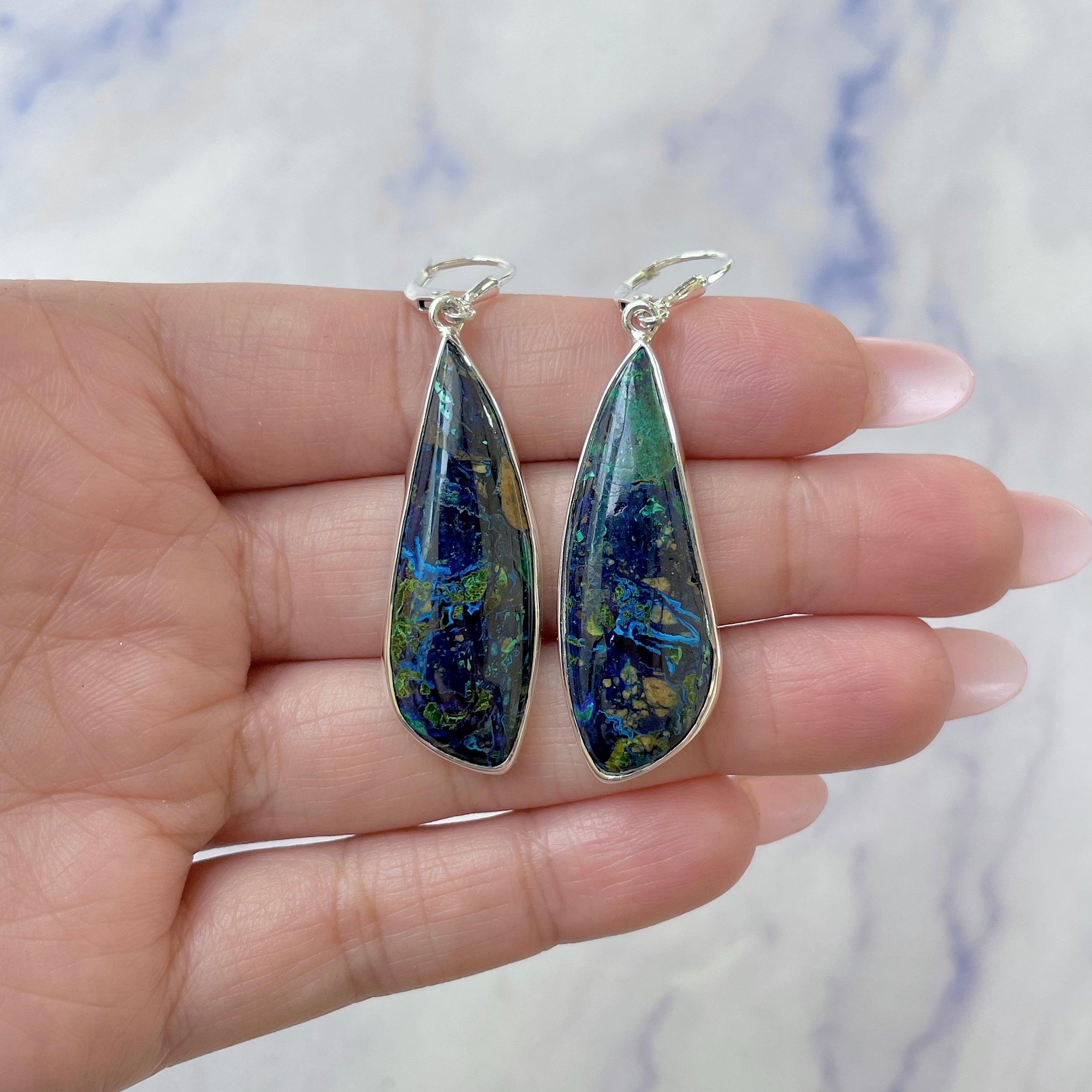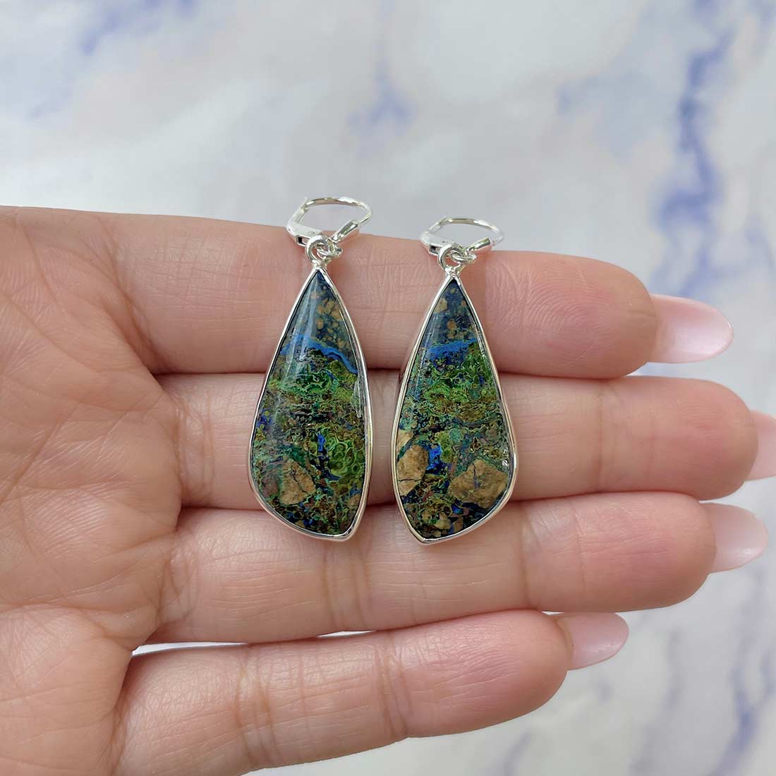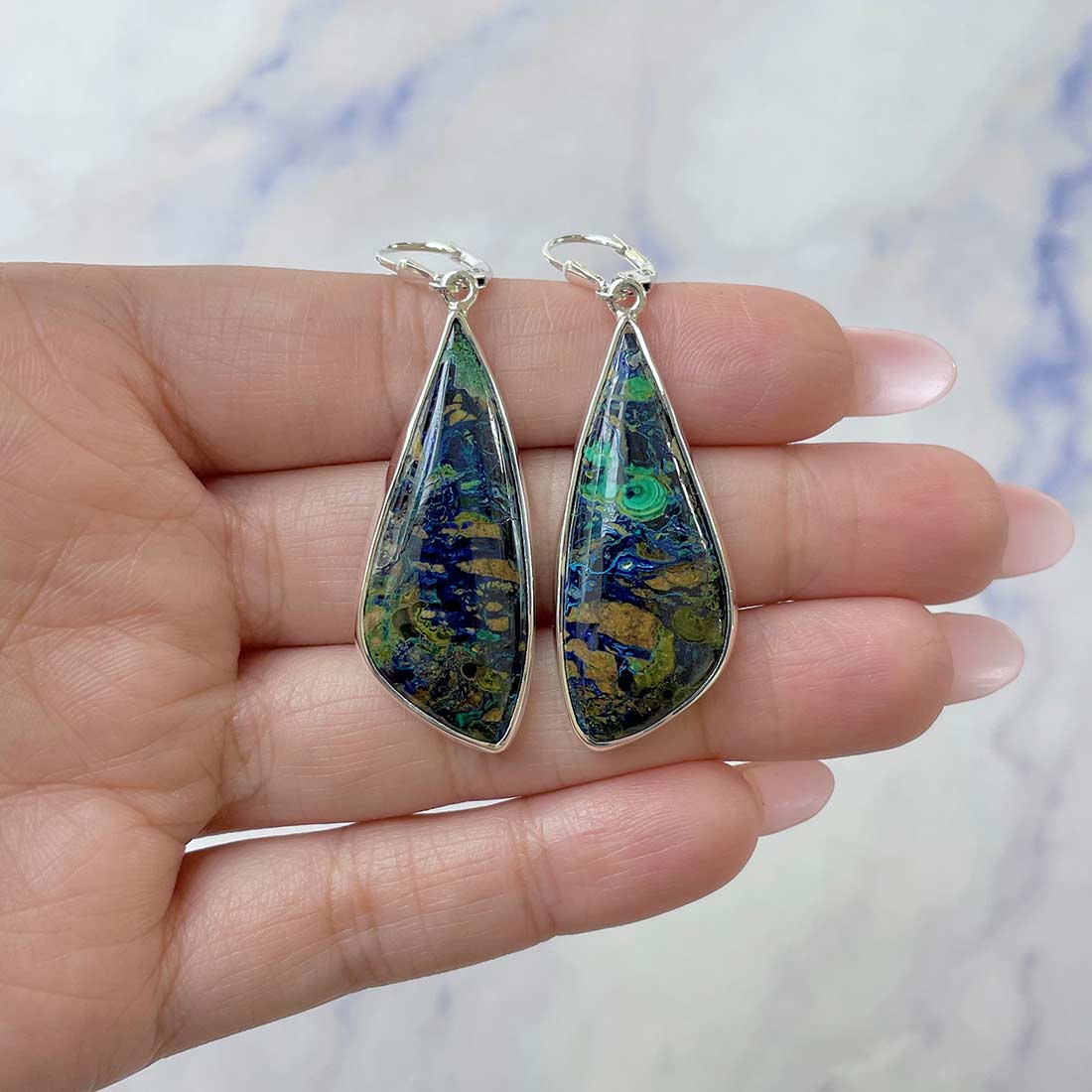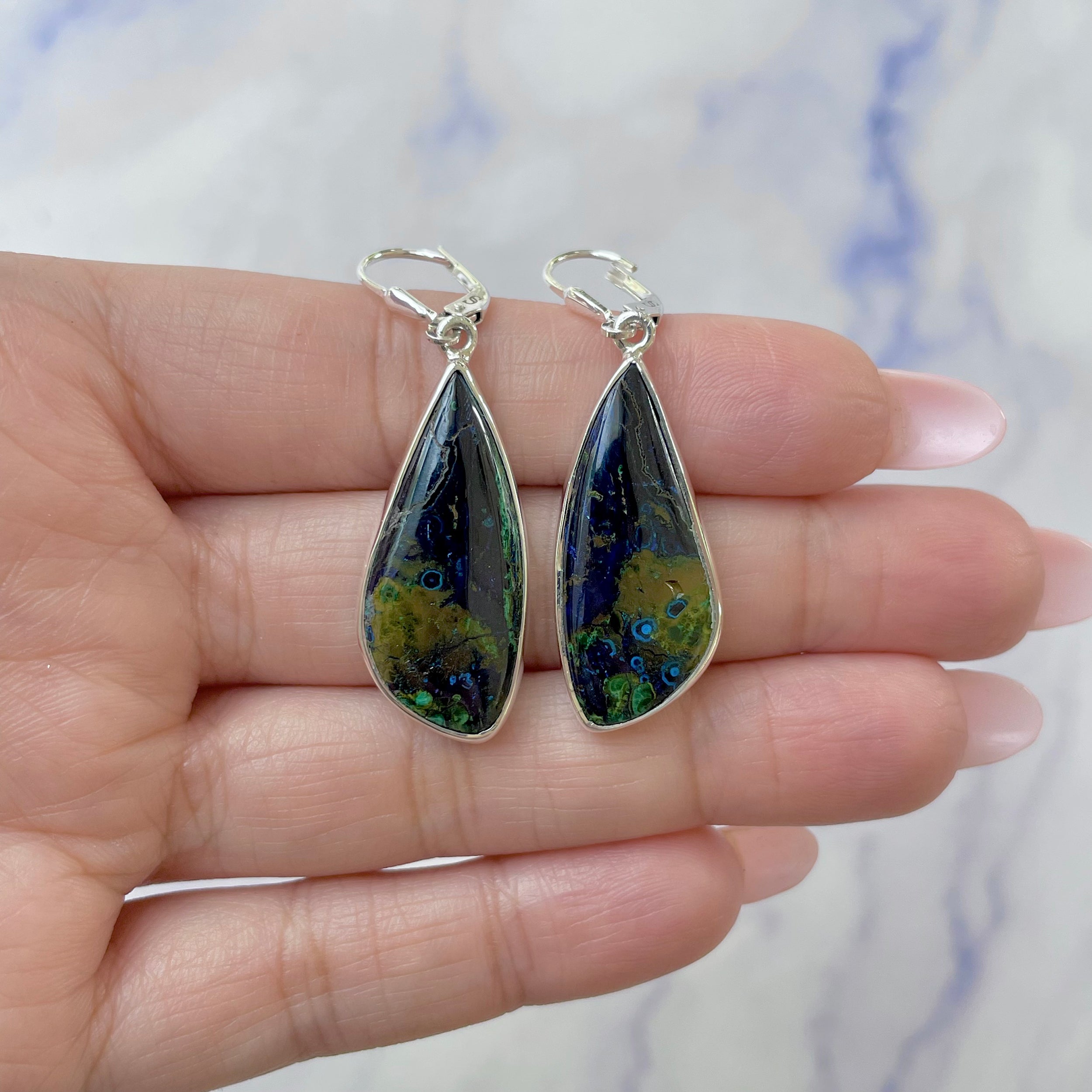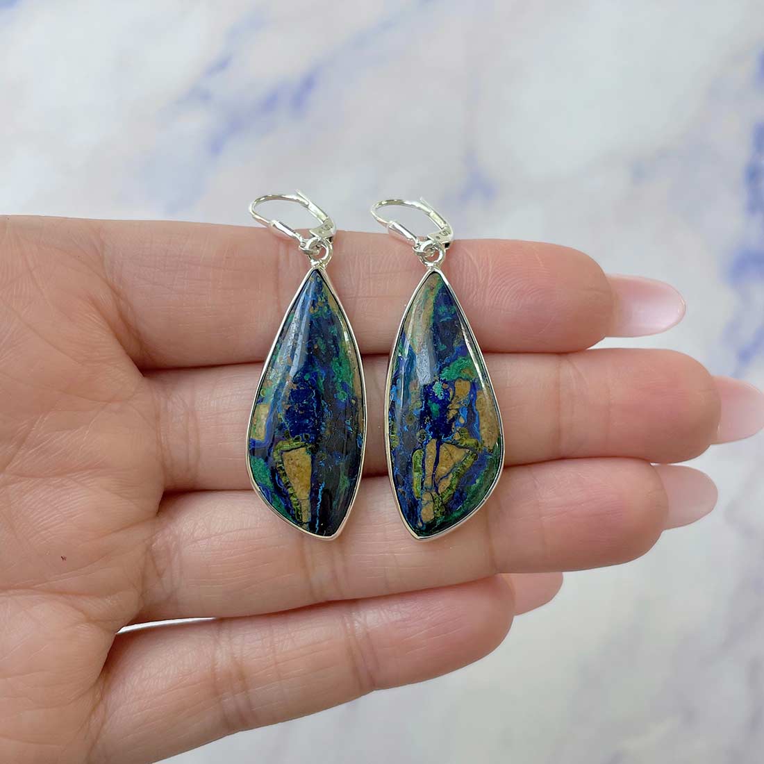 Create a contrasting look with the appealing blend of azurite and malachite in statement earrings, which will give both an elegant and dramatic look. The intense blue shades of the azurite are well complemented by the vibrant green shades of the malachite, which results in a captivating visual display that is sure to turn heads. Azurite malachite earrings, when curated in sterling silver, add one more layer of luxury and grace because the setting of the metal not only enhances the beauty of the crystal but also provides a striking frame that captures the attention of the intricacy of the gemstones.