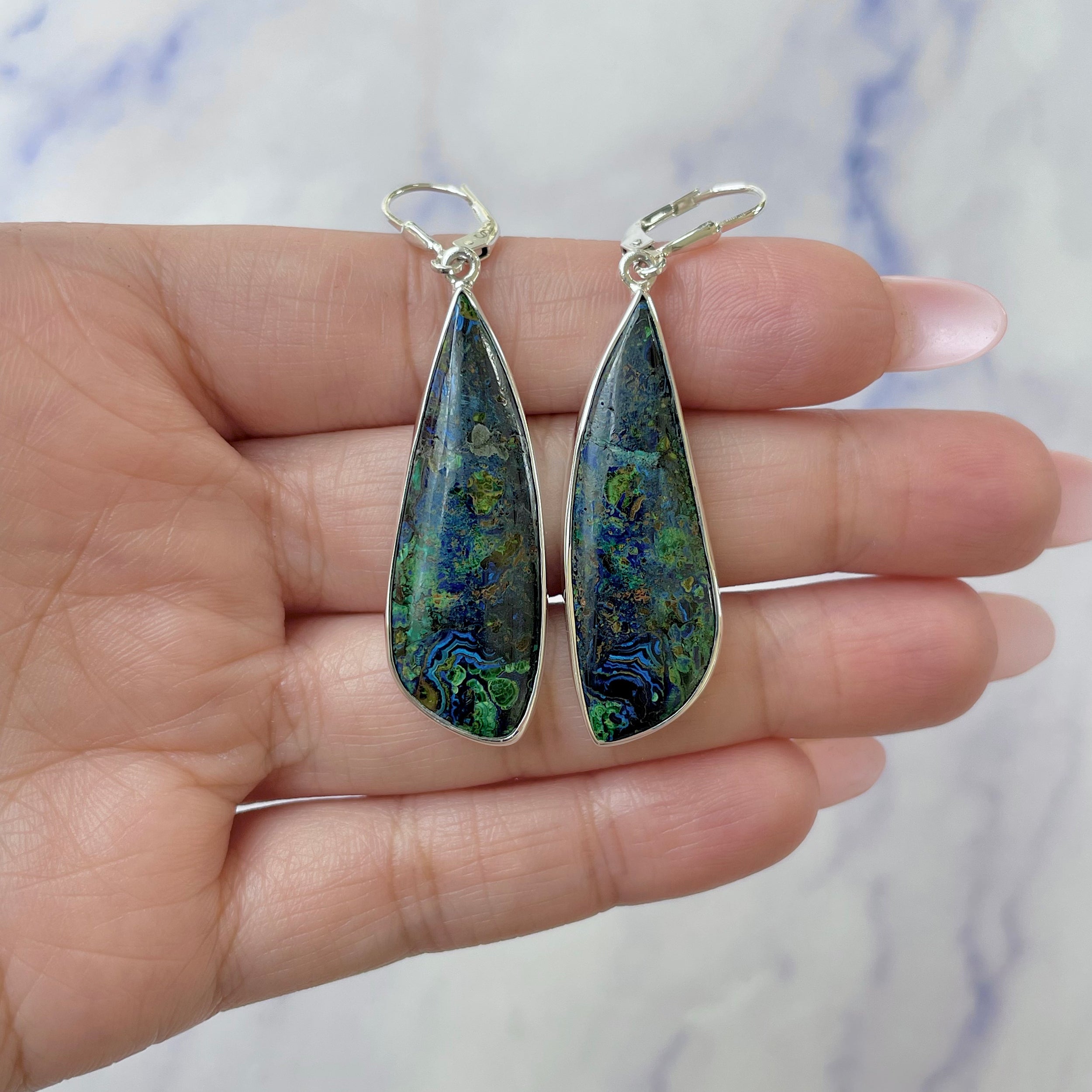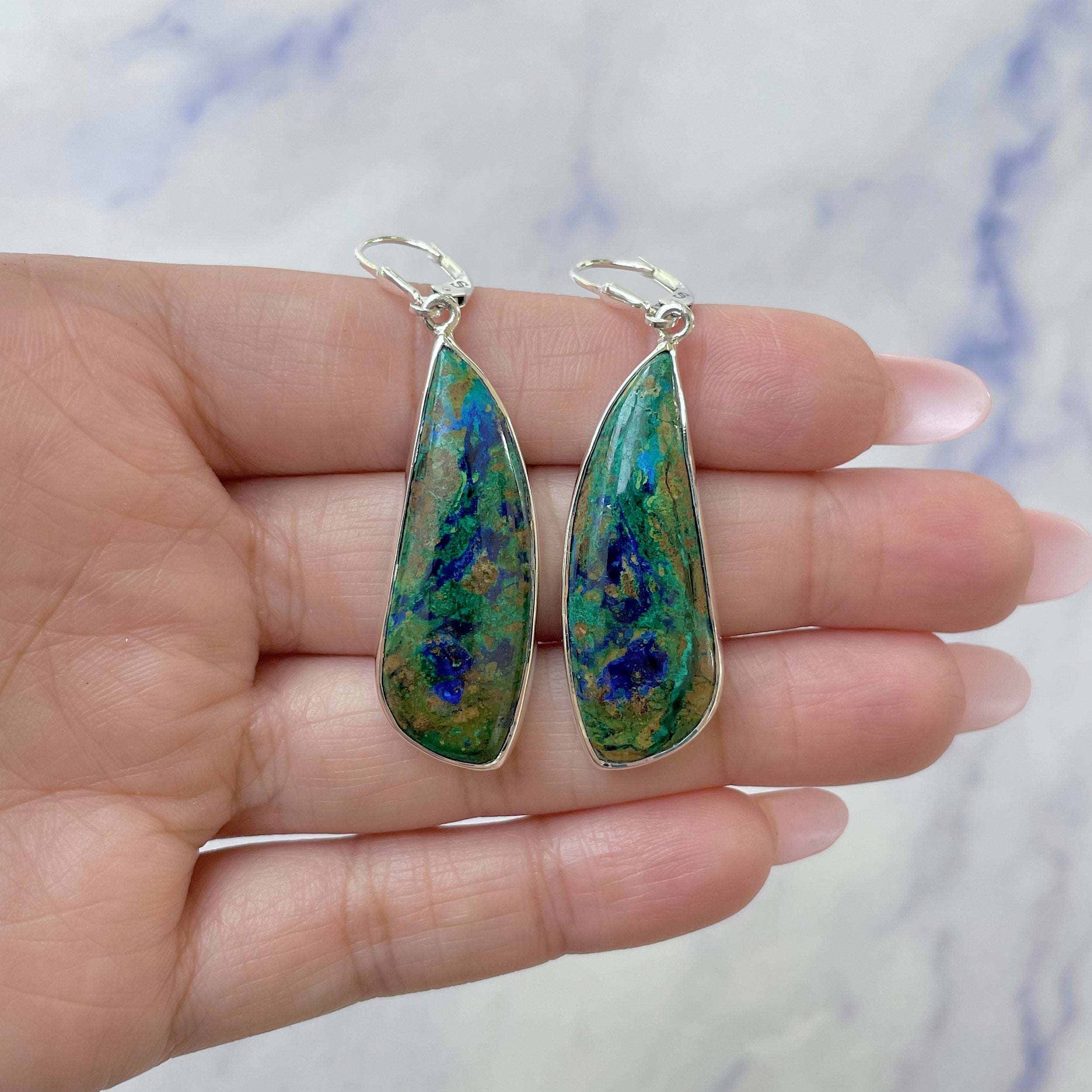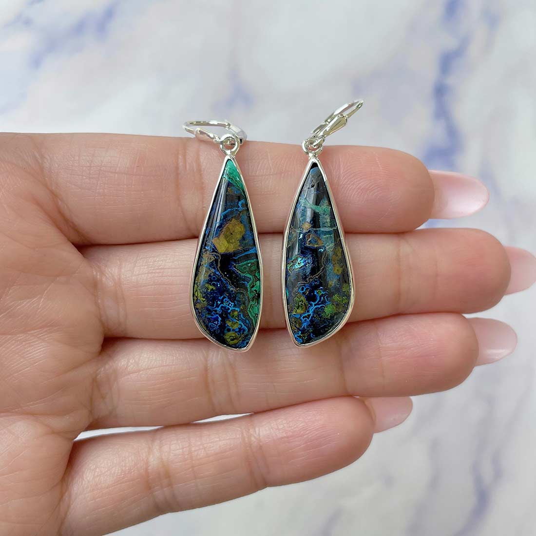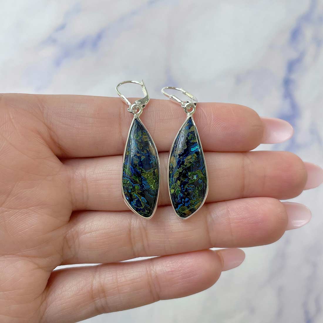 Create a contrasting look with the appealing blend of azurite and malachite in statement earrings, which will give both an elegant and dramatic look. The intense blue shades of the azurite are well complemented by the vibrant green shades of the malachite, which results in a captivating visual display that is sure to turn heads. Azurite malachite earrings, when curated in sterling silver, add one more layer of luxury and grace because the setting of the metal not only enhances the beauty of the crystal but also provides a striking frame that captures the attention of the intricacy of the gemstones.