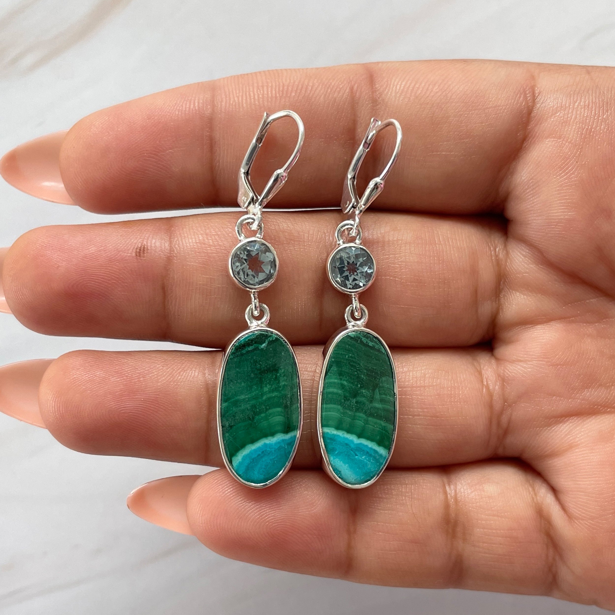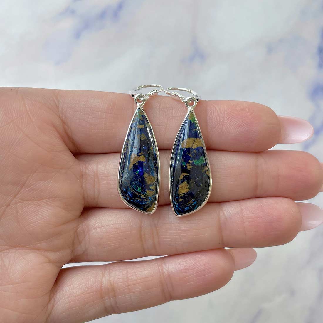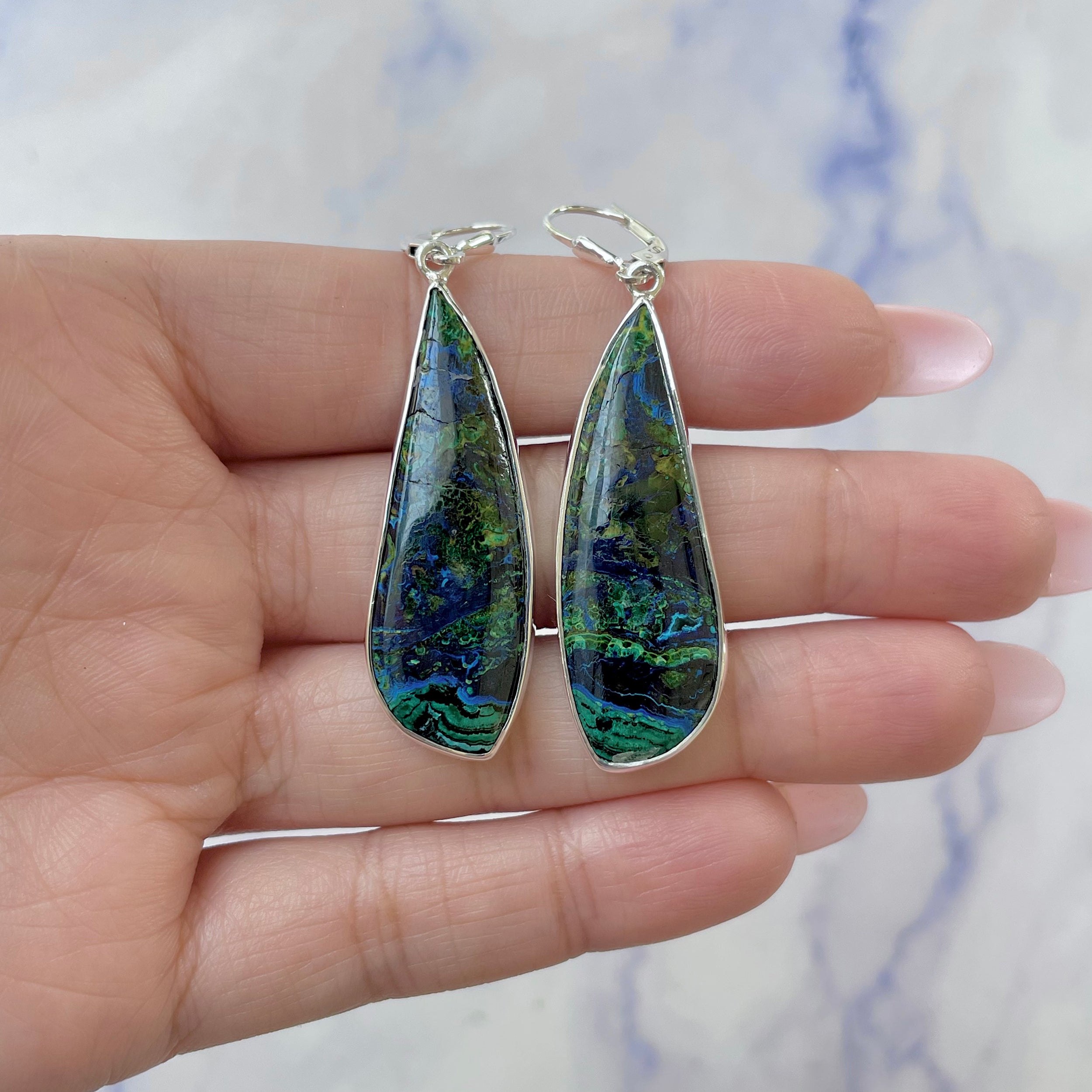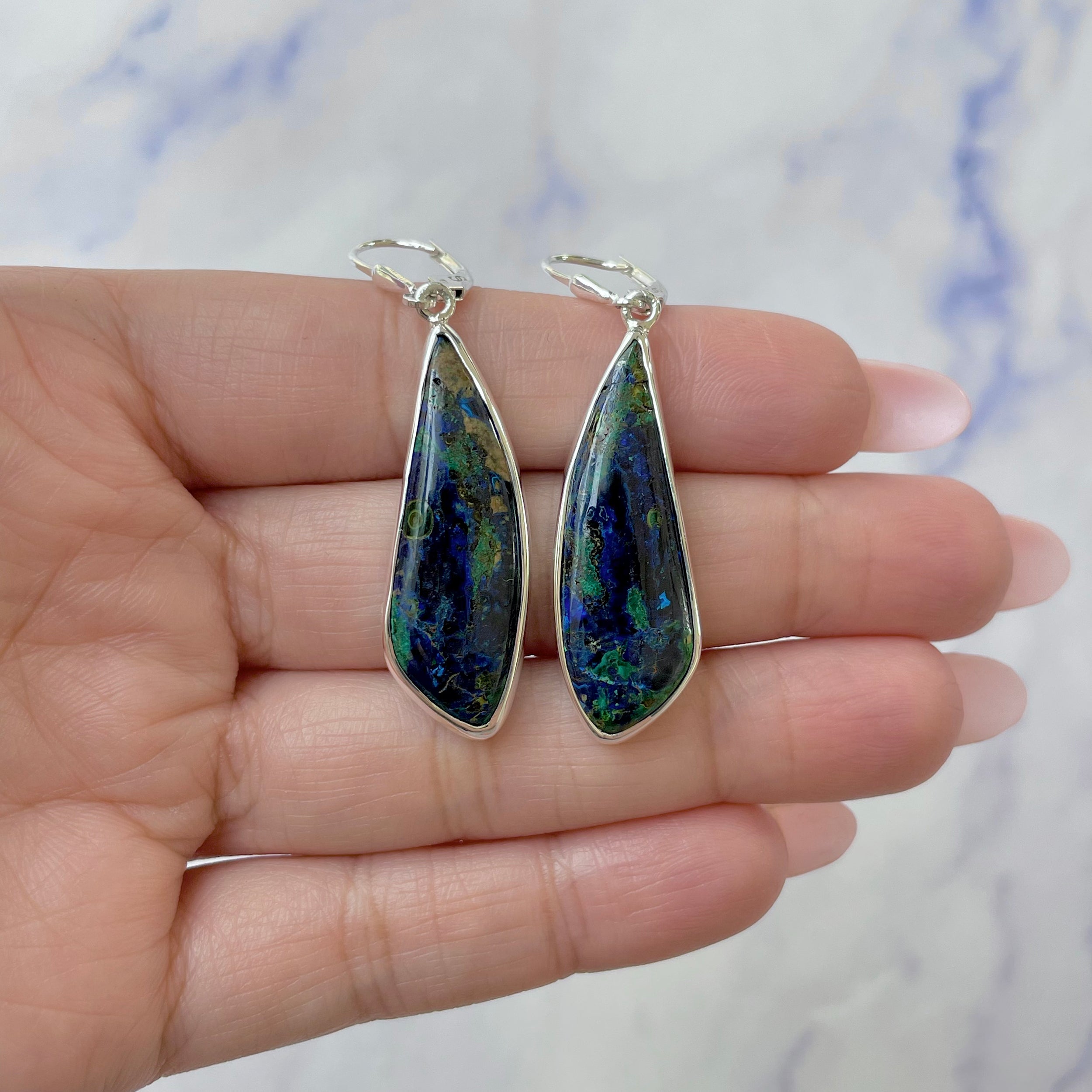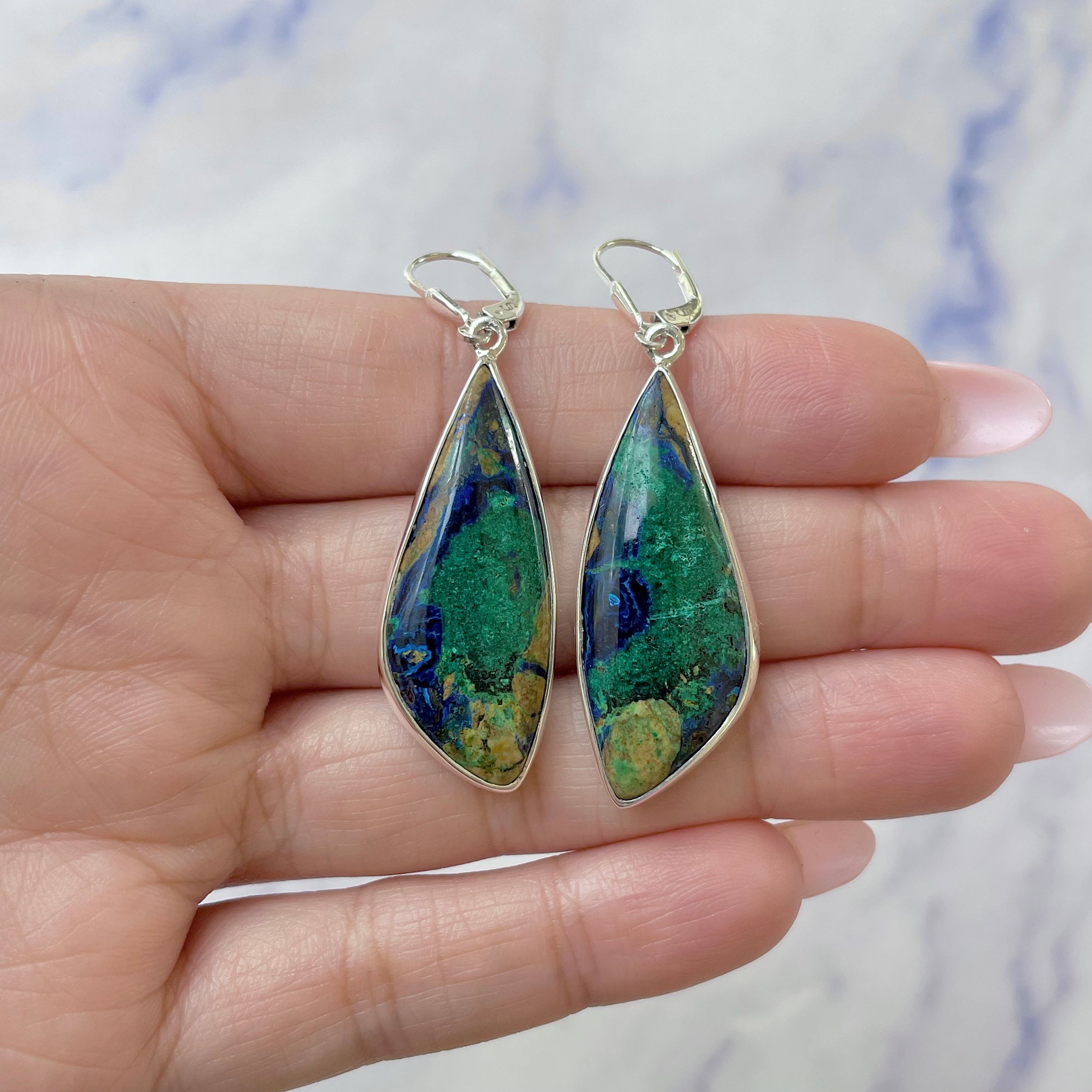 Create a contrasting look with the appealing blend of azurite and malachite in statement earrings, which will give both an elegant and dramatic look. The intense blue shades of the azurite are well complemented by the vibrant green shades of the malachite, which results in a captivating visual display that is sure to turn heads. Azurite malachite earrings, when curated in sterling silver, add one more layer of luxury and grace because the setting of the metal not only enhances the beauty of the crystal but also provides a striking frame that captures the attention of the intricacy of the gemstones.