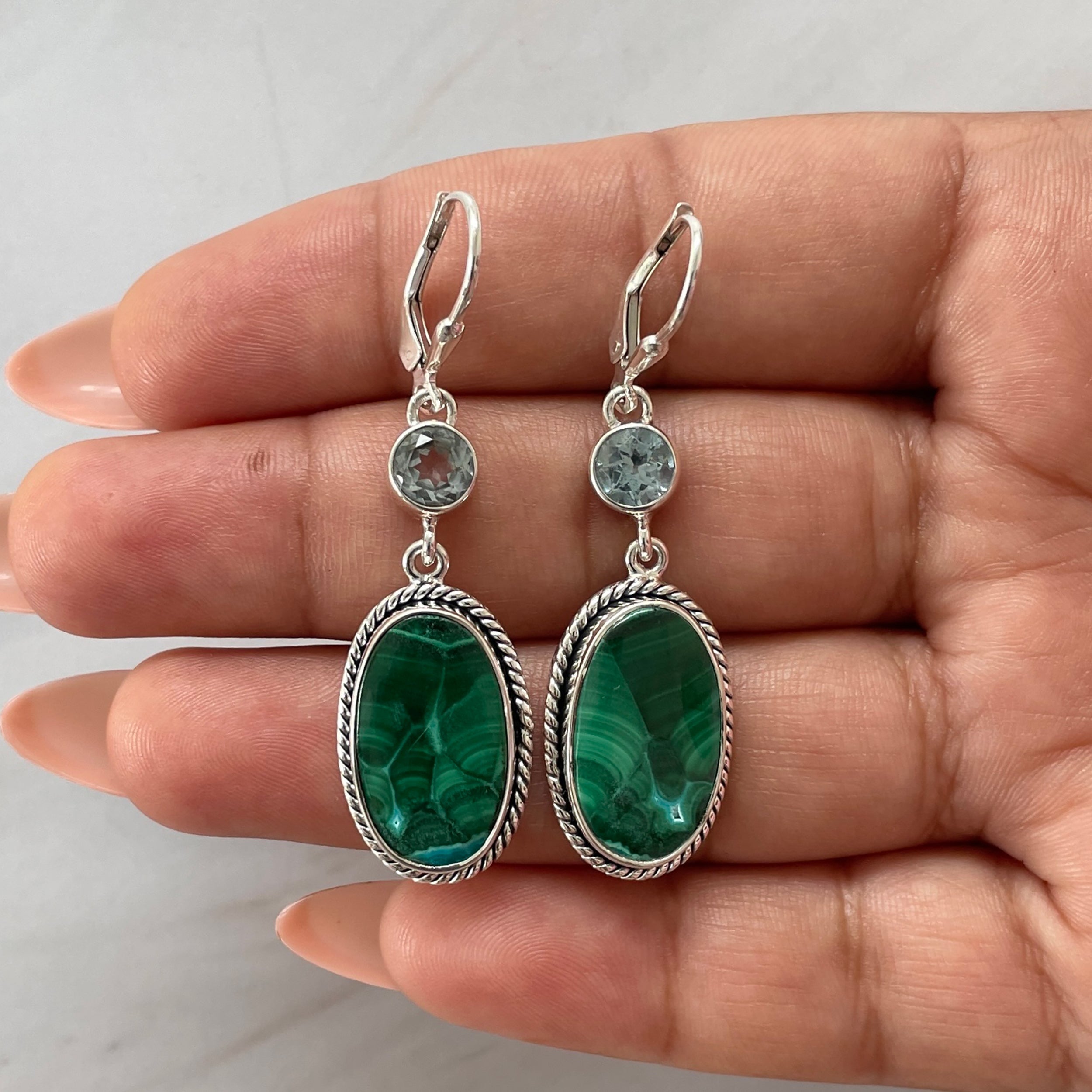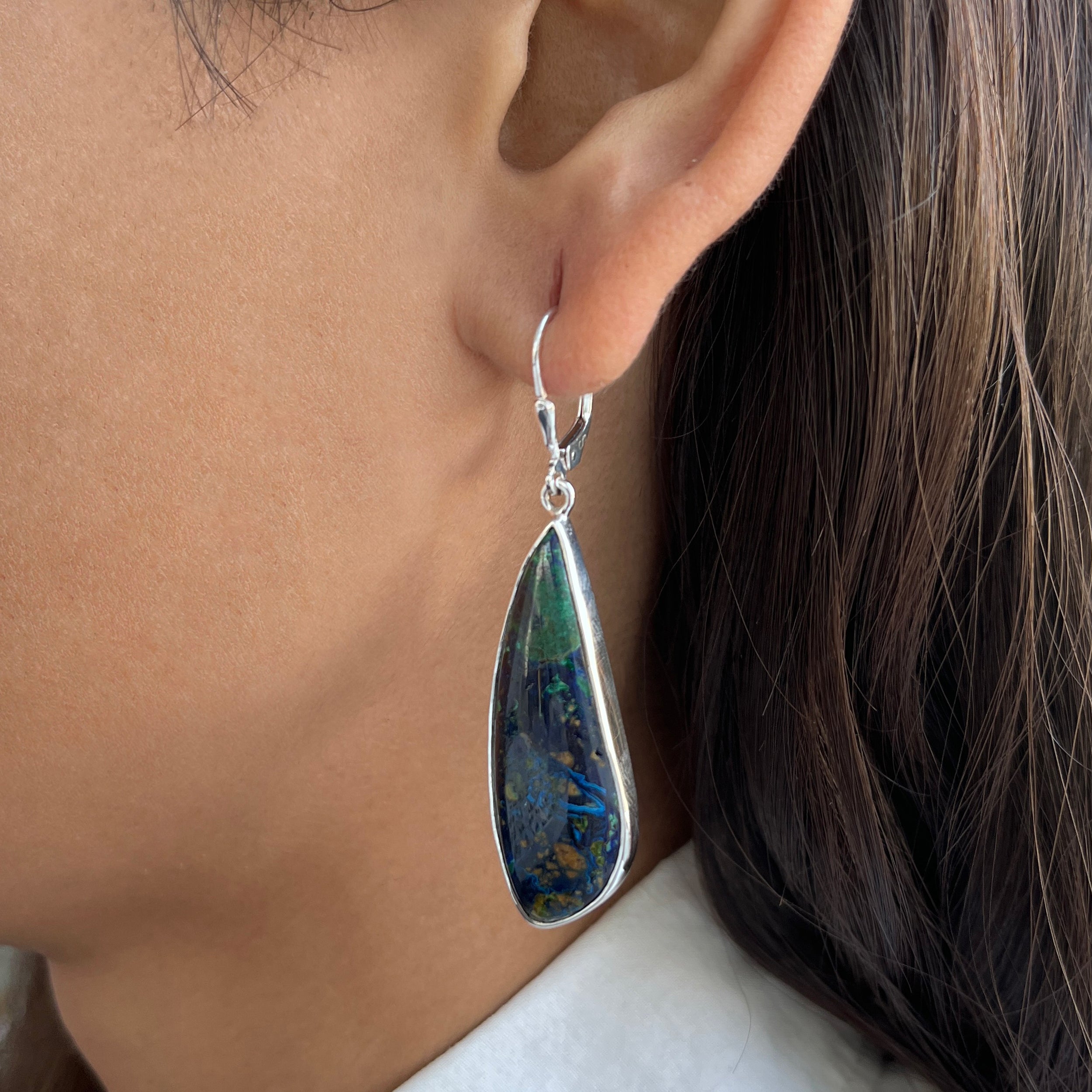 Whether complementing a classic white blouse and tailored trousers or adding a pop of color to a sophisticated black dress, the earrings bring a distinctive and artisanal flair to a polished ensemble. Remember one more thing, when wearing azurite malachite statement earrings, it's best to keep the rest of the jewelry minimal to allow the earrings to take center stage. A simple pendant or bracelet can complement the earrings without overpowering them, ensuring that all eyes remain on the captivating azurite malachite earrings.