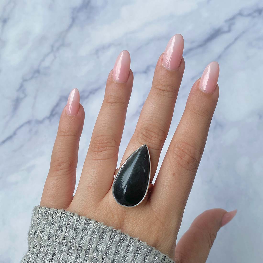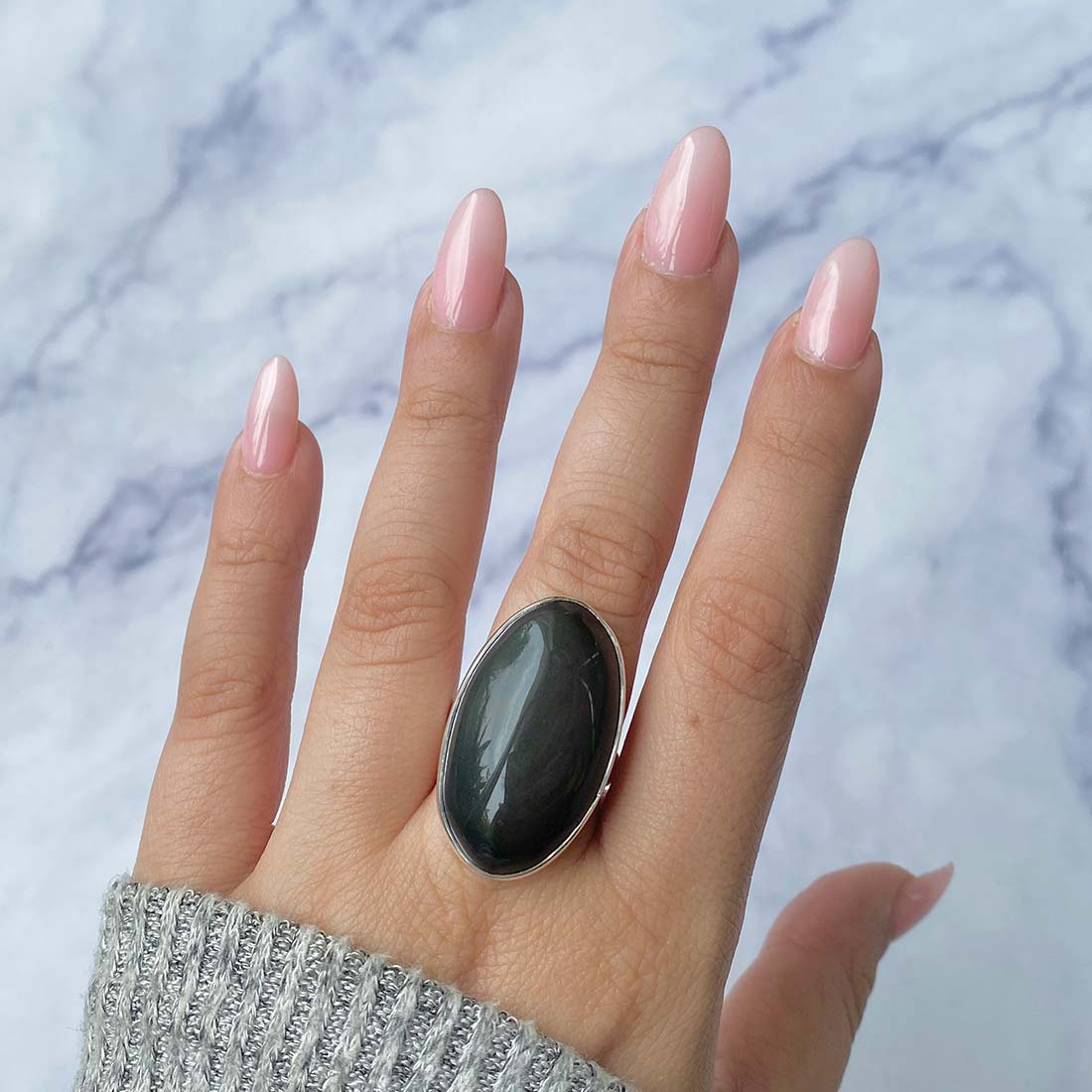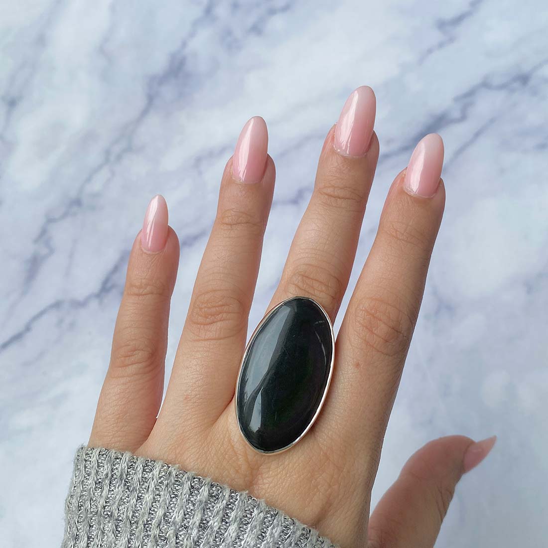 A classic and enticing Black Obsidian crystal that creates a striking appearance with its glossy and lustrous, rich, deep black shade. Whether you want to be in the limelight or are just willing to add a touch of attitude and boldness, a graceful Black Obsidian ring can be your perfect beauty partner.  Layering it with other delicate silver or gold bands will give you edgy, outgoing, bohemian vibes with a stylish touch. Let's find out more about Black Obsidian here.