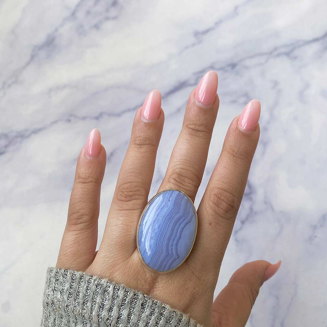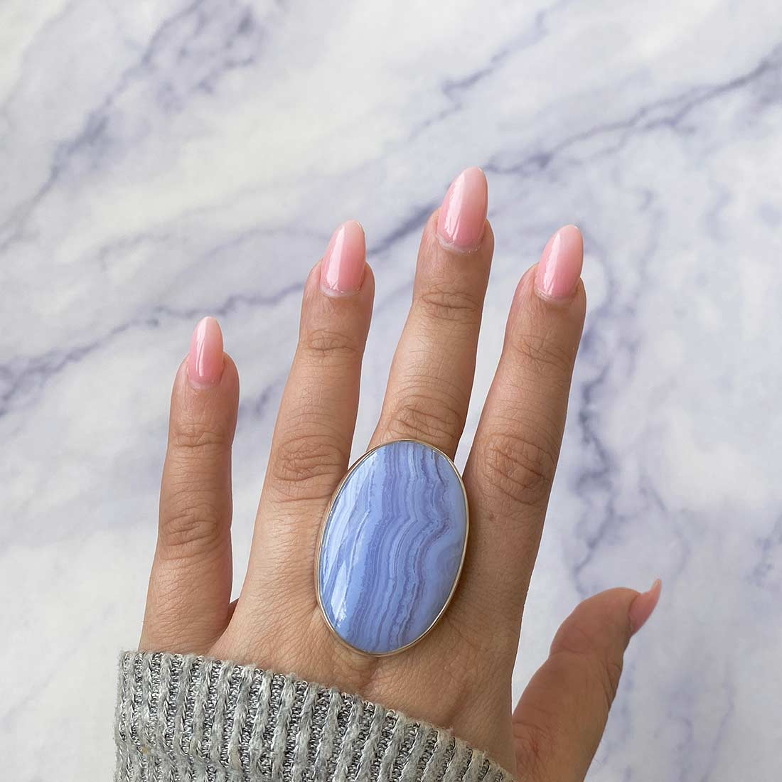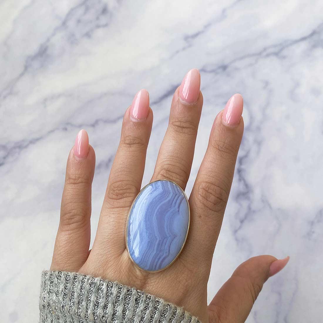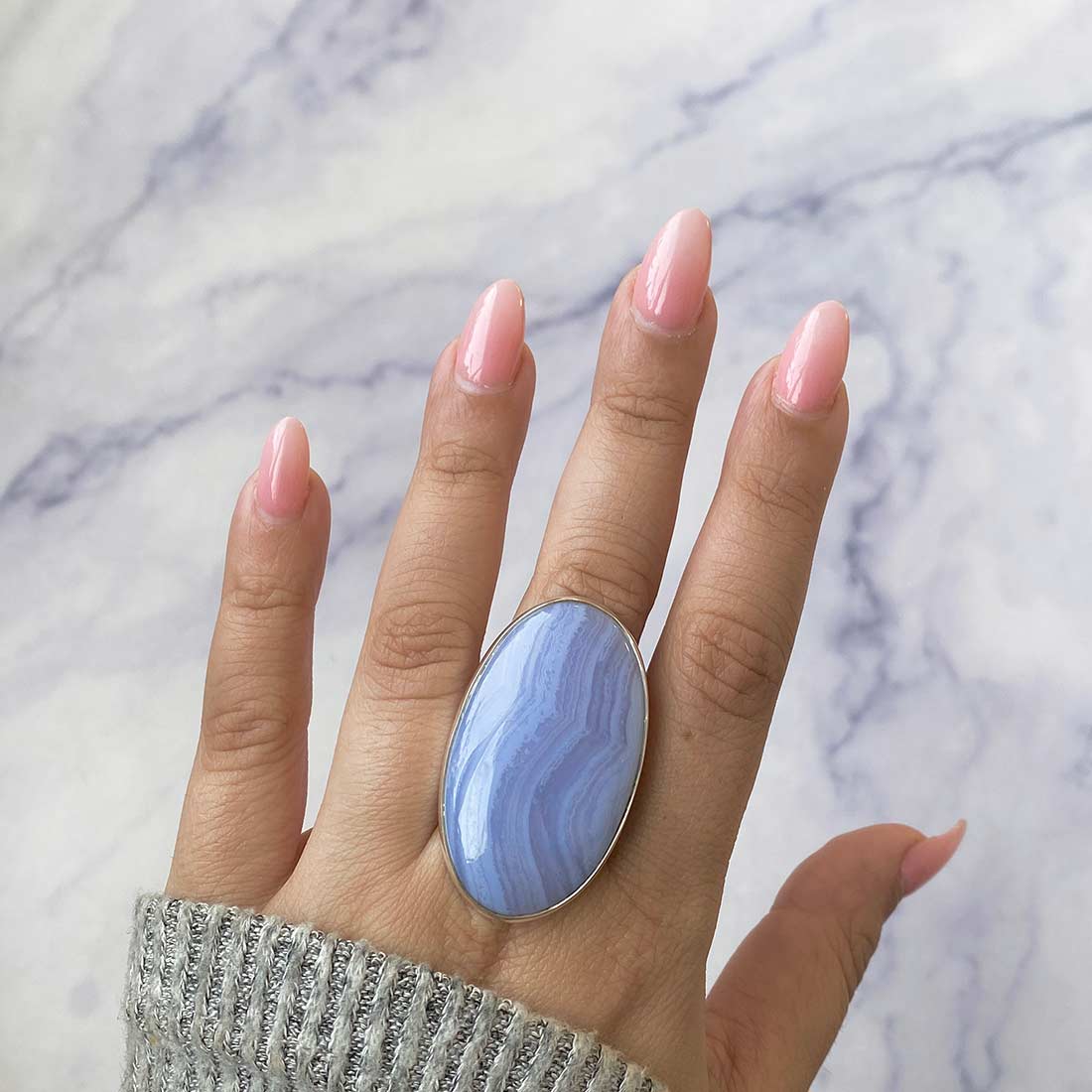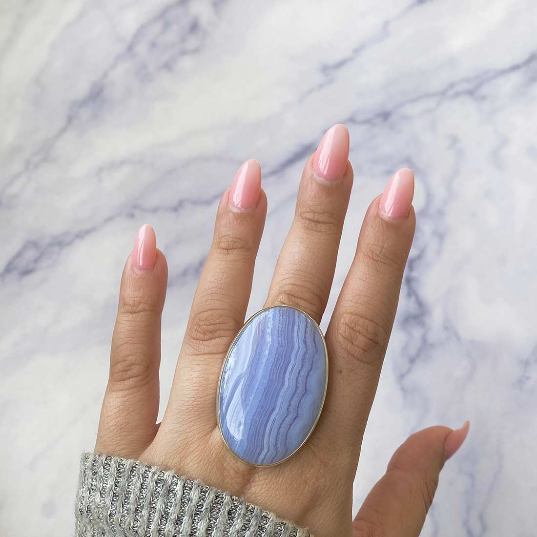 Adding a statement ring to an outfit can instantly transform our whole look, and there is no debate about it. Whether made from gold, silver, pearls, or charming colorful crystals, a dazzling, stylish statement ring is the most alluring way to register our presence at an event, as it significantly draws attention and adds a bit of color to our plain personality. If you know how to style your statement gemstone rings mindfully, you can elevate your whole dress to a more glamorous level. If you are a fan of gemstones or looking for an ideal crystal to add a touch of class and sophistication to an outfit, gorgeous Blue Lace Agate rings can definitely make your desires come true. Layering or stacking your rings with silver or gold dainty bands is also an added benefit to creating a more dramatic or bohemian look.