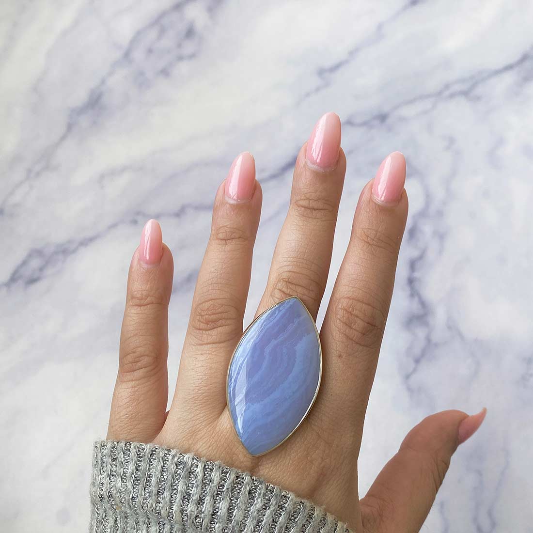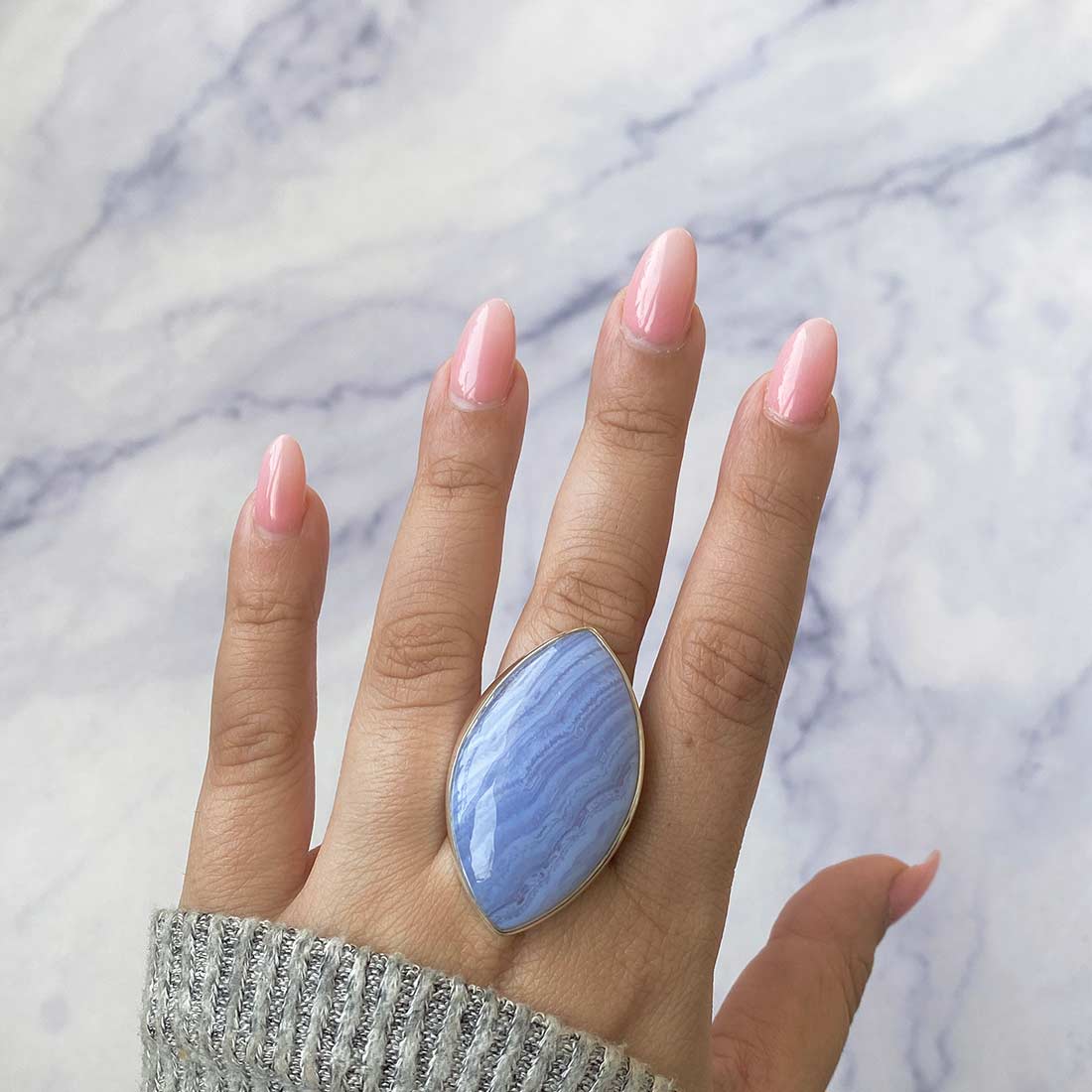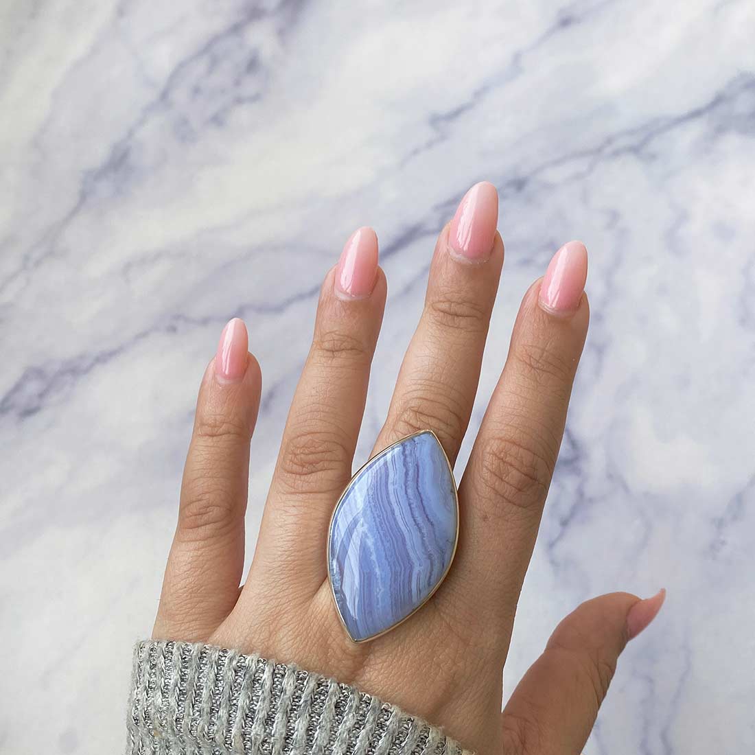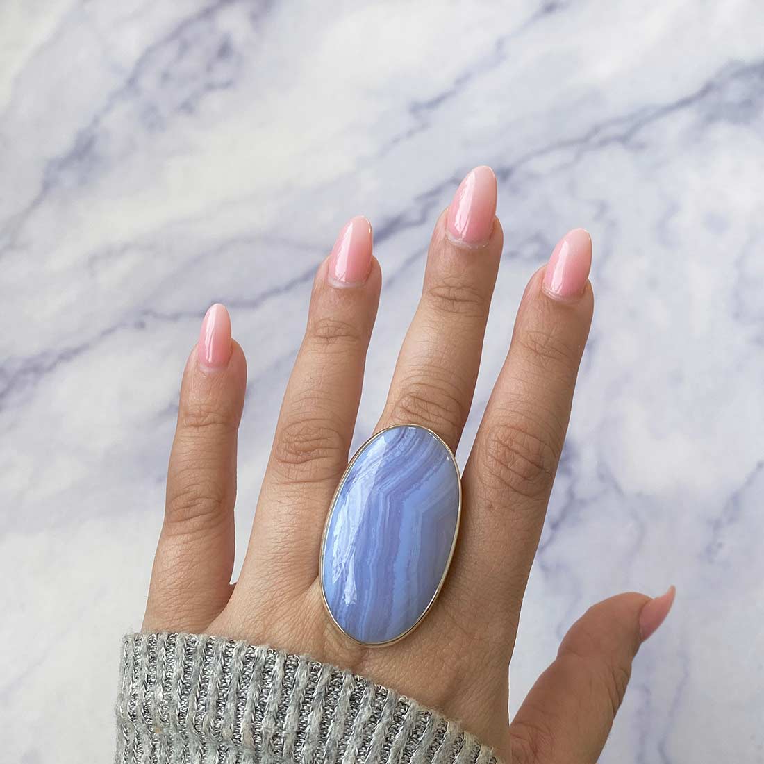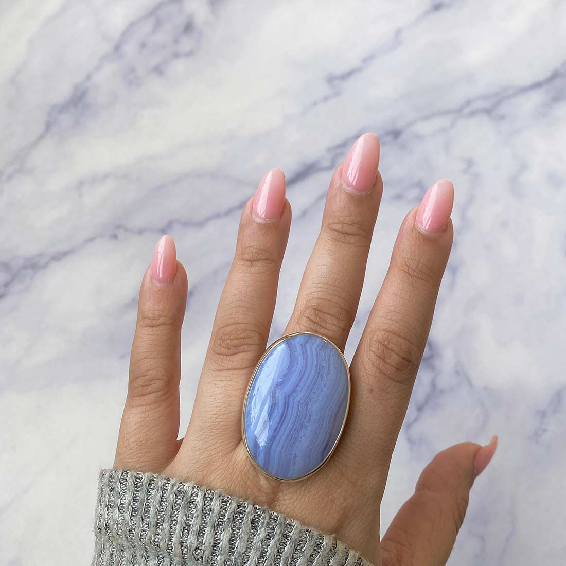 Adding a statement ring to an outfit can instantly transform our whole look, and there is no debate about it. Whether made from gold, silver, pearls, or charming colorful crystals, a dazzling, stylish statement ring is the most alluring way to register our presence at an event, as it significantly draws attention and adds a bit of color to our plain personality. If you know how to style your statement gemstone rings mindfully, you can elevate your whole dress to a more glamorous level. If you are a fan of gemstones or looking for an ideal crystal to add a touch of class and sophistication to an outfit, gorgeous Blue Lace Agate rings can definitely make your desires come true. Layering or stacking your rings with silver or gold dainty bands is also an added benefit to creating a more dramatic or bohemian look.