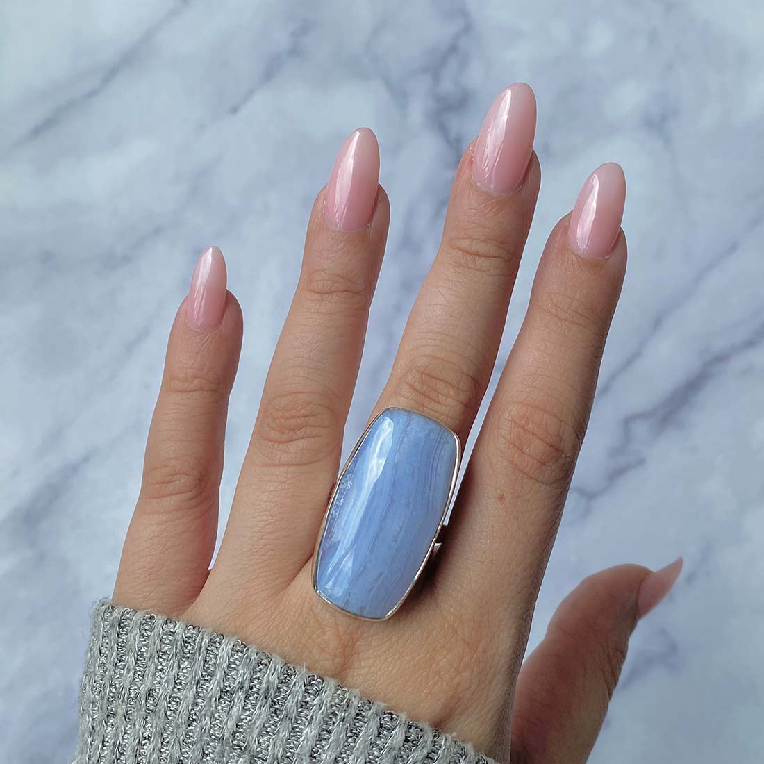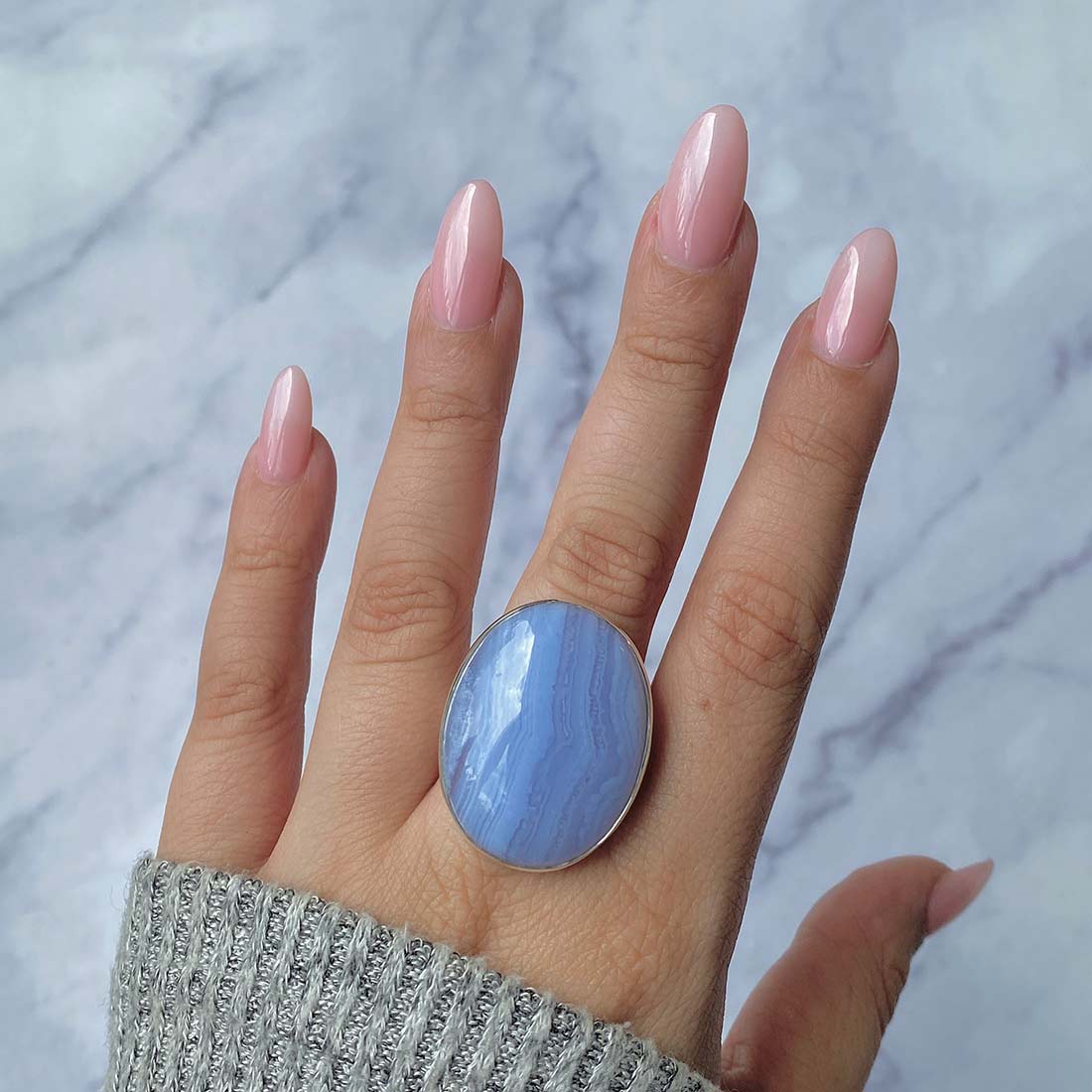 Adding a statement ring to an outfit can instantly transform our whole look, and there is no debate about it. Whether made from gold, silver, pearls, or charming colorful crystals, a dazzling, stylish statement ring is the most alluring way to register our presence at an event, as it significantly draws attention and adds a bit of color to our plain personality. If you know how to style your statement gemstone rings mindfully, you can elevate your whole dress to a more glamorous level. If you are a fan of gemstones or looking for an ideal crystal to add a touch of class and sophistication to an outfit, gorgeous Blue Lace Agate rings can definitely make your desires come true. Layering or stacking your rings with silver or gold dainty bands is also an added benefit to creating a more dramatic or bohemian look.