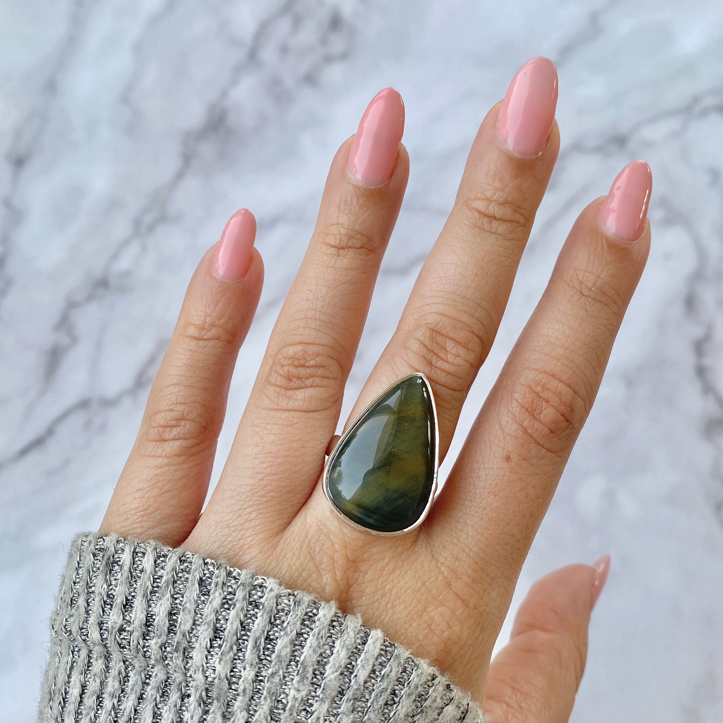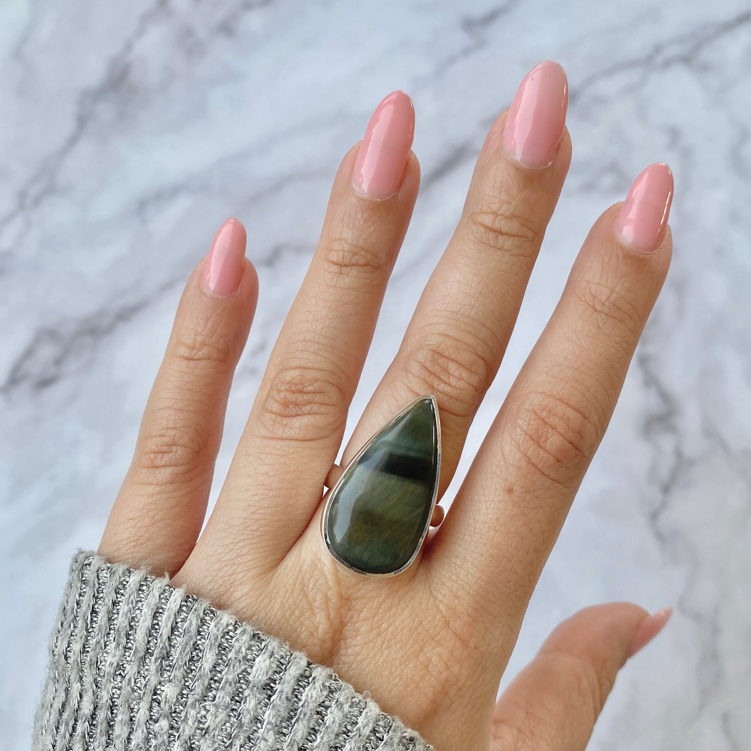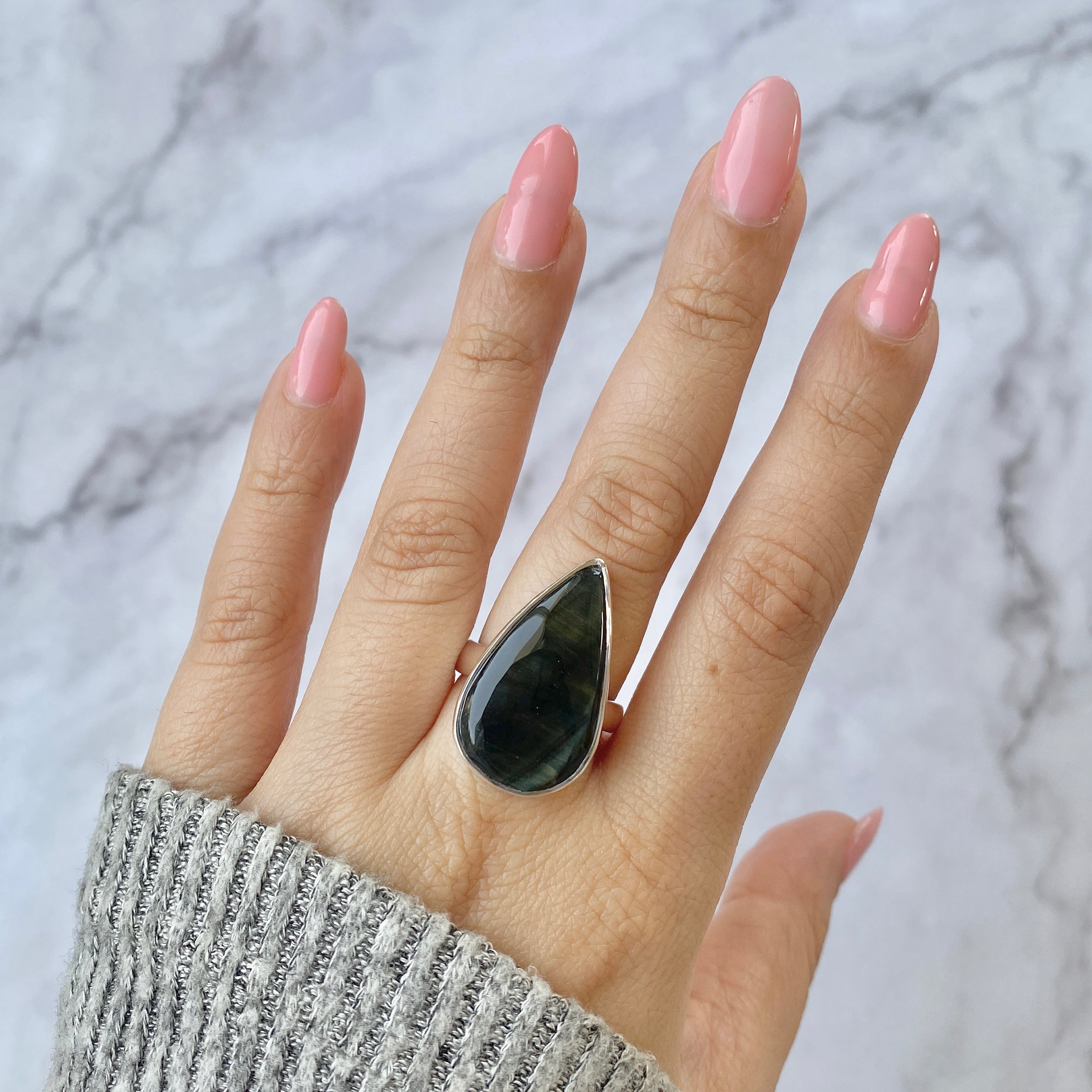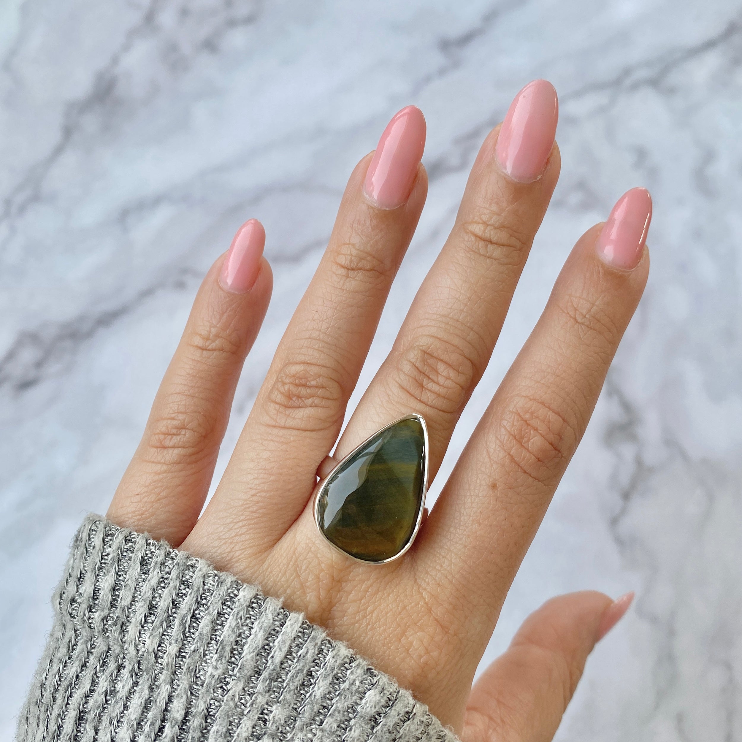 Blue Tiger Eye is a unique and beautiful variety of Tiger eye stone. It is favored for its beautiful blue hue and its stunning appearance. Blue Tiger eye is known as a versatile stone for everyday jewelry, such as blue tiger eye rings and pendant wear, because of its Mohs hardness of 6-7 and silky luster. The color of this gemstone ranges from gorgeous oceanic colors, like greenish-blue, and because of its hues, it is full of calming hues, which makes it a perfect gemstone. This ring reminds wearers to remain calm and assertive despite life's obstacles, whether they choose to wear it for its aesthetic value or metaphysical advantages. Discover how the healing forces of nature and the beauty of nature mix harmoniously in the Blue Tiger Eye ring—a timeless gift for the spirit.