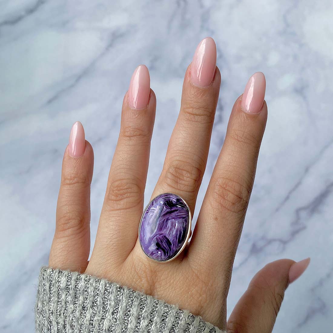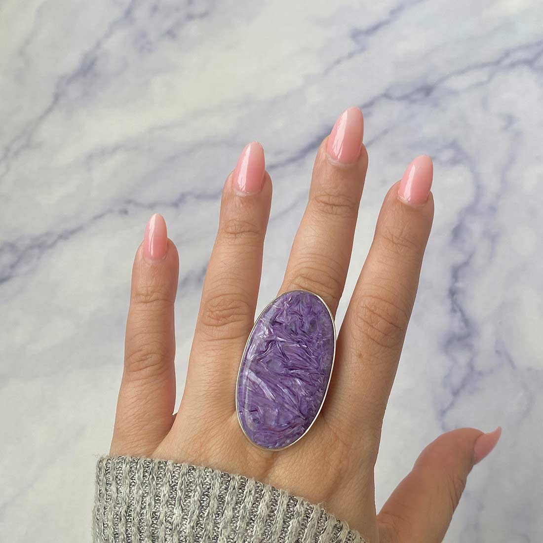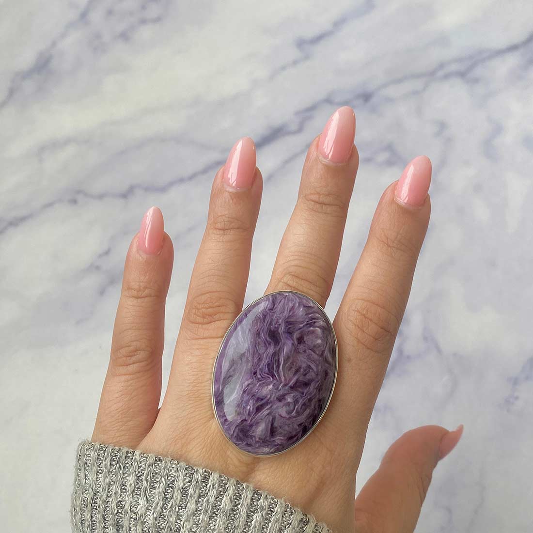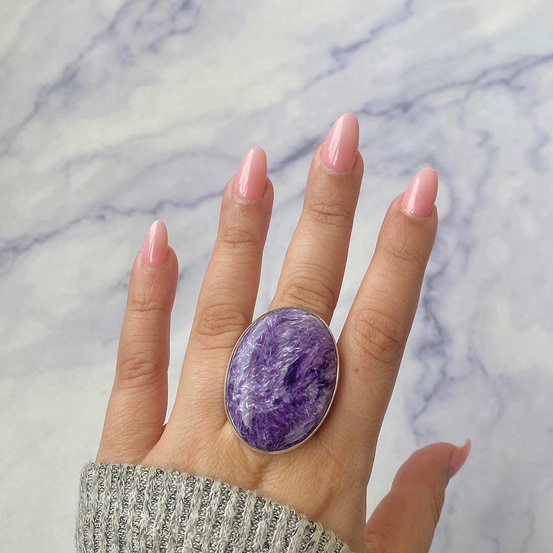 Statement rings made of Charoite are a captivating addition to any collection because they combine intrigue, rarity, and beauty. Charoite, a gemstone that originated in the Chara River region of Siberia, Russia, is well-known for its unusual swirling patterns of lavender, violet, and frequently striking black or white hues. This gemstone's vivid colors and rarefied nature— can only be found in one place on Earth—are its main draws. Charoite's distinctive patterns in jewelry design give each piece a one-of-a-kind quality. Statement Charoite rings and other jewelry draw attention and spark conversations, whether they are set in 925 sterling silver, gold, or other metals. An exquisite Statement Charoite ring is essential to enhance your collection and style, regardless of your interest in gemstones or your admiration for the beauty of uncommon and significant jewelry.