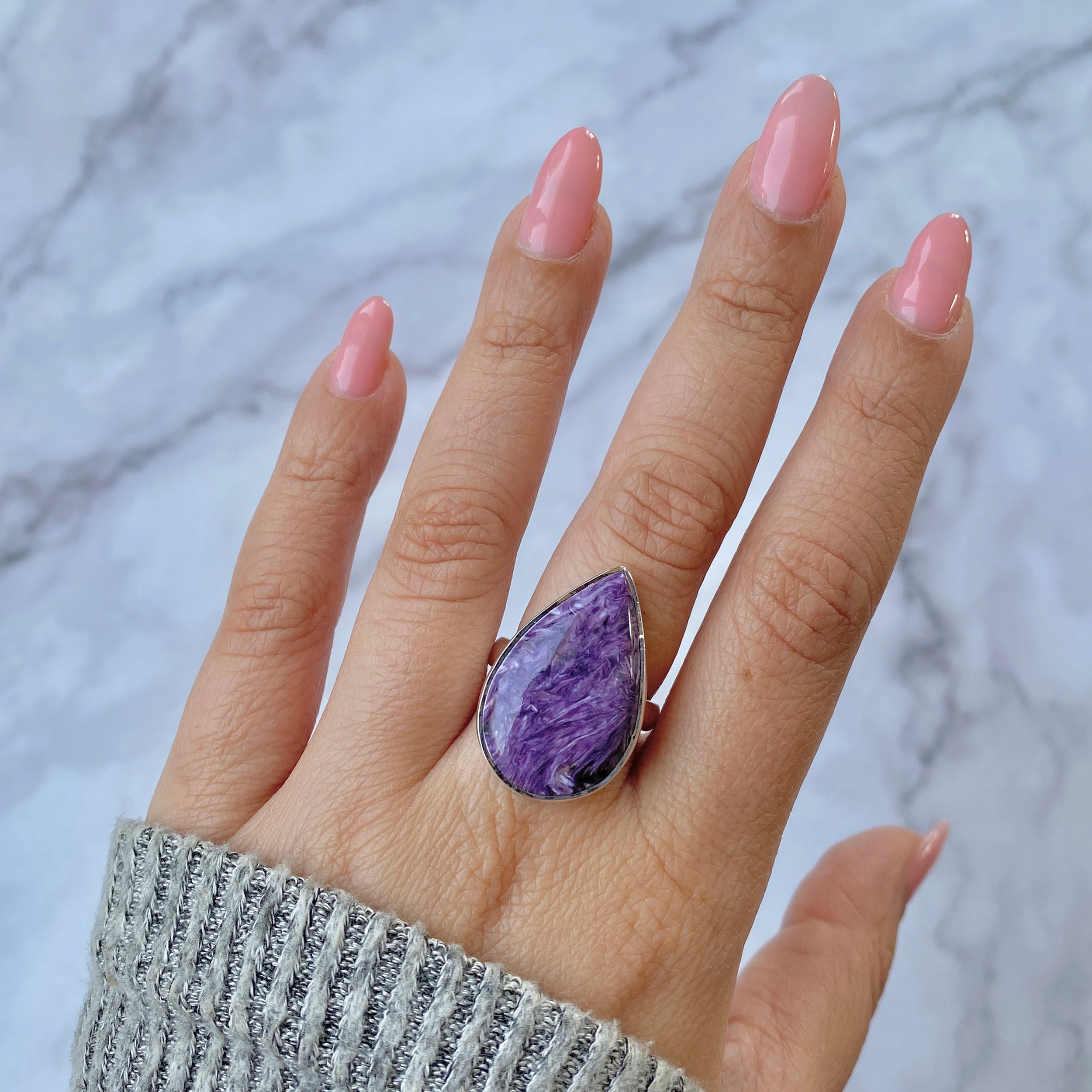 Statement rings made of Charoite are a captivating addition to any collection because they combine intrigue, rarity, and beauty. Charoite, a gemstone that originated in the Chara River region of Siberia, Russia, is well-known for its unusual swirling patterns of lavender, violet, and frequently striking black or white hues. This gemstone's vivid colors and rarefied nature— can only be found in one place on Earth—are its main draws. Charoite's distinctive patterns in jewelry design give each piece a one-of-a-kind quality. Statement Charoite rings and other jewelry draw attention and spark conversations, whether they are set in 925 sterling silver, gold, or other metals. An exquisite Statement Charoite ring is essential to enhance your collection and style, regardless of your interest in gemstones or your admiration for the beauty of uncommon and significant jewelry.