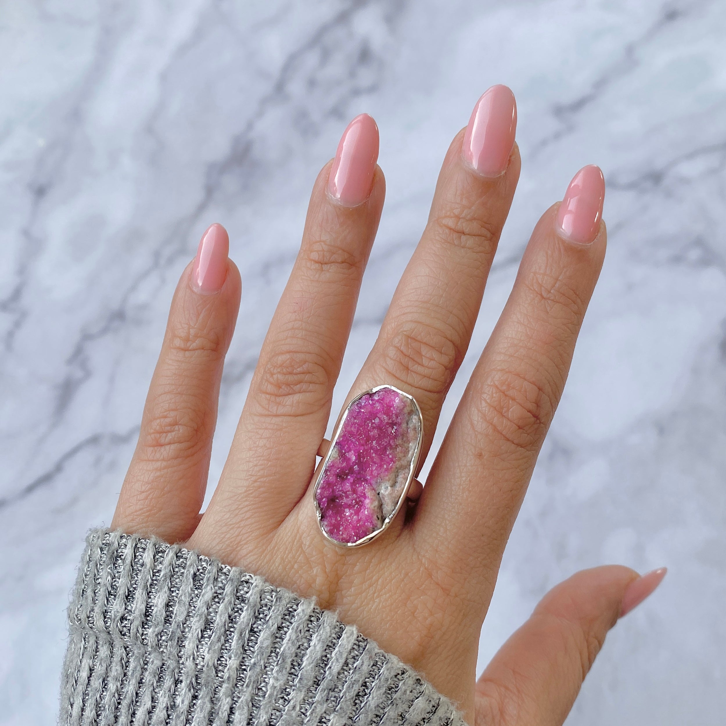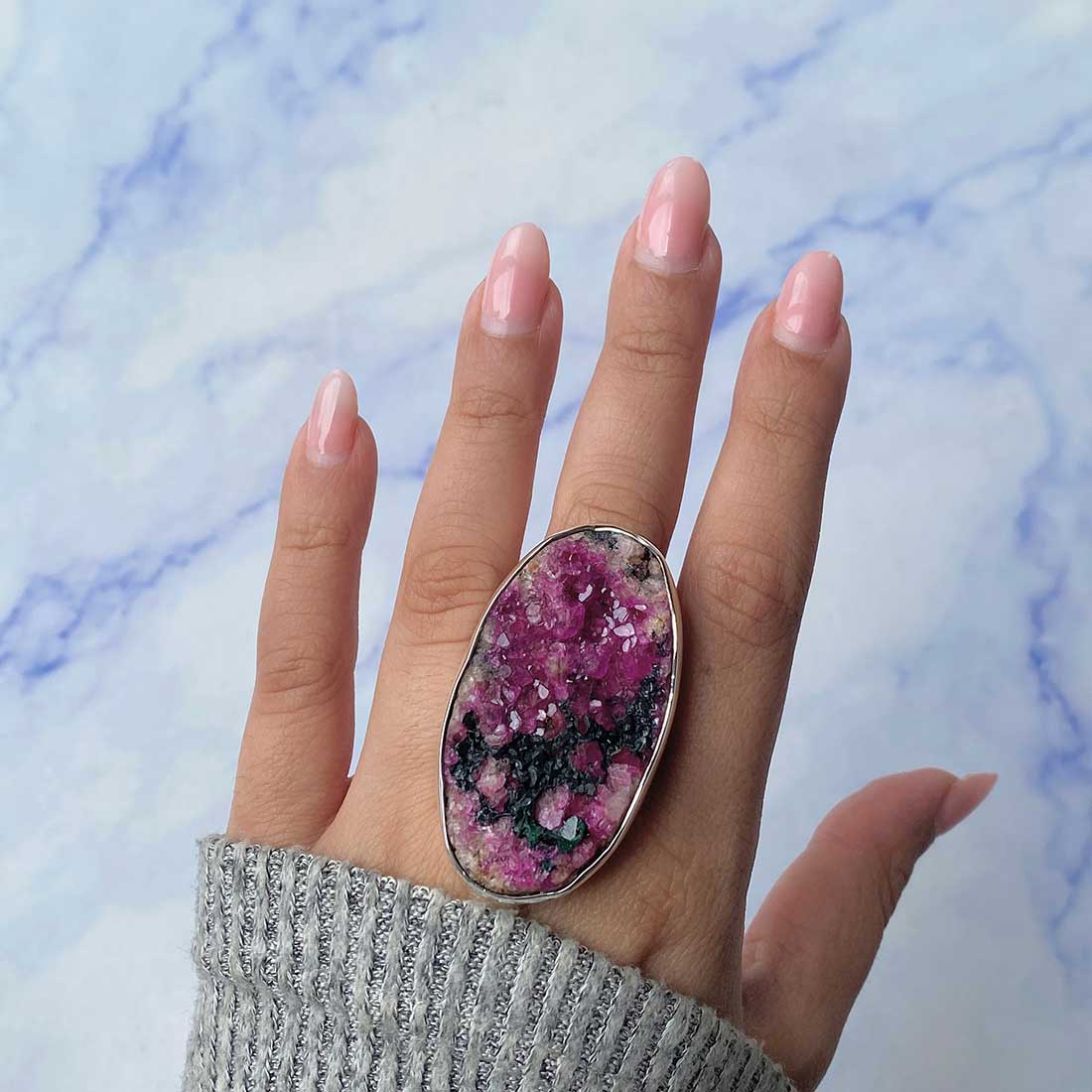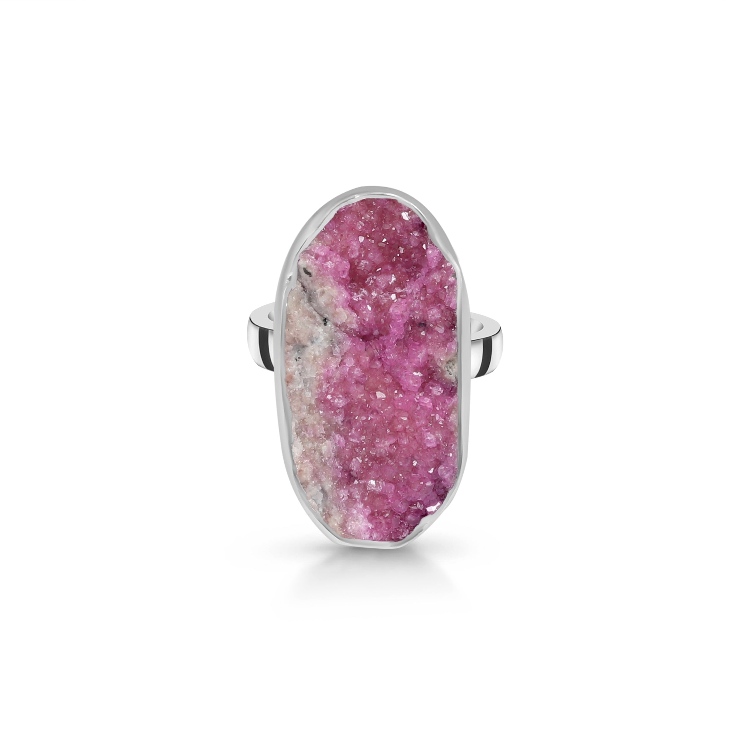 Cobalt Calcite is a mesmerizing stone because of its untextured appearance and reddish-pinkish hue. It is also known as Pink Cobalt Calcite and Cobalto Calcite. It is highly sought after because of its beauty and stunning formation. It is a unique and rare type of calcite because of the cobalt present in it. The more cobalt present in calcite stone, the darker it will be. Cobalt Calcite is a powerful healing stone because of its potent healing powers. Wearing a Cobalt Calcite ring enhances personality and provides healing powers. It is a perfect choice for those who are suffering from mental health issues or physical health. It usually crystallizes as rhombohedral or scalenohedral crystals in the trigonal system. It frequently manifests as botryoidal (grape-like) clumps or druzy crusts.