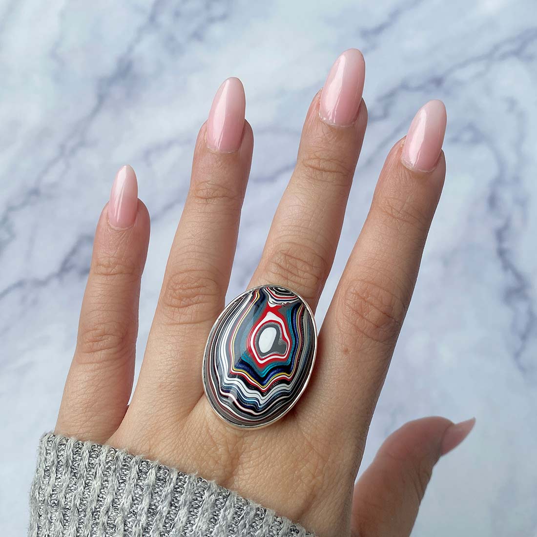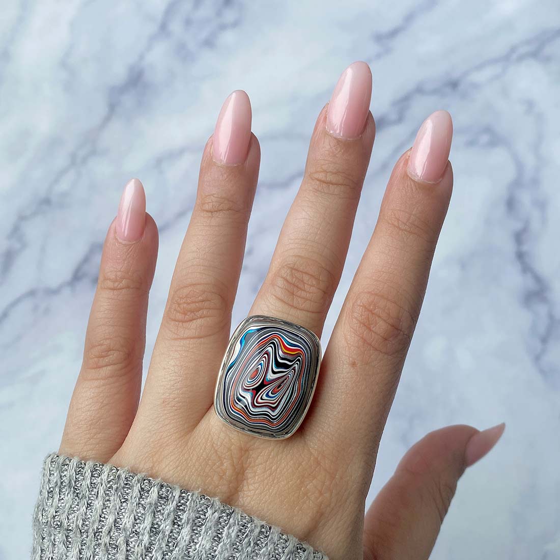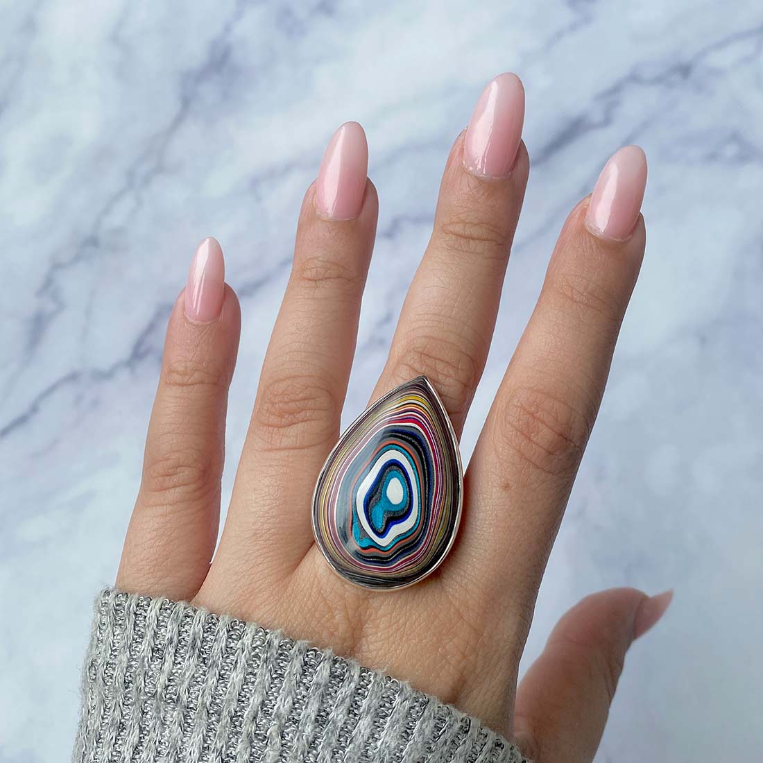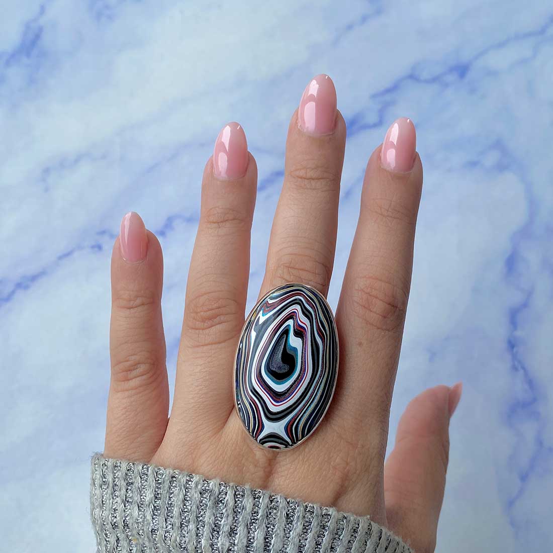 From its first discovery to the present time, this spectacular stone, or we say, an accumulated paint transformed into a rock, has created sumptuous Fordite rings, showcasing intricate patterns and a diverse range of colors in your fingers, from blue to red, bright yellow to gorgeous green, and even gray. Its vibrant color palate and lustrous structure with head-turning aesthetics make the stone suitable for every attire and occasion. It is a one-of-a-kind stone, setting new standards in the Jewelry industry. Each piece is a peak of creativity and stands out in the crowd by adding a vibrant splash of colors, gazing through every visible layer.