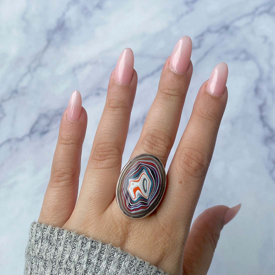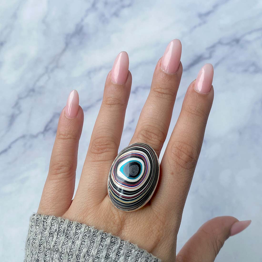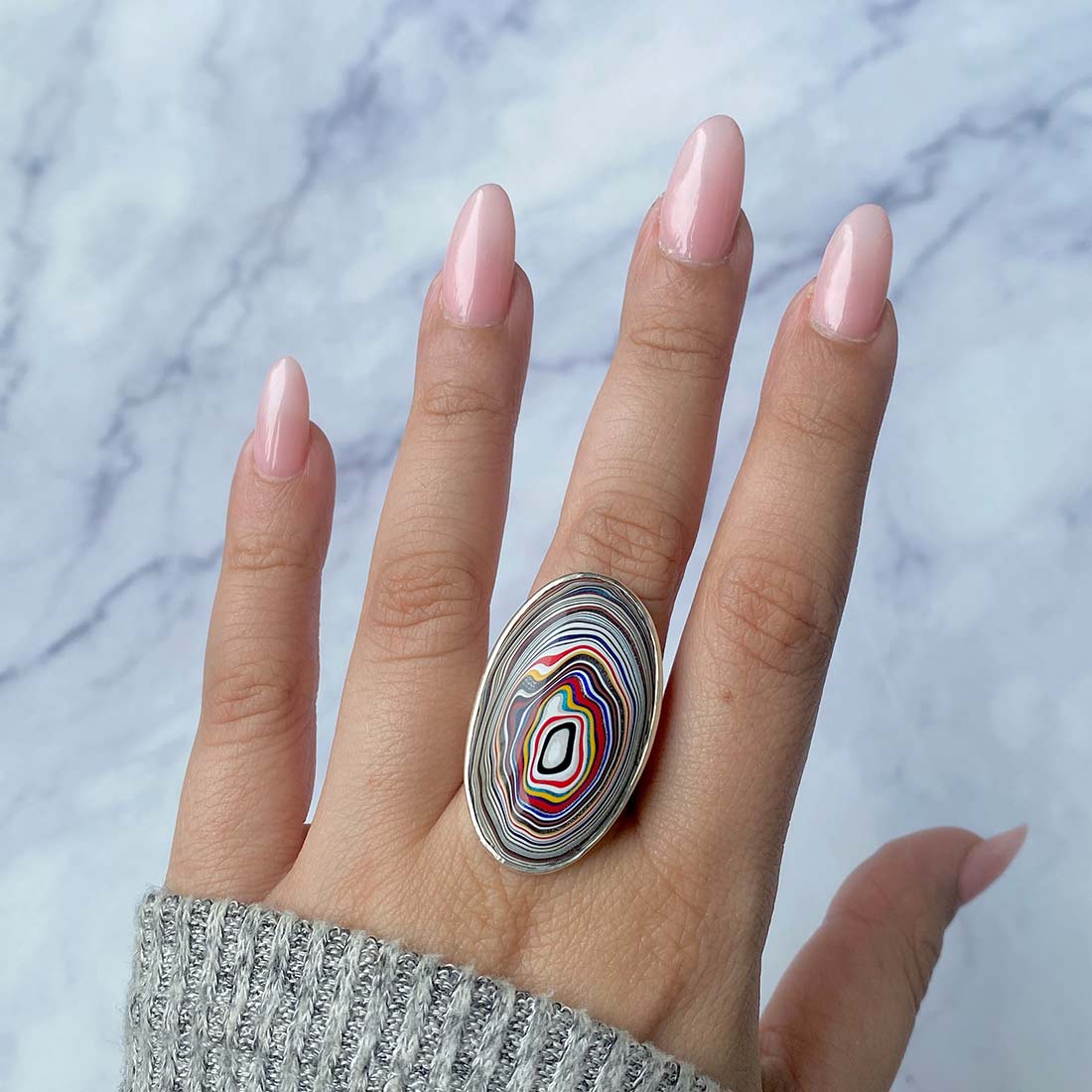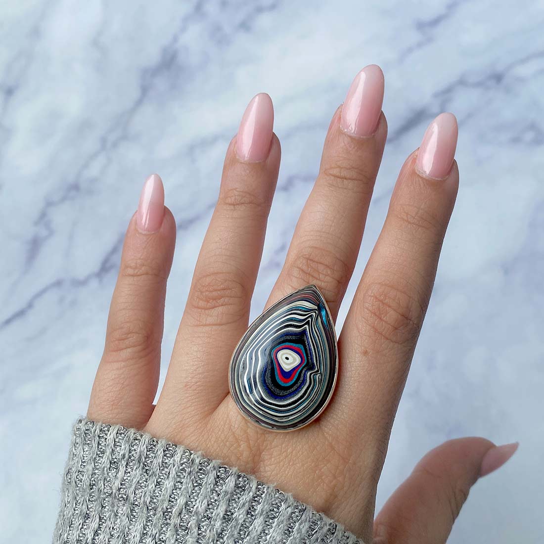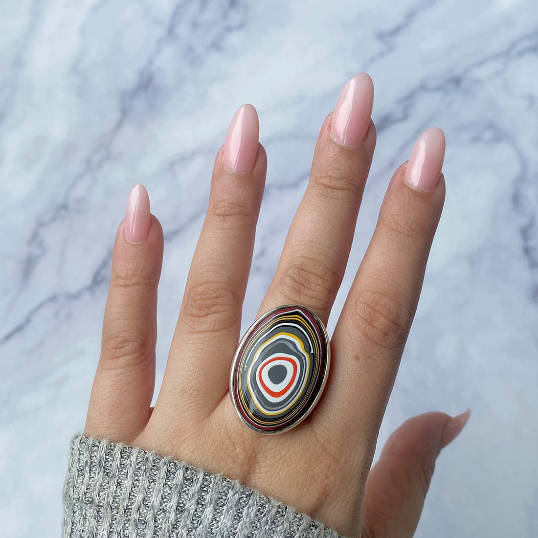 From its first discovery to the present time, this spectacular stone, or we say, an accumulated paint transformed into a rock, has created sumptuous Fordite rings, showcasing intricate patterns and a diverse range of colors in your fingers, from blue to red, bright yellow to gorgeous green, and even gray. Its vibrant color palate and lustrous structure with head-turning aesthetics make the stone suitable for every attire and occasion. It is a one-of-a-kind stone, setting new standards in the Jewelry industry. Each piece is a peak of creativity and stands out in the crowd by adding a vibrant splash of colors, gazing through every visible layer.