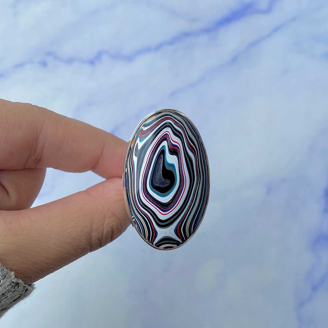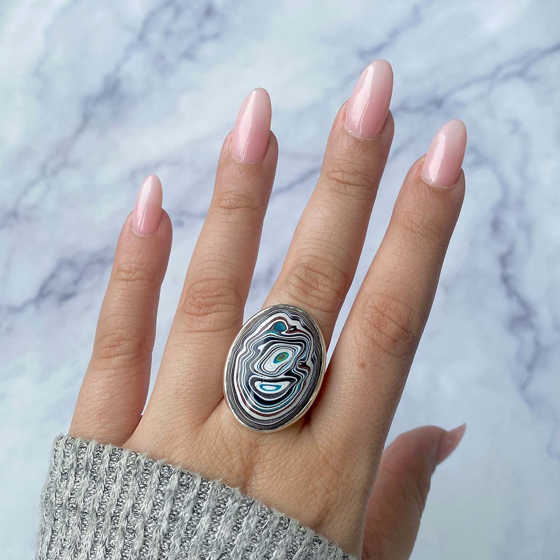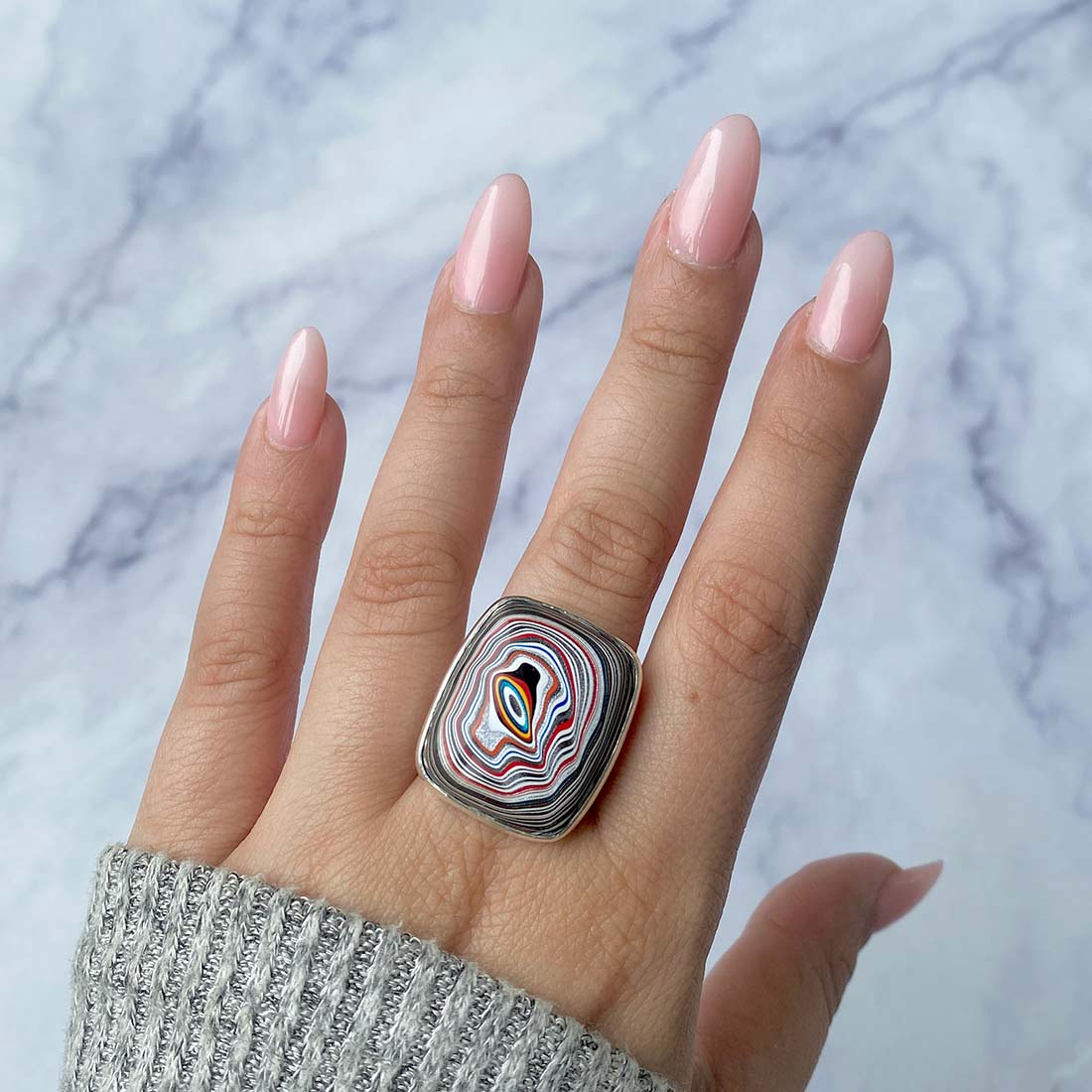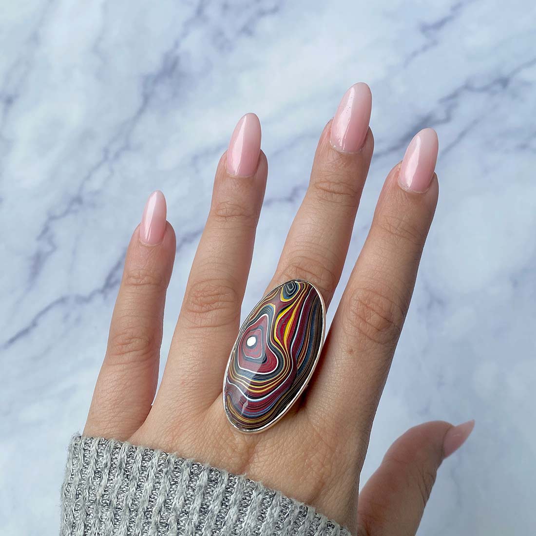 From its first discovery to the present time, this spectacular stone, or we say, an accumulated paint transformed into a rock, has created sumptuous Fordite rings, showcasing intricate patterns and a diverse range of colors in your fingers, from blue to red, bright yellow to gorgeous green, and even gray. Its vibrant color palate and lustrous structure with head-turning aesthetics make the stone suitable for every attire and occasion. It is a one-of-a-kind stone, setting new standards in the Jewelry industry. Each piece is a peak of creativity and stands out in the crowd by adding a vibrant splash of colors, gazing through every visible layer.