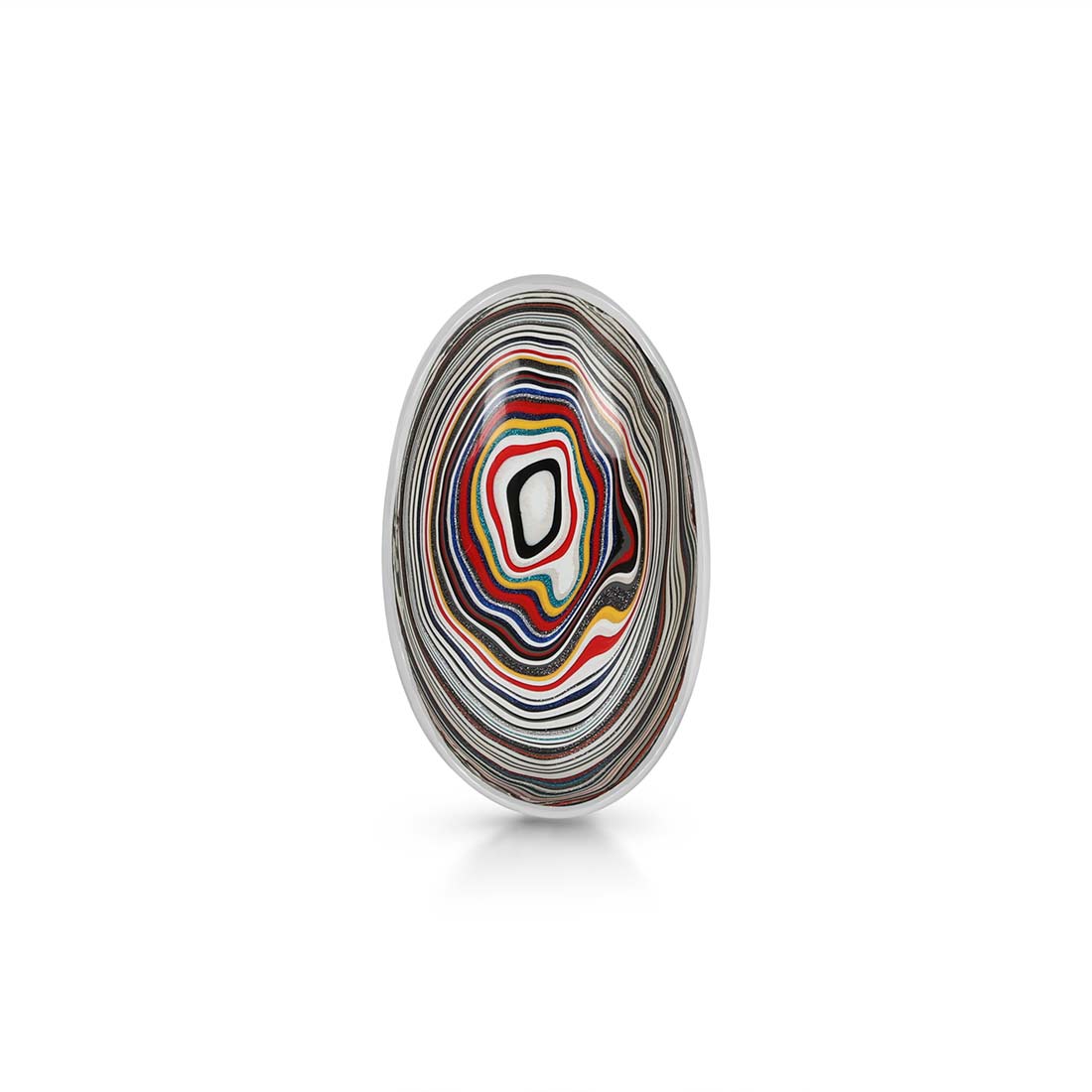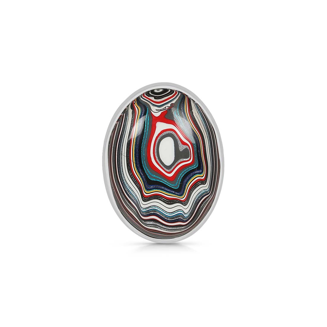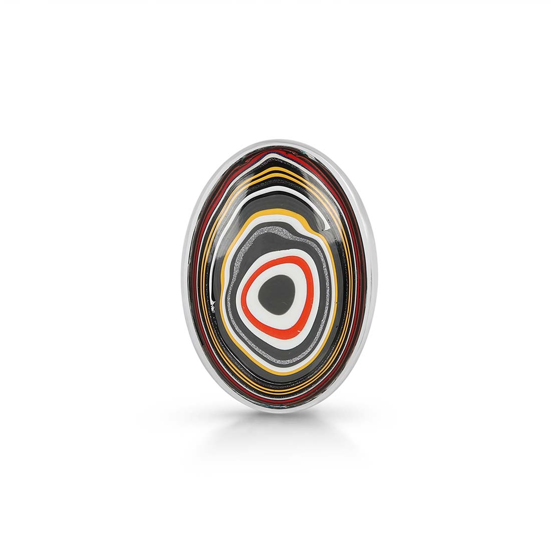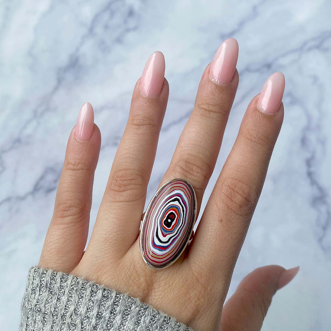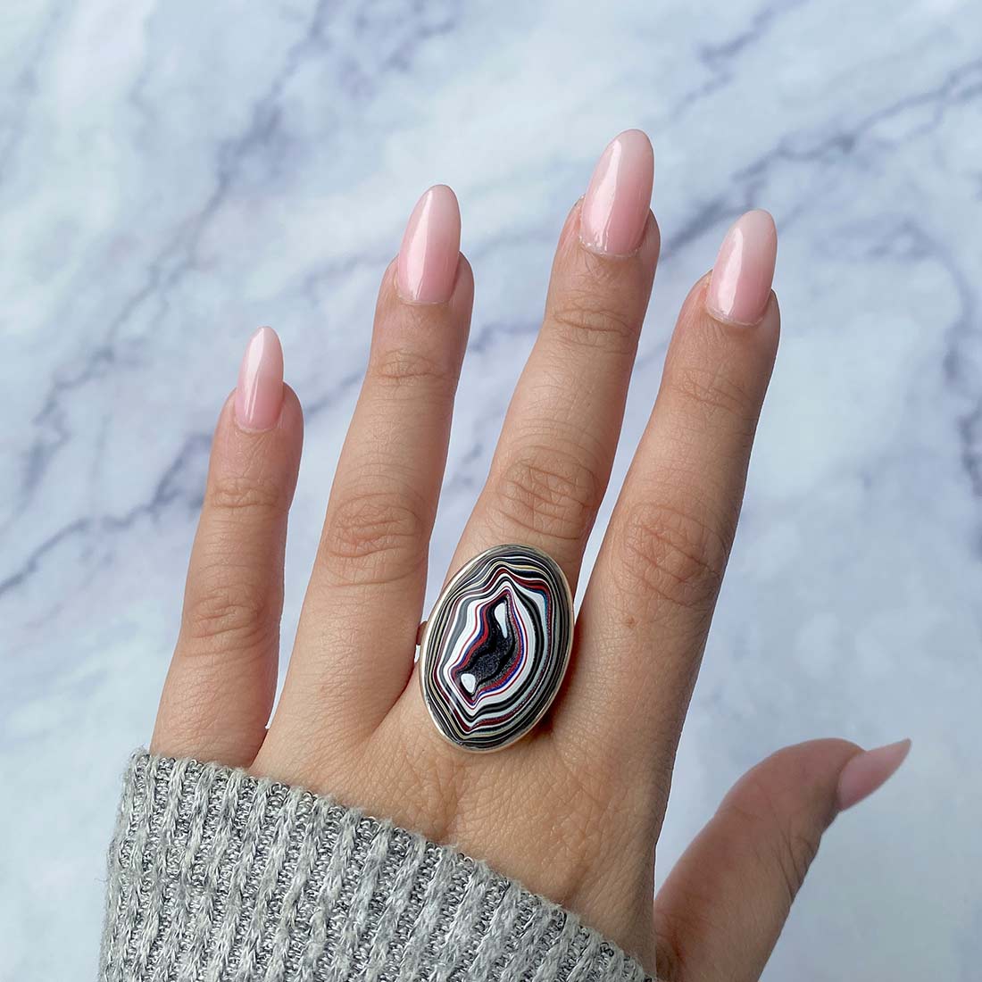 From its first discovery to the present time, this spectacular stone, or we say, an accumulated paint transformed into a rock, has created sumptuous Fordite rings, showcasing intricate patterns and a diverse range of colors in your fingers, from blue to red, bright yellow to gorgeous green, and even gray. Its vibrant color palate and lustrous structure with head-turning aesthetics make the stone suitable for every attire and occasion. It is a one-of-a-kind stone, setting new standards in the Jewelry industry. Each piece is a peak of creativity and stands out in the crowd by adding a vibrant splash of colors, gazing through every visible layer.