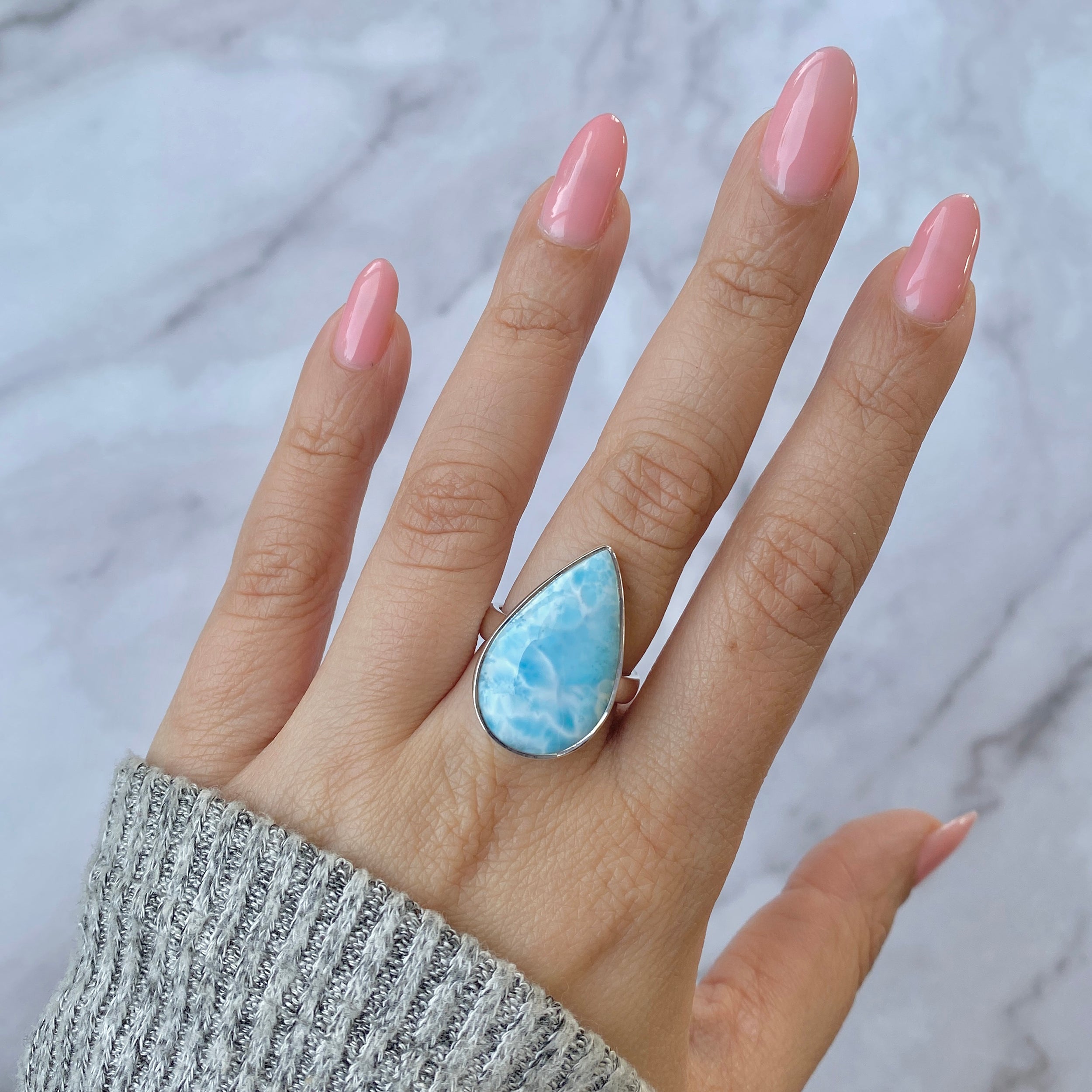 Larimar rings are thought to provide a number of therapeutic benefits. It is claimed to give relaxation and lessen tension and anxiety in the wearer by having a calming and soothing impact. Larimar's stunning blue hue is frequently connected to the sky and the ocean, fostering calm and peace. Some people think that wearing Larimar jewelry, such as Larimar bracelets, earrings, Larimar pendants, and necklaces, can aid in calming the mind and promoting inner peace.