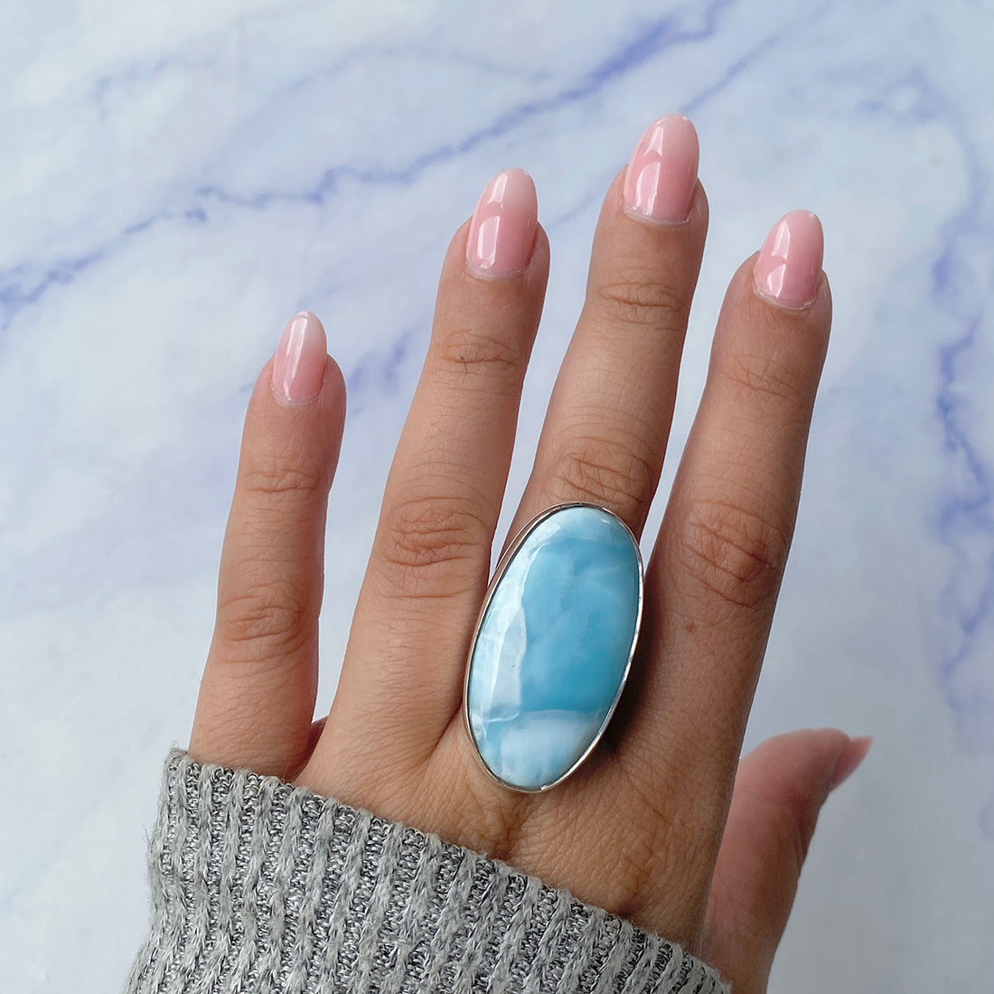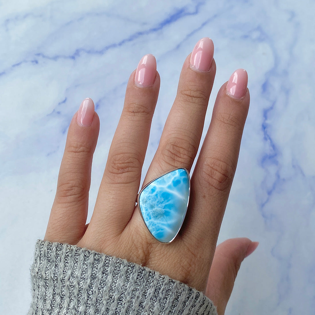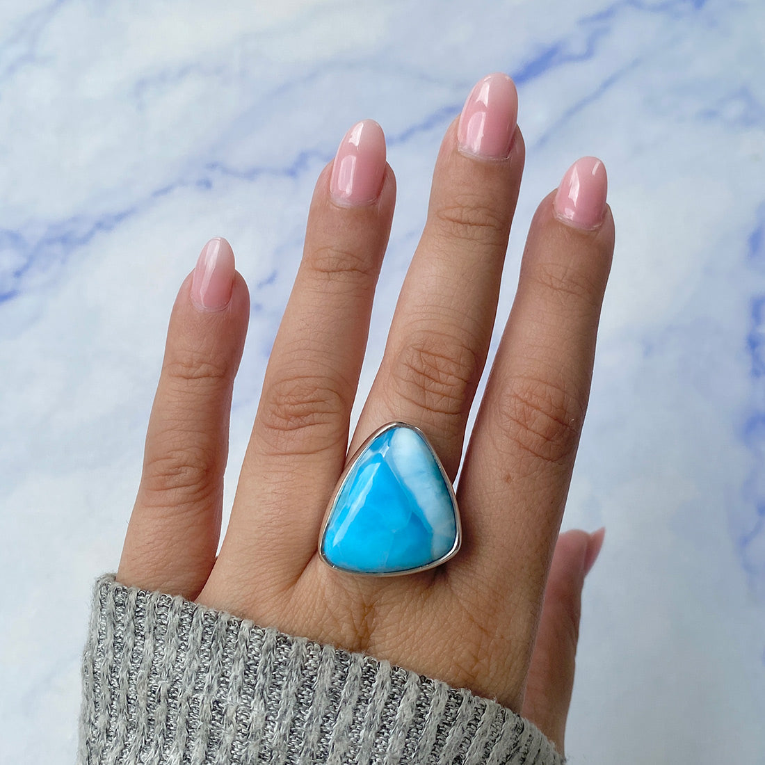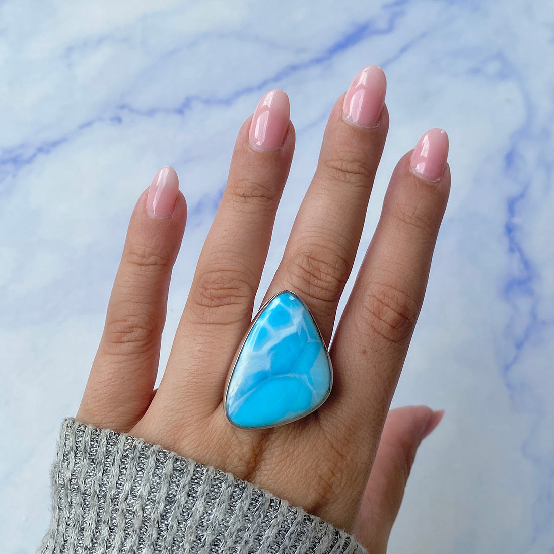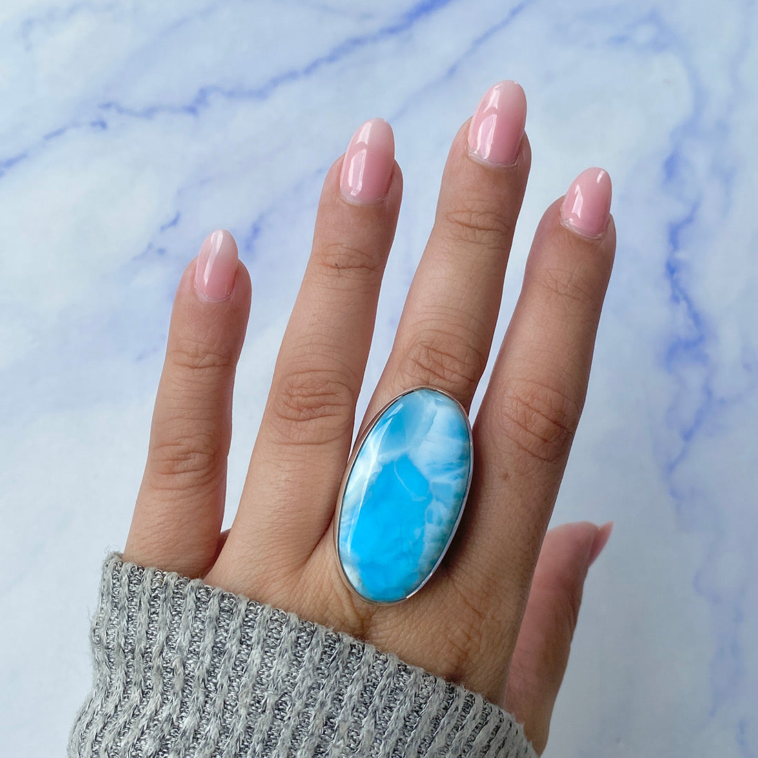 Larimar rings are thought to provide a number of therapeutic benefits. It is claimed to give relaxation and lessen tension and anxiety in the wearer by having a calming and soothing impact. Larimar's stunning blue hue is frequently connected to the sky and the ocean, fostering calm and peace. Some people think that wearing Larimar jewelry, such as Larimar bracelets, earrings, Larimar pendants, and necklaces, can aid in calming the mind and promoting inner peace.