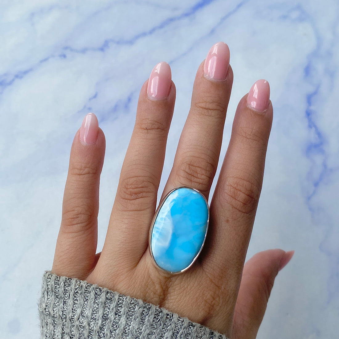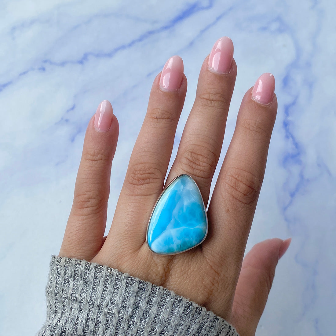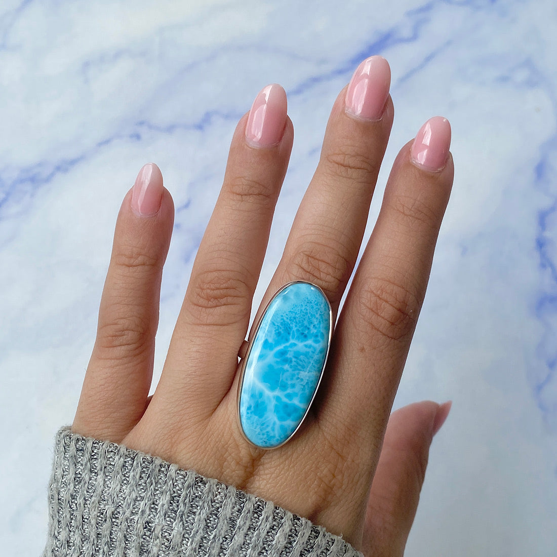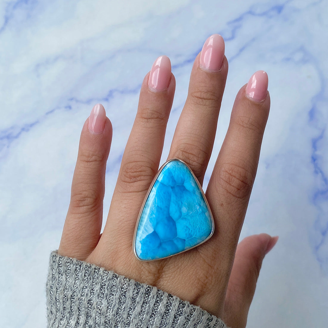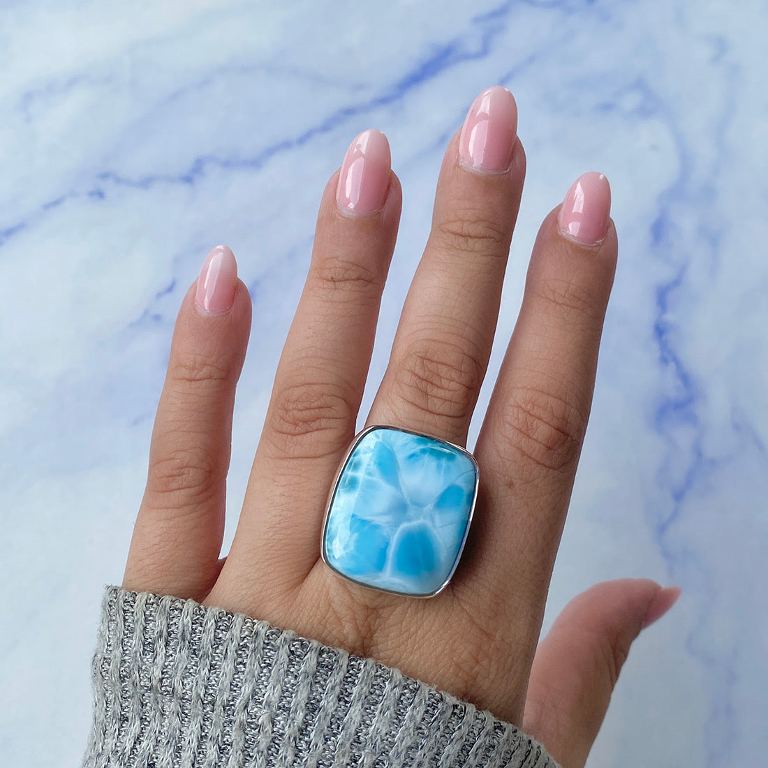 Larimar rings are thought to provide a number of therapeutic benefits. It is claimed to give relaxation and lessen tension and anxiety in the wearer by having a calming and soothing impact. Larimar's stunning blue hue is frequently connected to the sky and the ocean, fostering calm and peace. Some people think that wearing Larimar jewelry, such as Larimar bracelets, earrings, Larimar pendants, and necklaces, can aid in calming the mind and promoting inner peace.