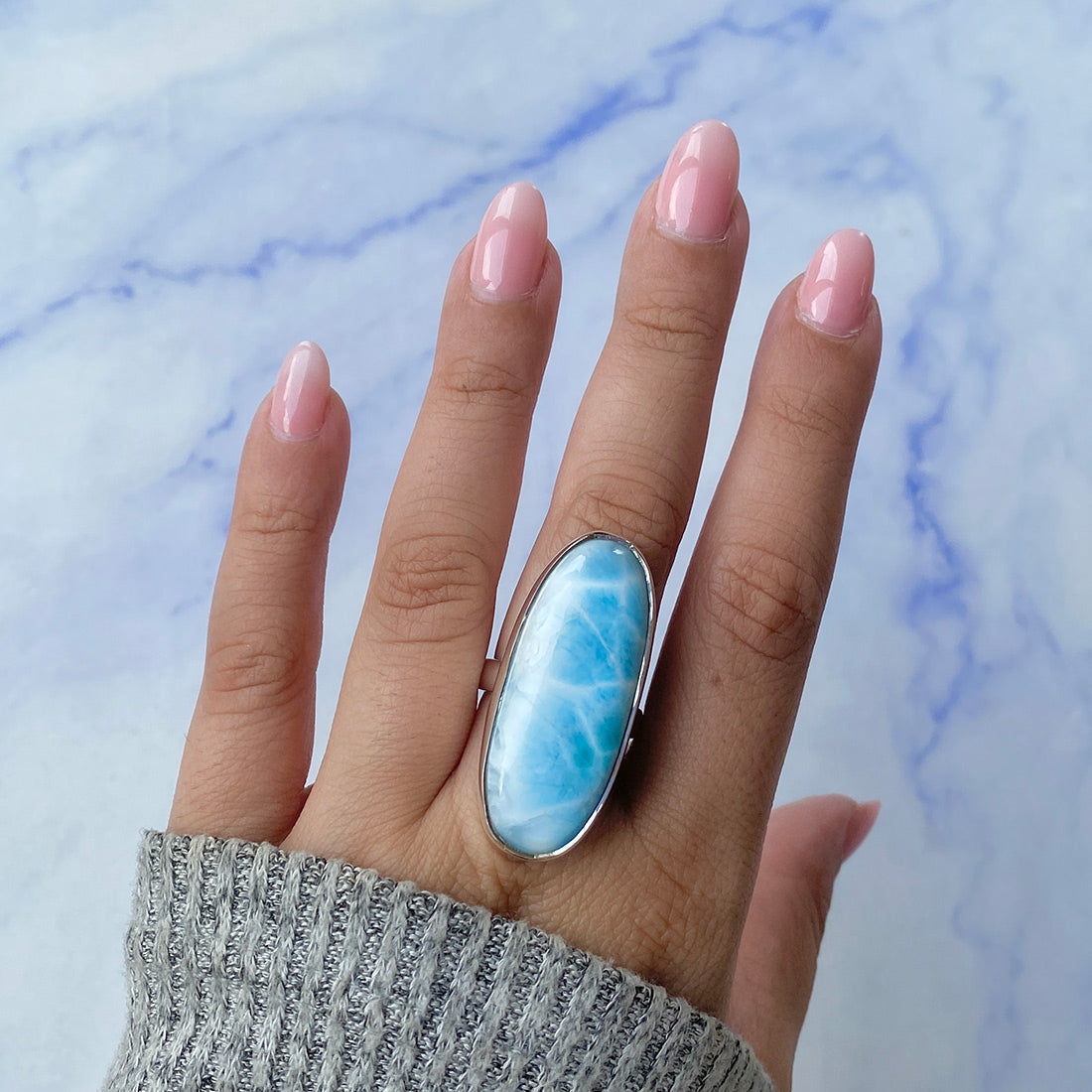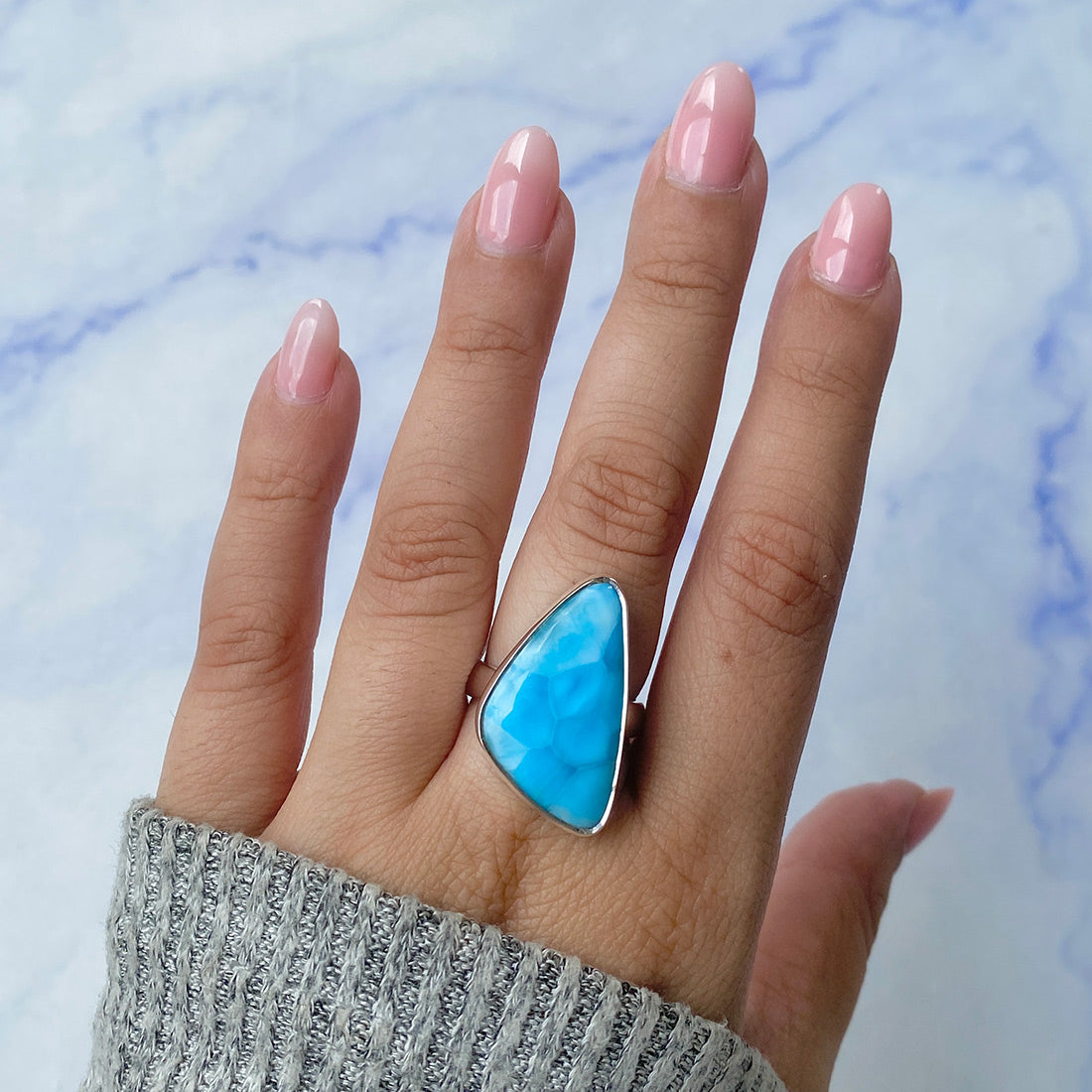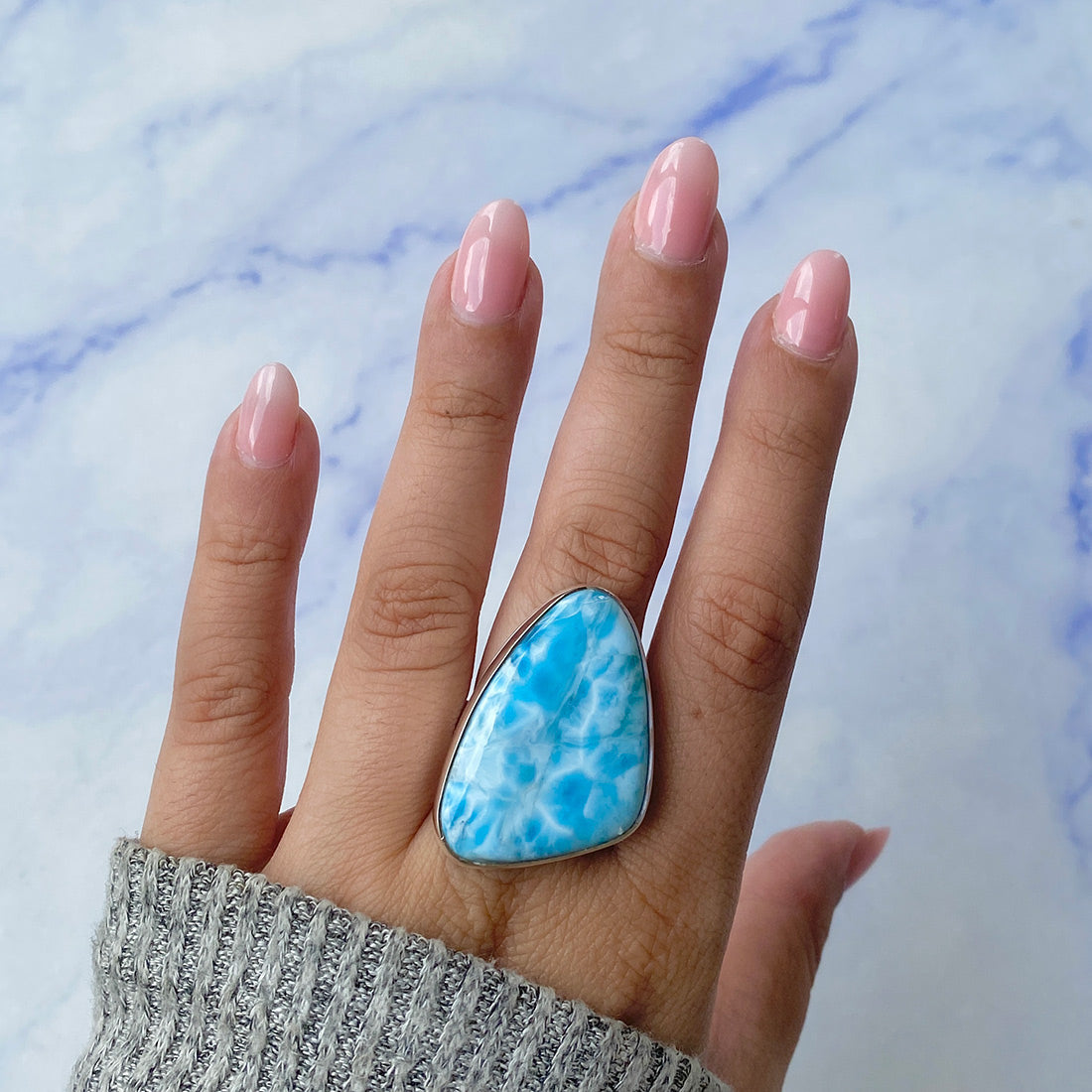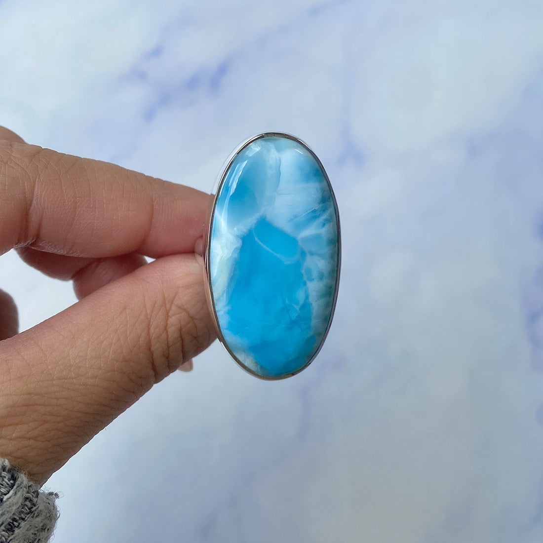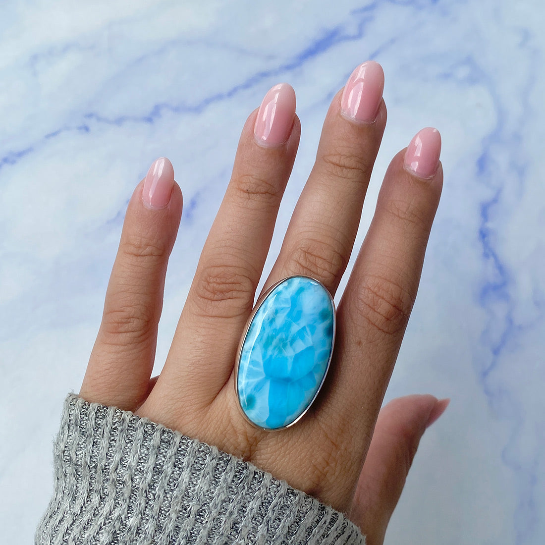 Larimar rings are thought to provide a number of therapeutic benefits. It is claimed to give relaxation and lessen tension and anxiety in the wearer by having a calming and soothing impact. Larimar's stunning blue hue is frequently connected to the sky and the ocean, fostering calm and peace. Some people think that wearing Larimar jewelry, such as Larimar bracelets, earrings, Larimar pendants, and necklaces, can aid in calming the mind and promoting inner peace.