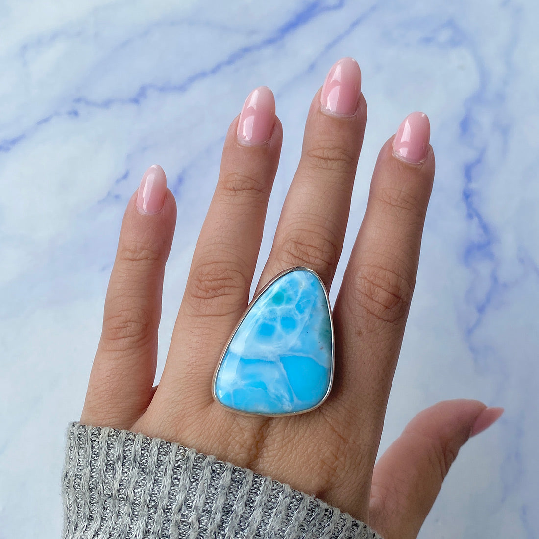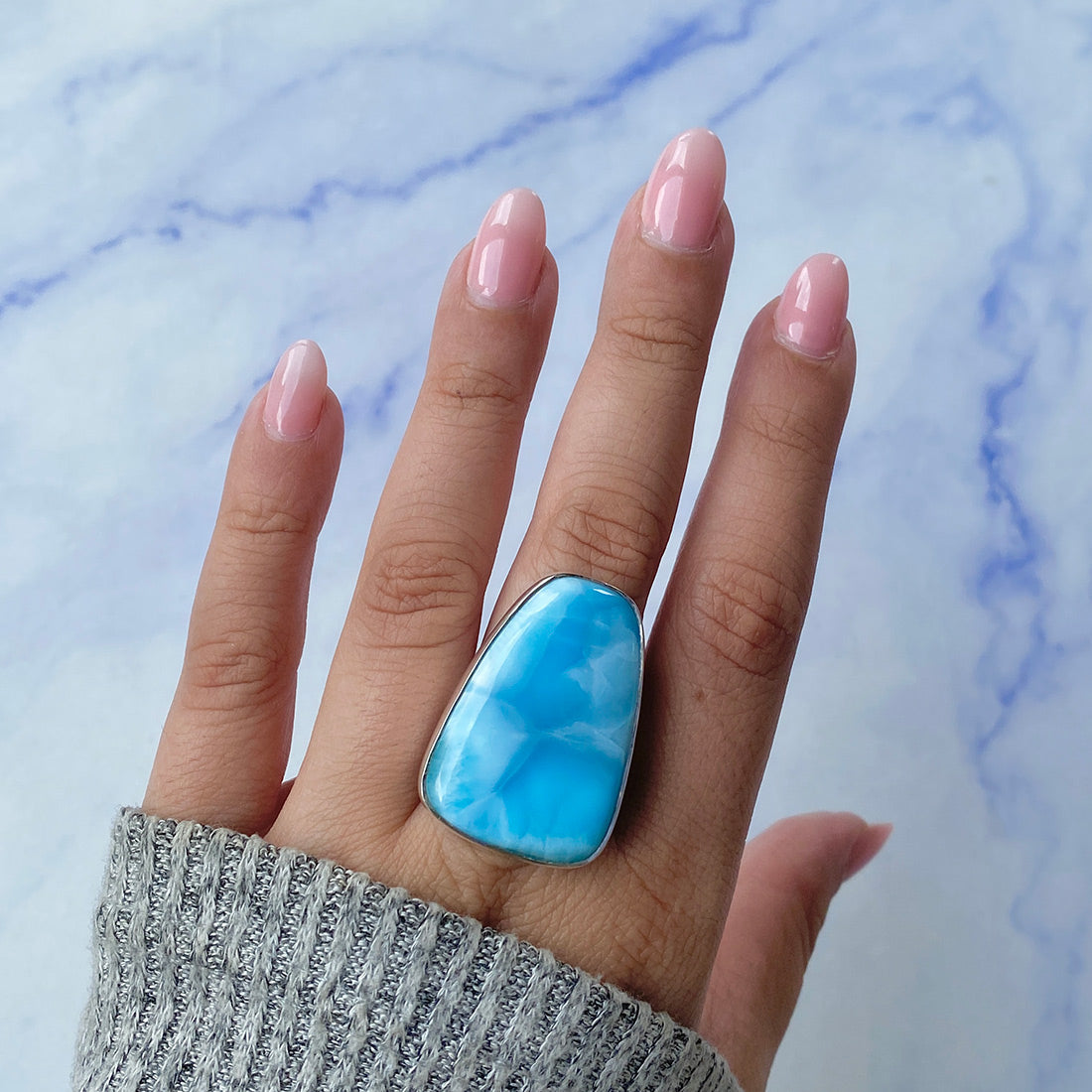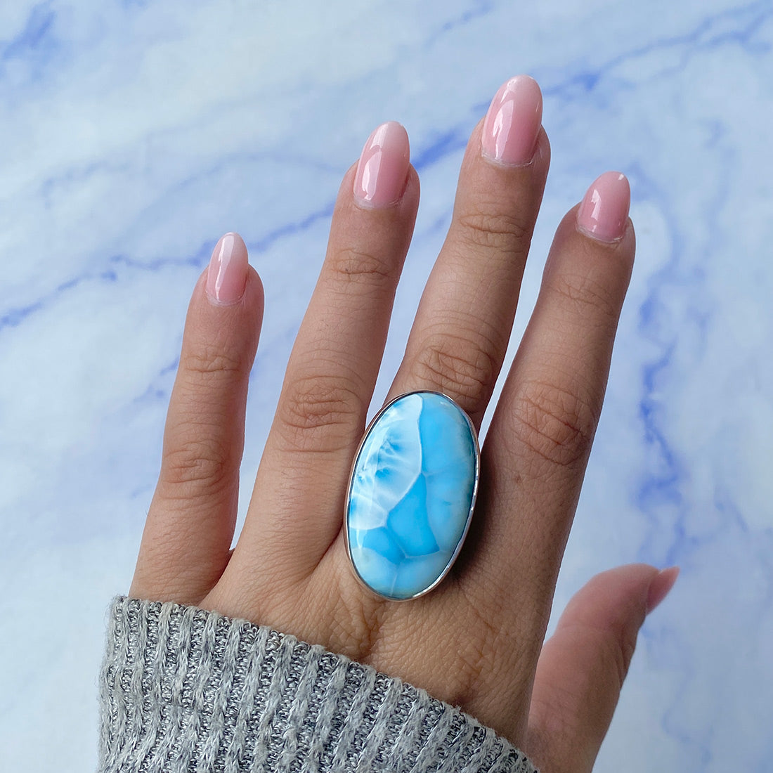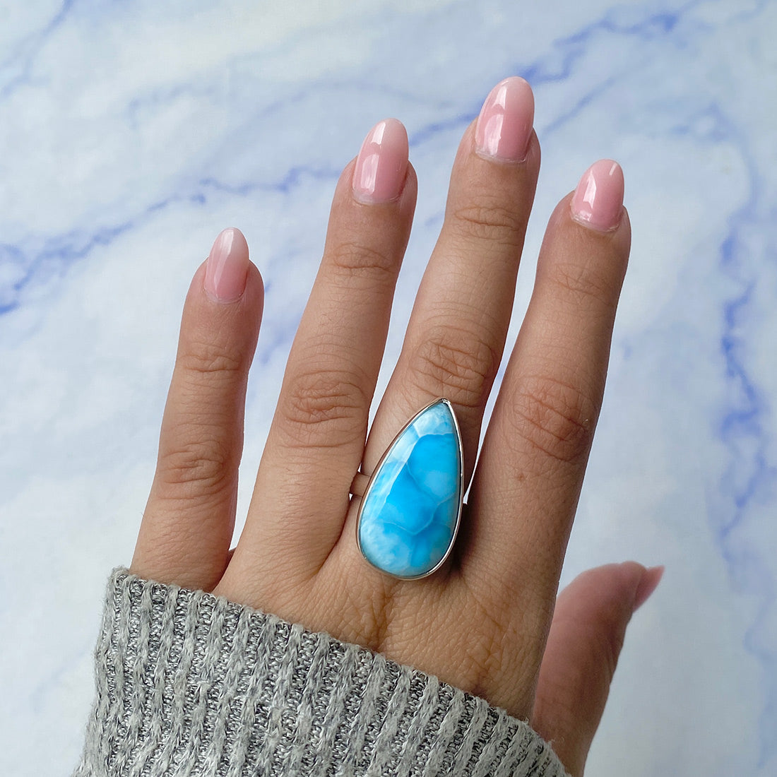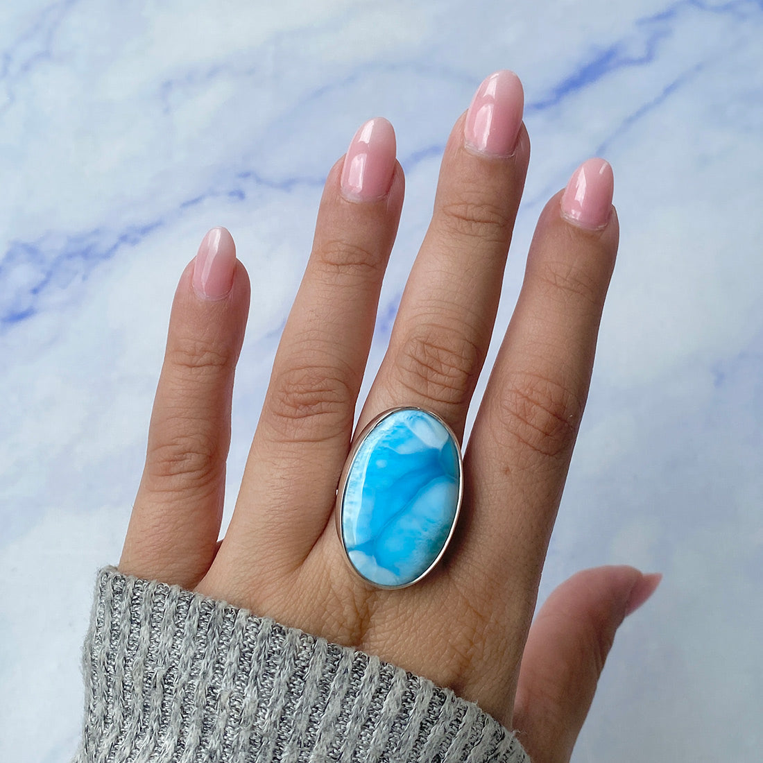 Larimar rings are thought to provide a number of therapeutic benefits. It is claimed to give relaxation and lessen tension and anxiety in the wearer by having a calming and soothing impact. Larimar's stunning blue hue is frequently connected to the sky and the ocean, fostering calm and peace. Some people think that wearing Larimar jewelry, such as Larimar bracelets, earrings, Larimar pendants, and necklaces, can aid in calming the mind and promoting inner peace.