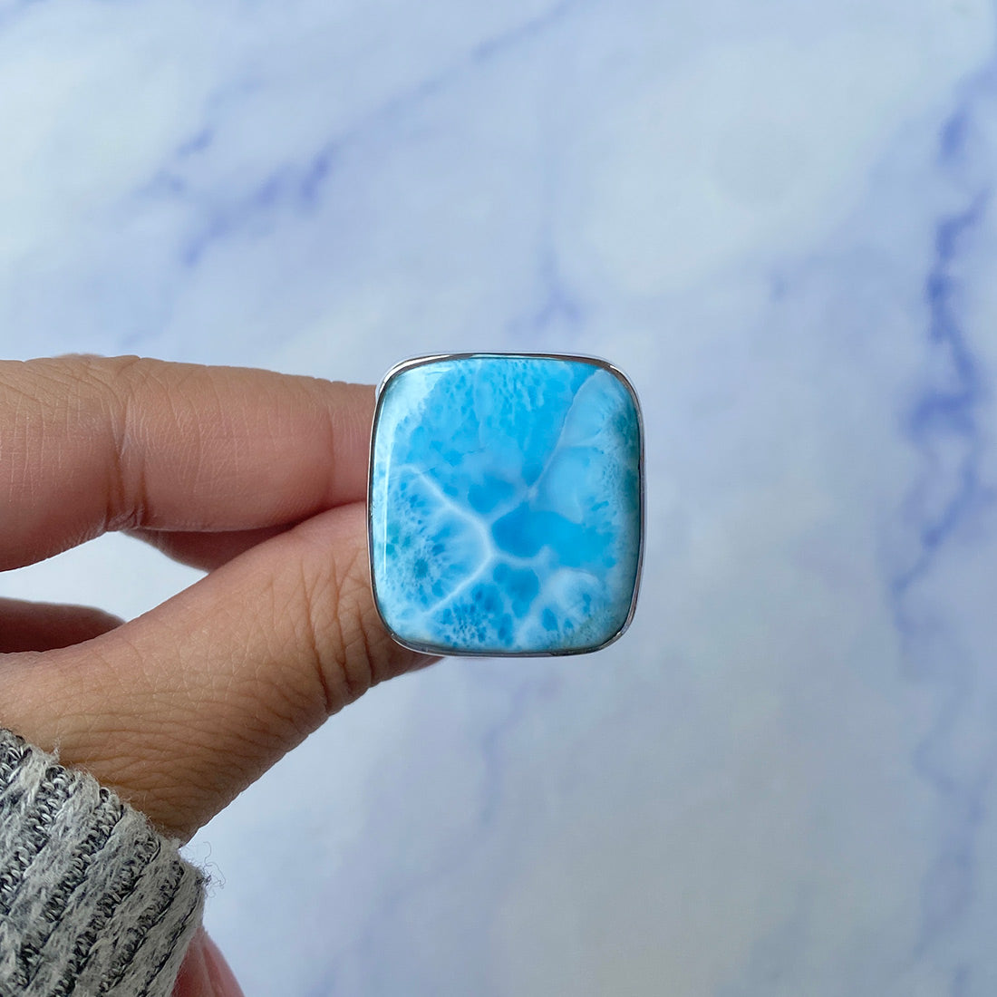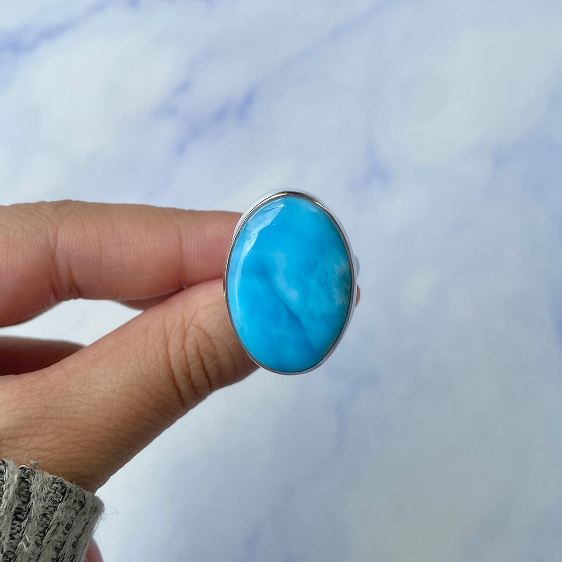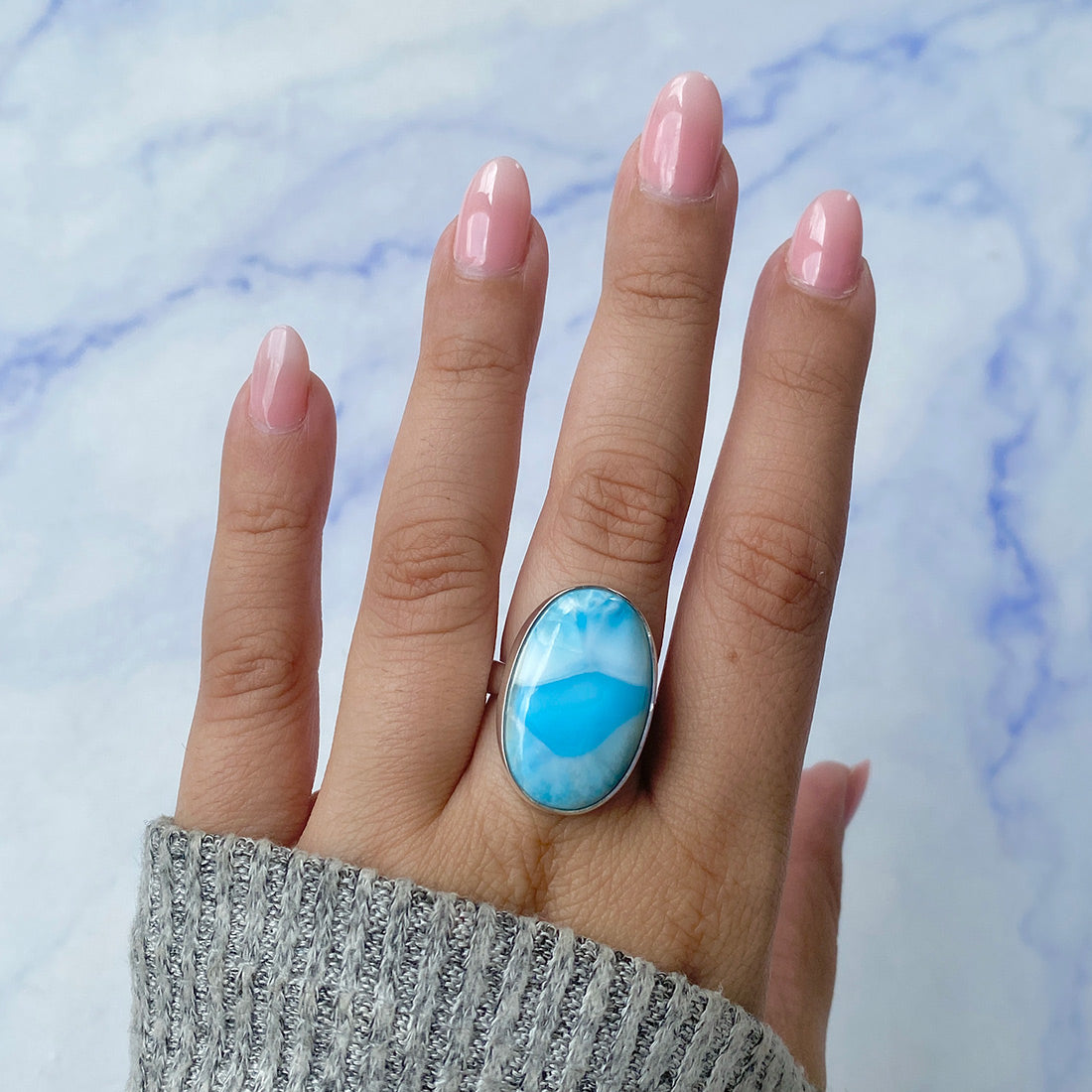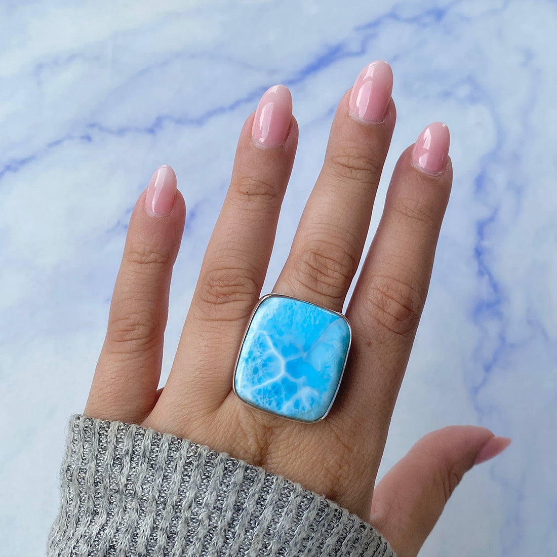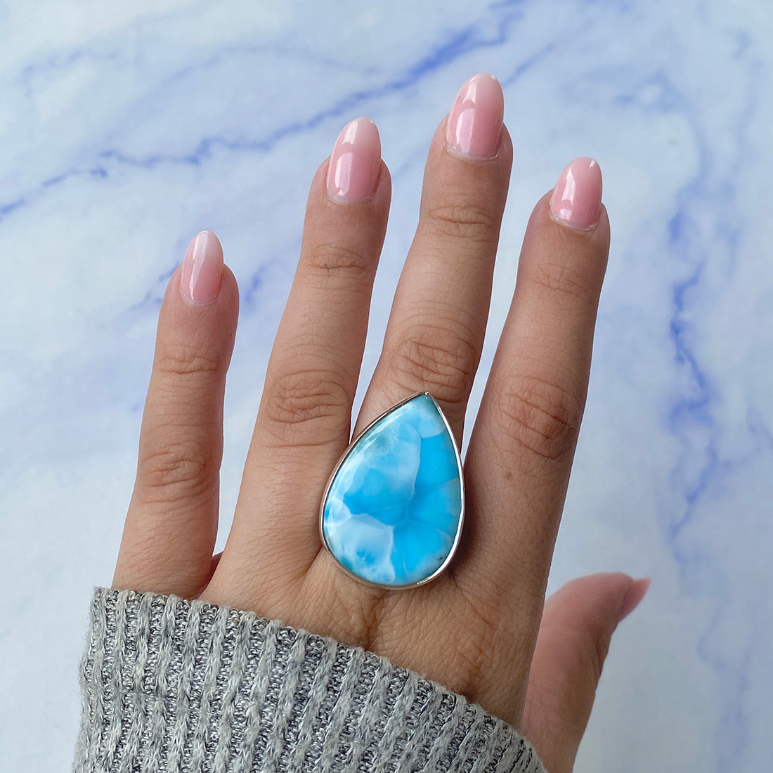 Larimar rings are thought to provide a number of therapeutic benefits. It is claimed to give relaxation and lessen tension and anxiety in the wearer by having a calming and soothing impact. Larimar's stunning blue hue is frequently connected to the sky and the ocean, fostering calm and peace. Some people think that wearing Larimar jewelry, such as Larimar bracelets, earrings, Larimar pendants, and necklaces, can aid in calming the mind and promoting inner peace.