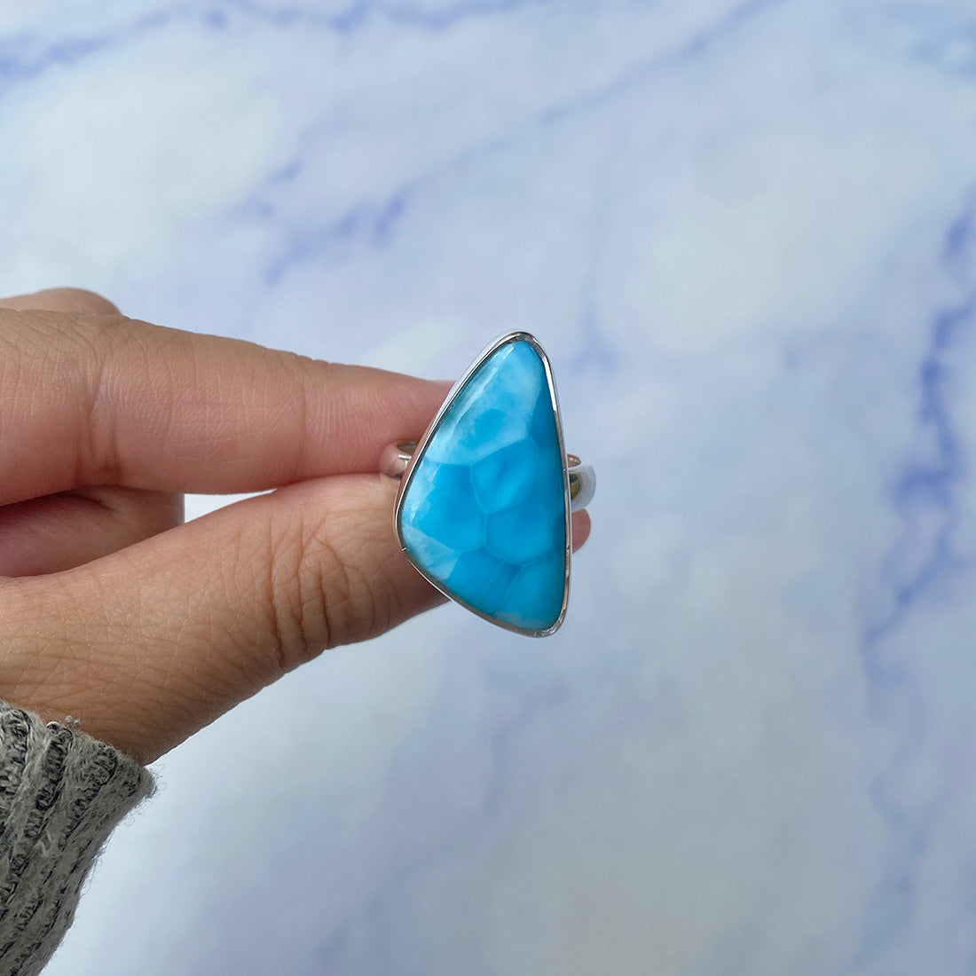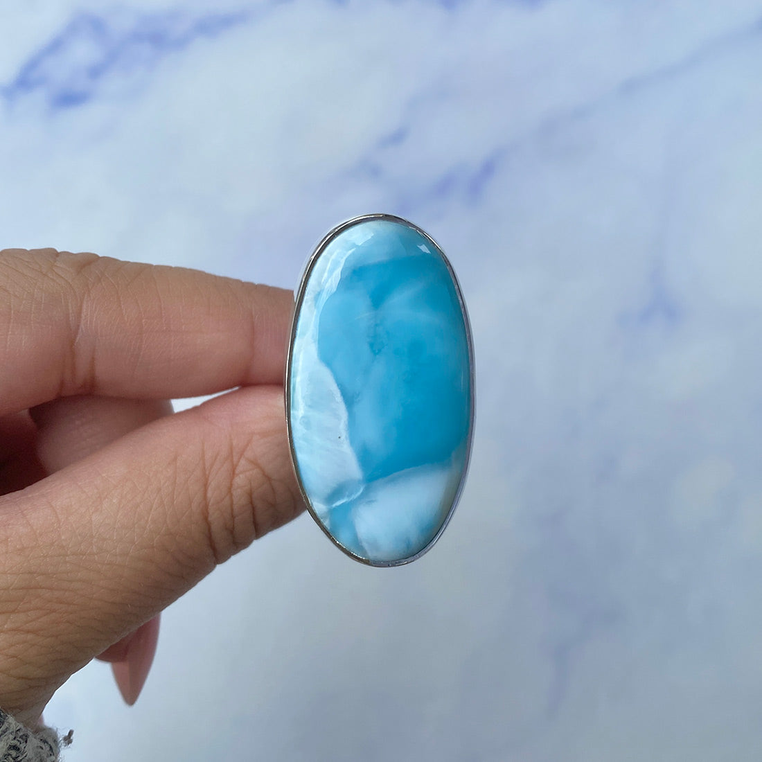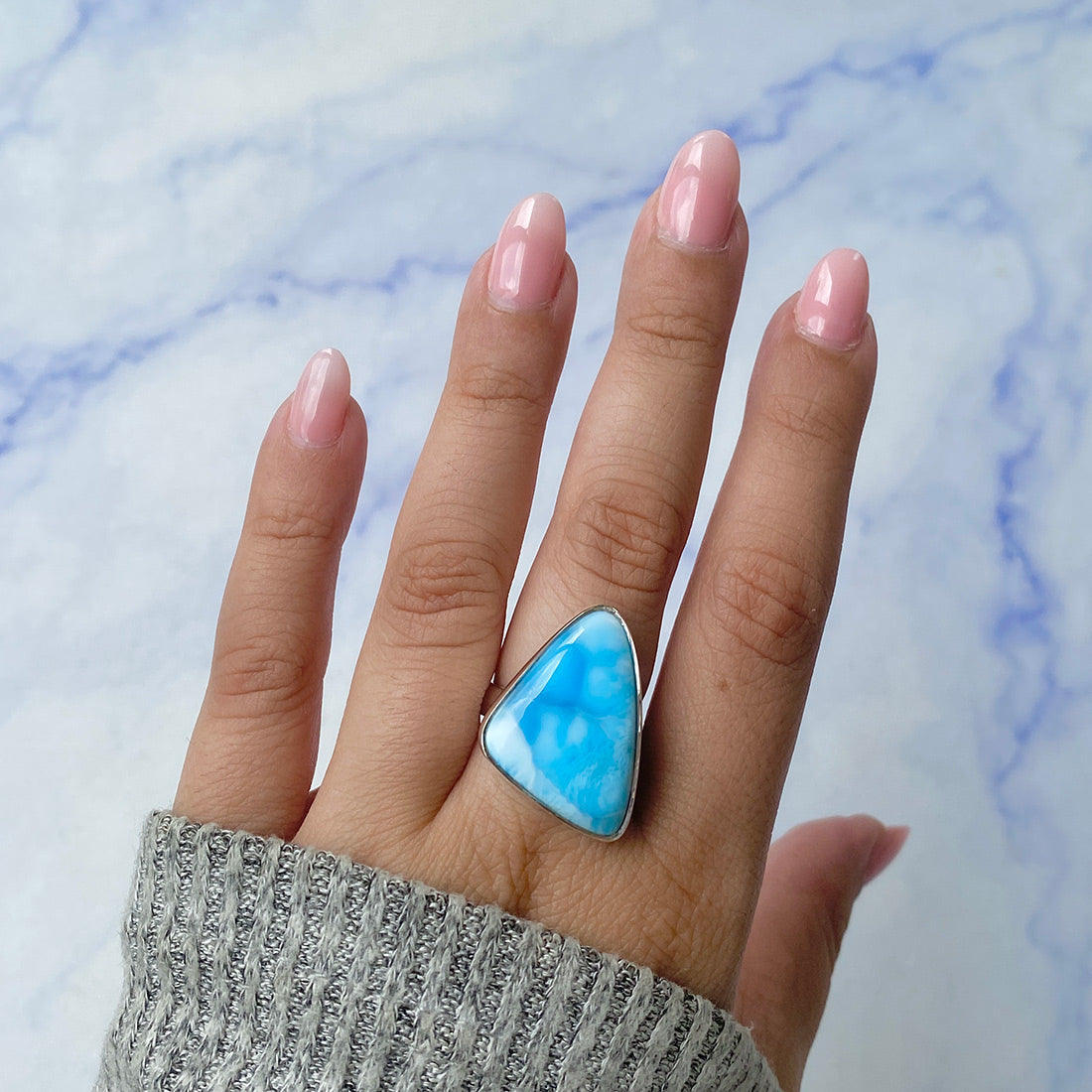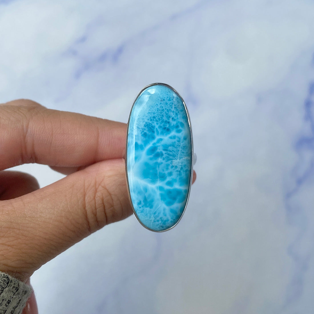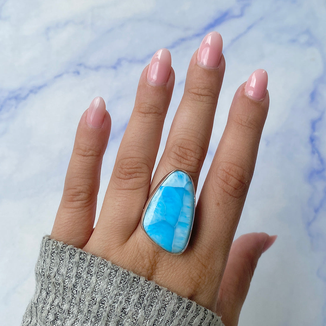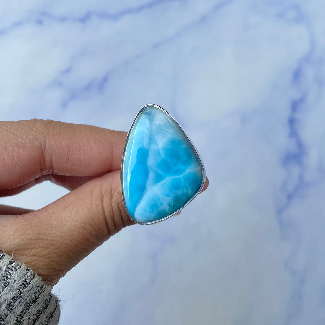 Larimar rings are thought to provide a number of therapeutic benefits. It is claimed to give relaxation and lessen tension and anxiety in the wearer by having a calming and soothing impact. Larimar's stunning blue hue is frequently connected to the sky and the ocean, fostering calm and peace. Some people think that wearing Larimar jewelry, such as Larimar bracelets, earrings, Larimar pendants, and necklaces, can aid in calming the mind and promoting inner peace.