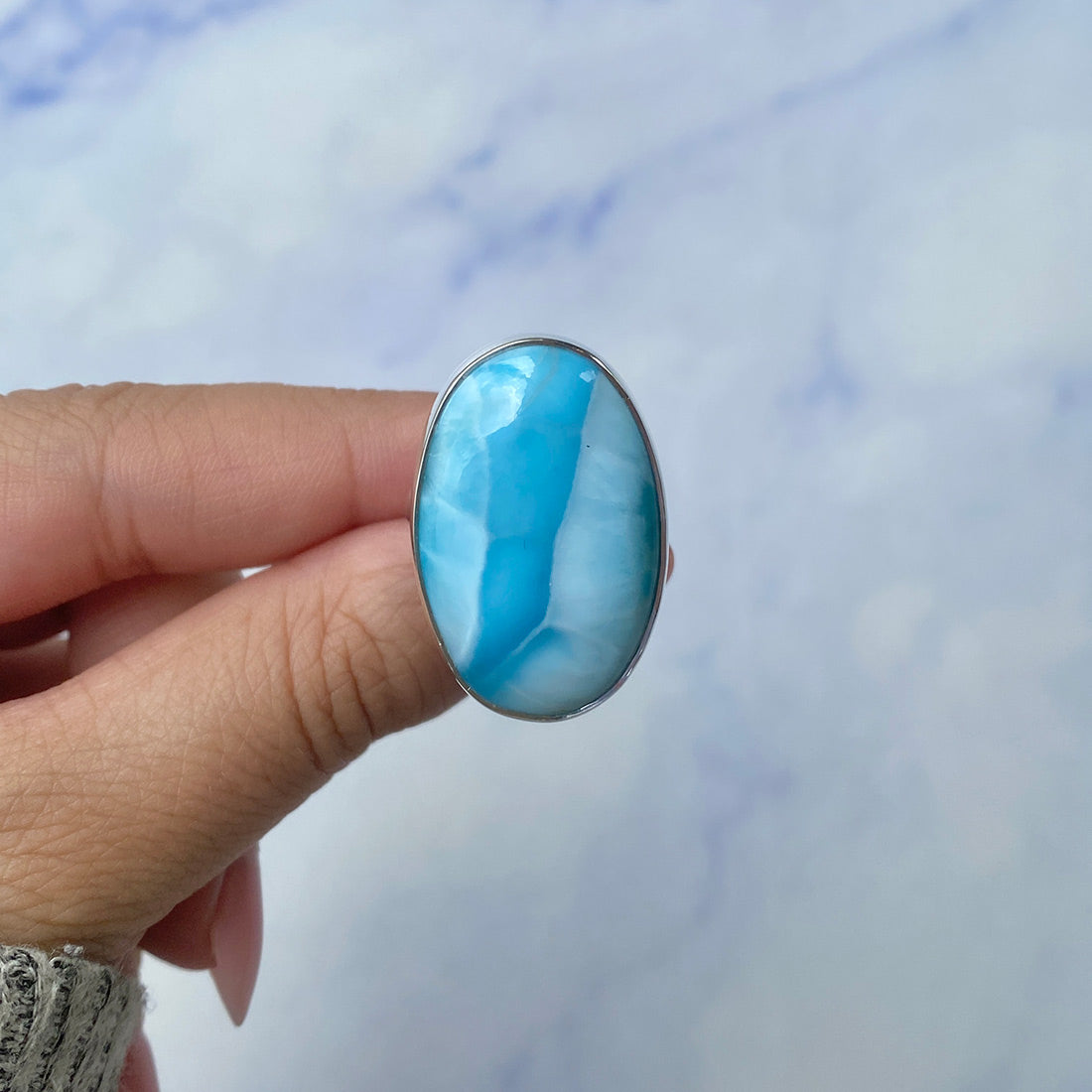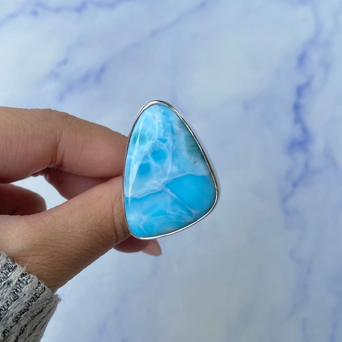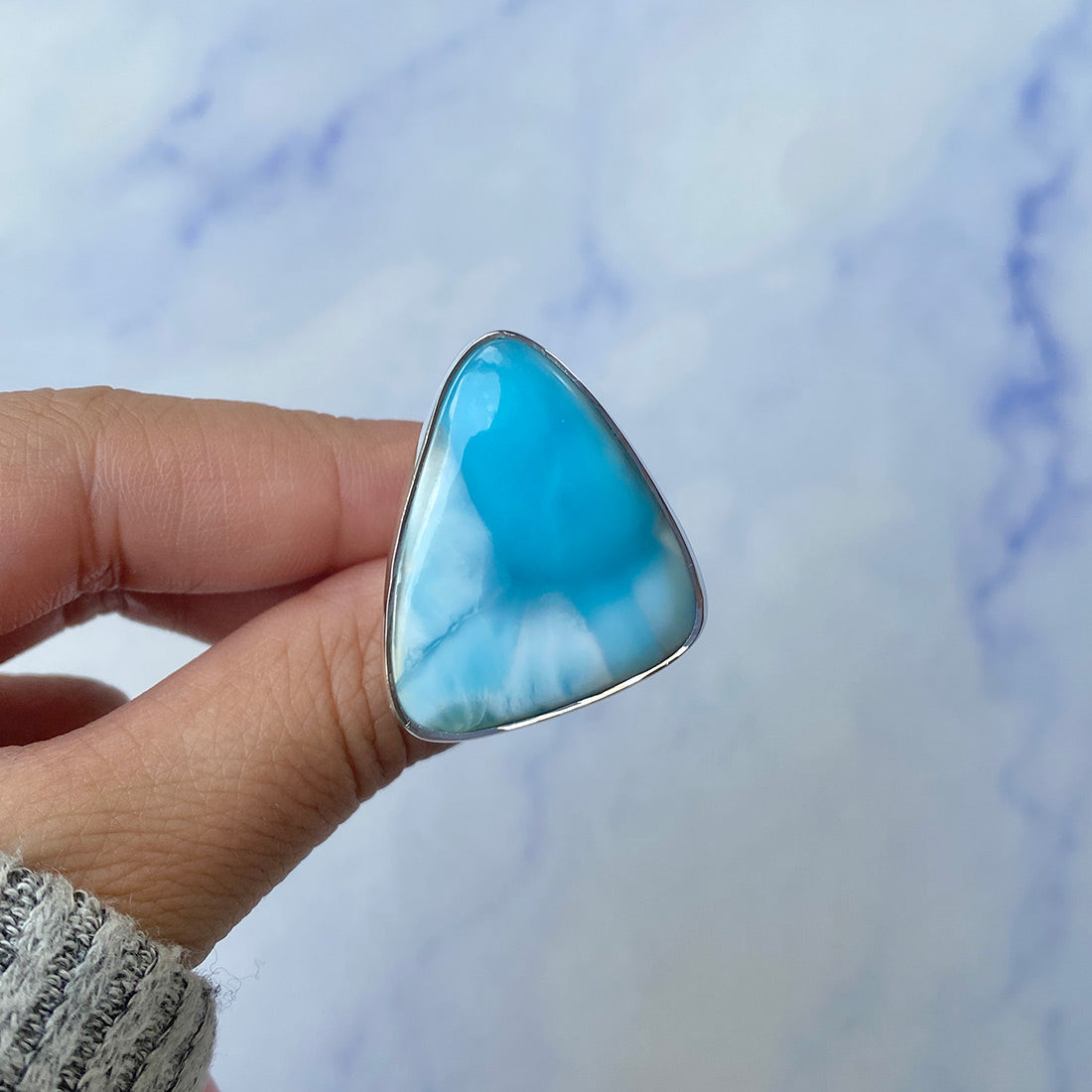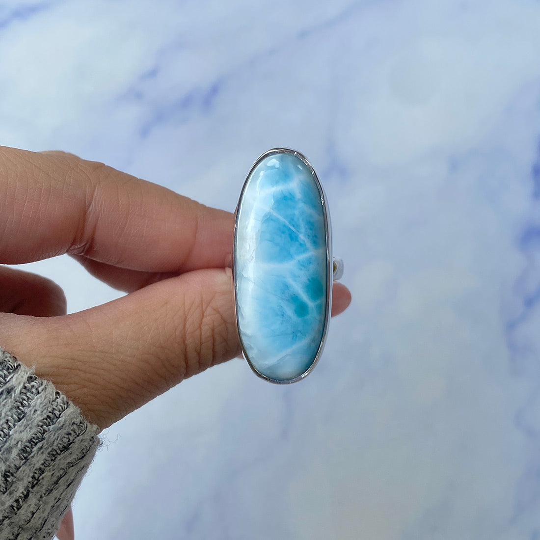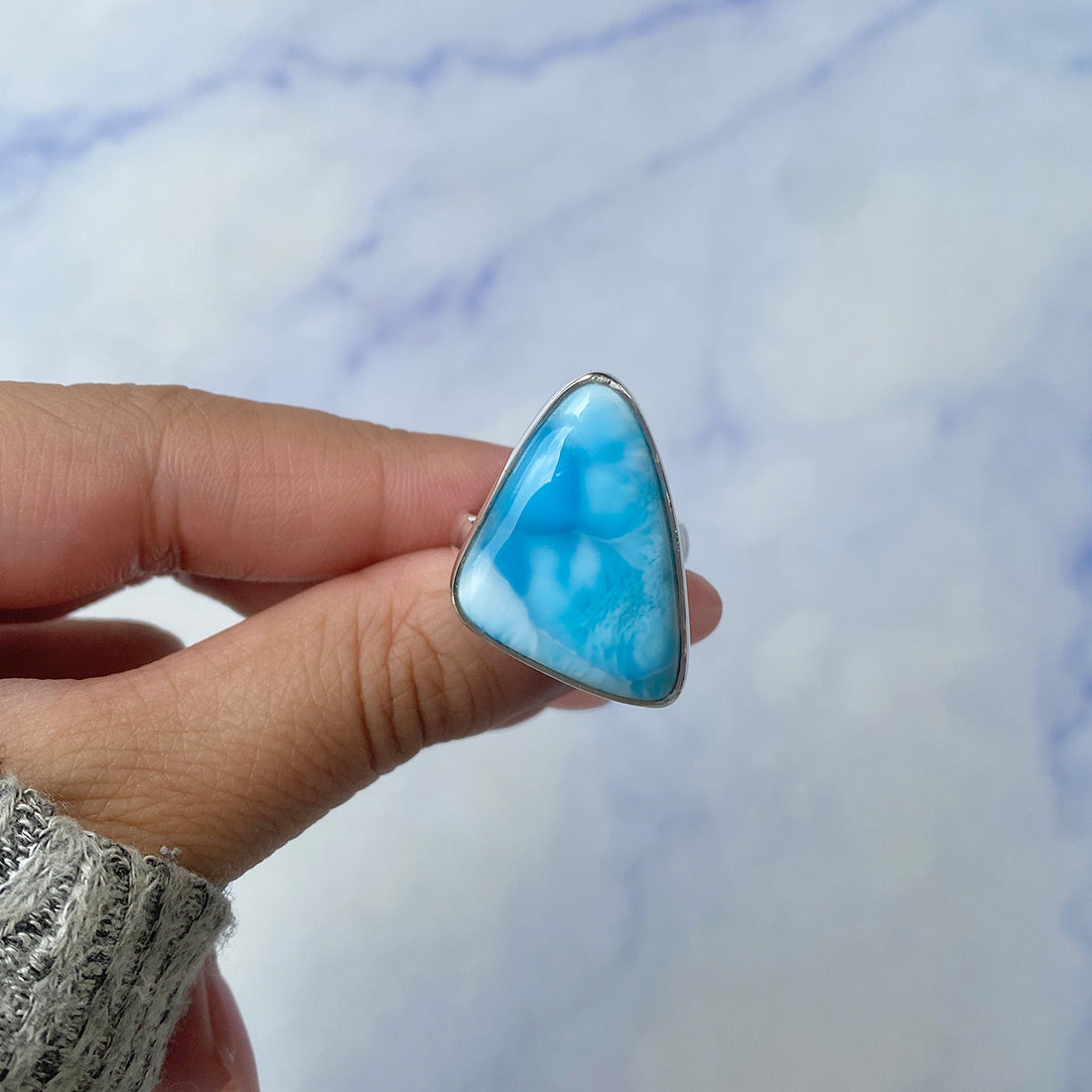 Larimar rings are thought to provide a number of therapeutic benefits. It is claimed to give relaxation and lessen tension and anxiety in the wearer by having a calming and soothing impact. Larimar's stunning blue hue is frequently connected to the sky and the ocean, fostering calm and peace. Some people think that wearing Larimar jewelry, such as Larimar bracelets, earrings, Larimar pendants, and necklaces, can aid in calming the mind and promoting inner peace.