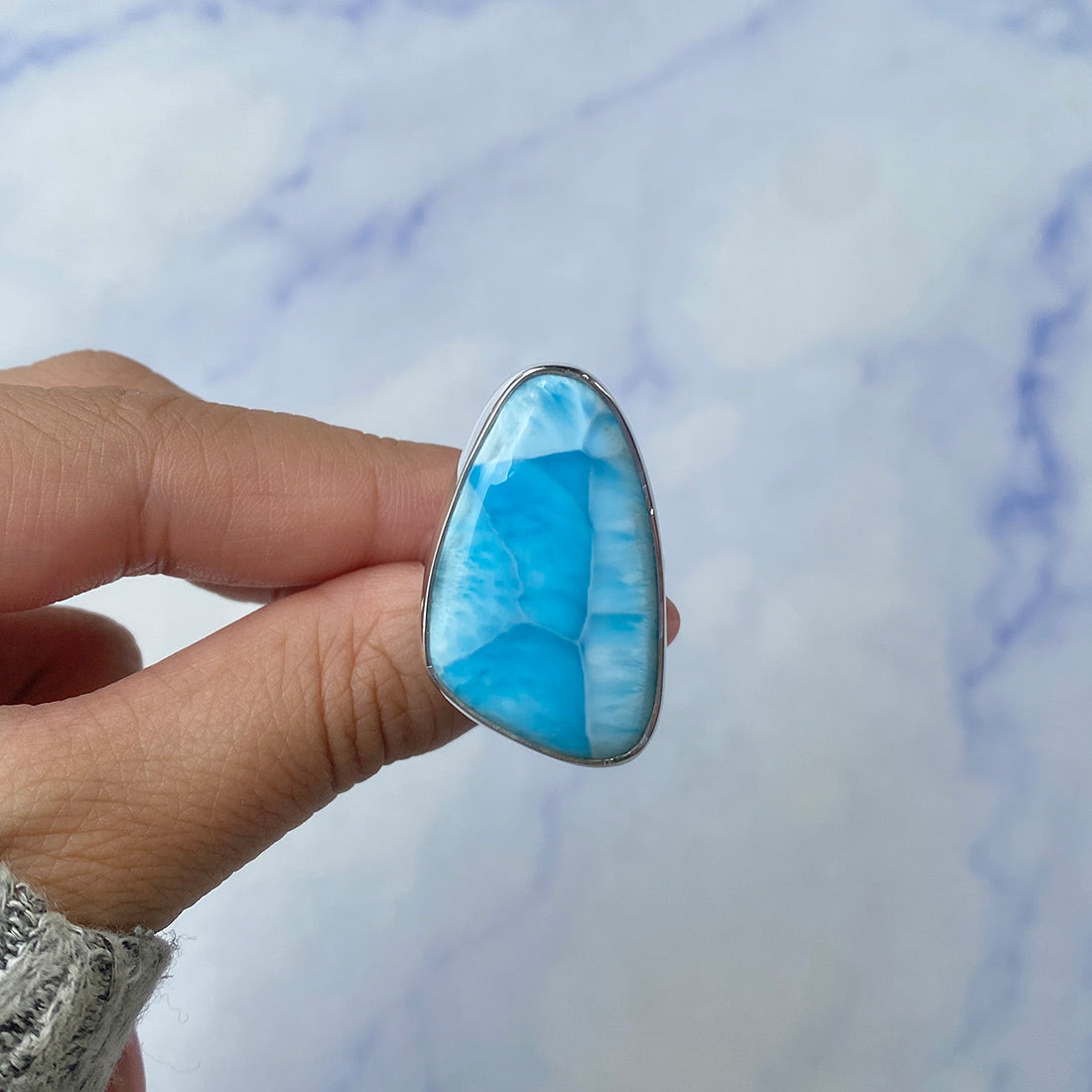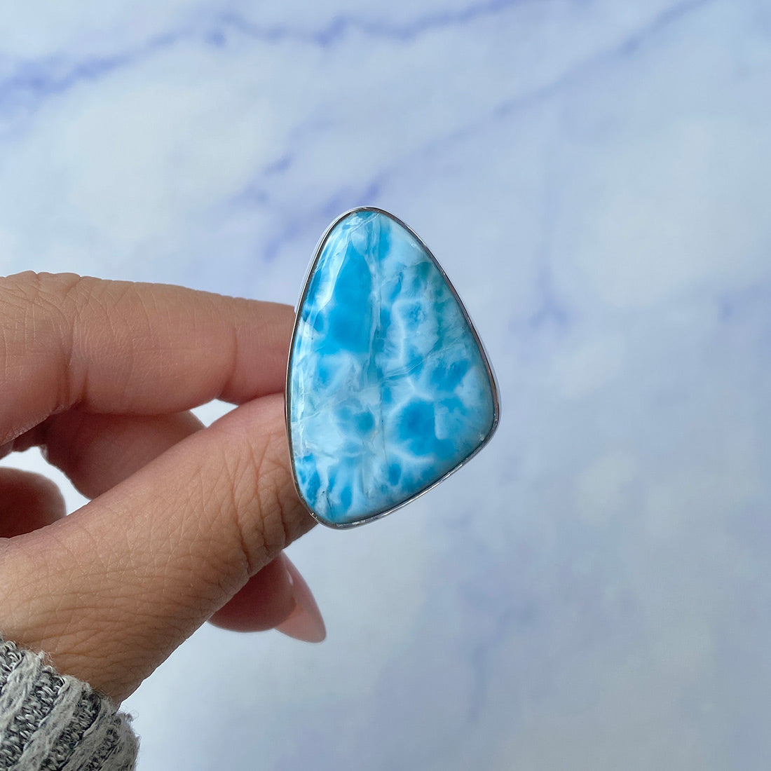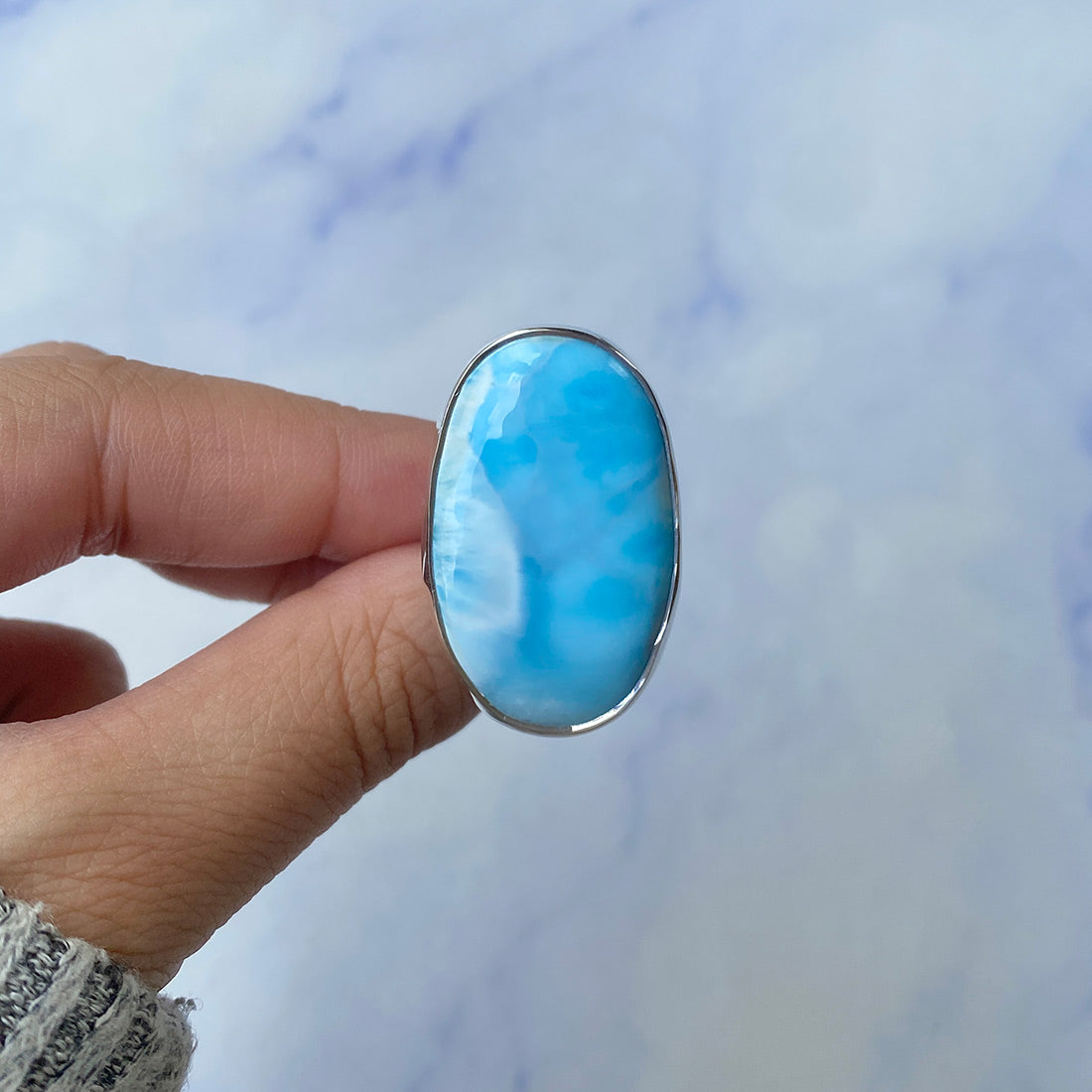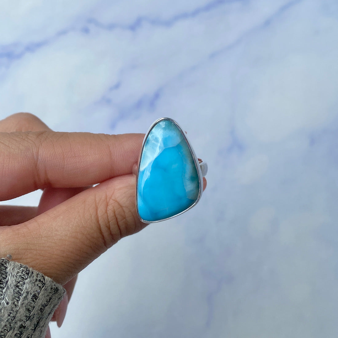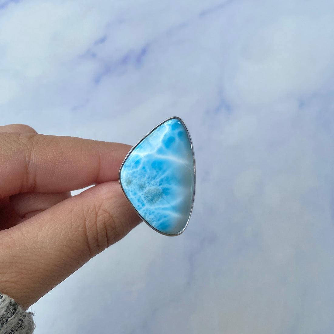 Larimar rings are thought to provide a number of therapeutic benefits. It is claimed to give relaxation and lessen tension and anxiety in the wearer by having a calming and soothing impact. Larimar's stunning blue hue is frequently connected to the sky and the ocean, fostering calm and peace. Some people think that wearing Larimar jewelry, such as Larimar bracelets, earrings, Larimar pendants, and necklaces, can aid in calming the mind and promoting inner peace.