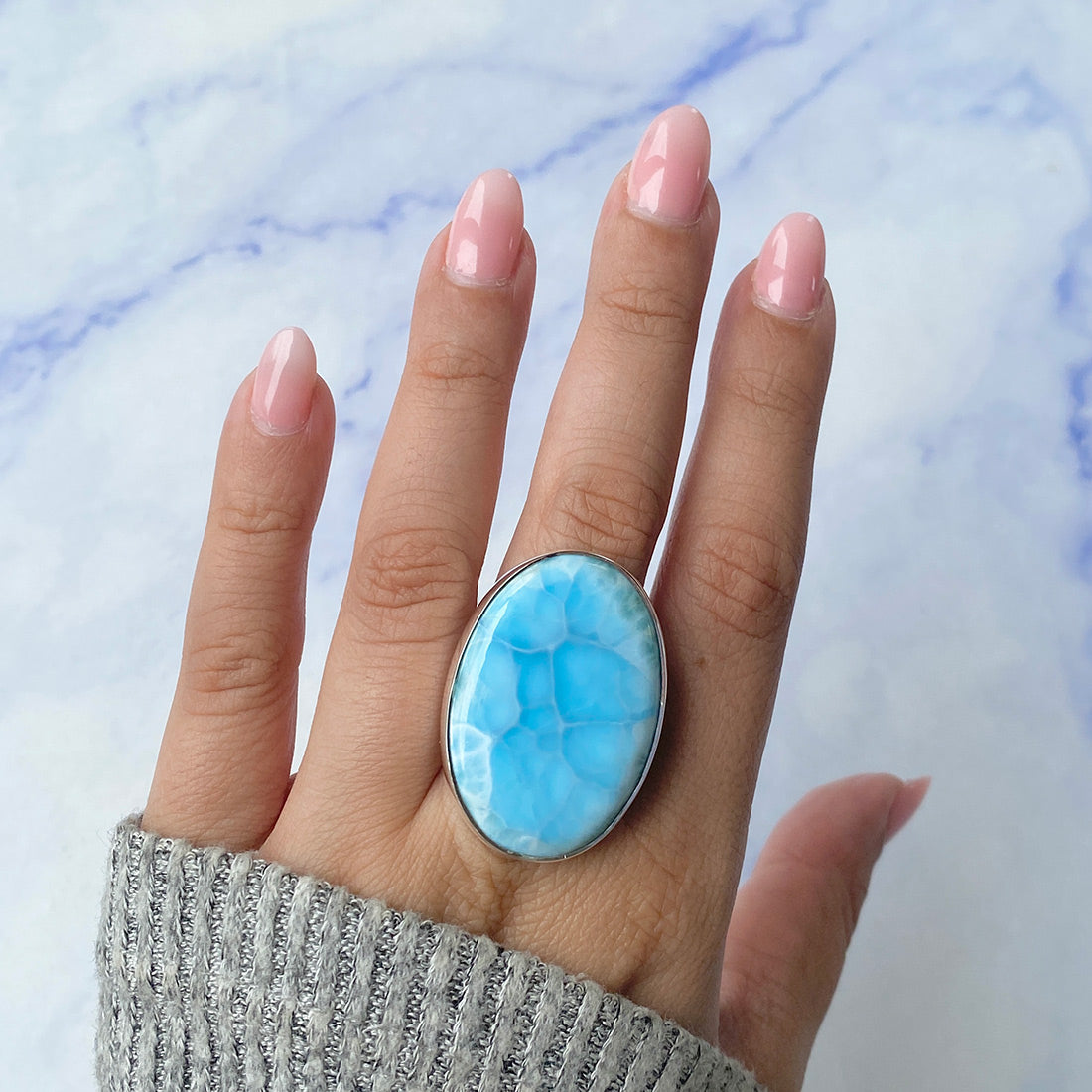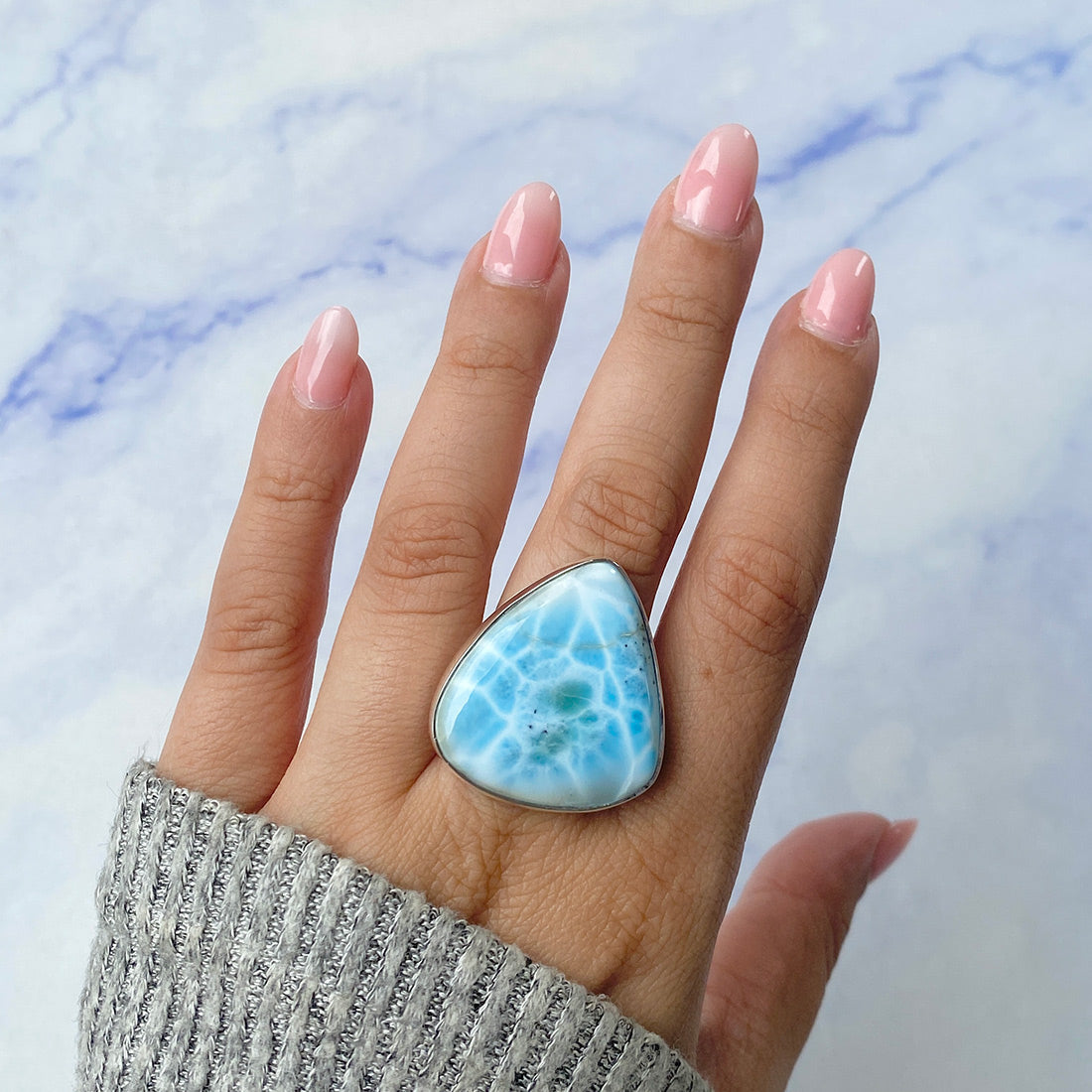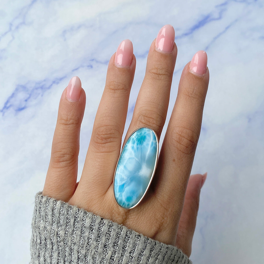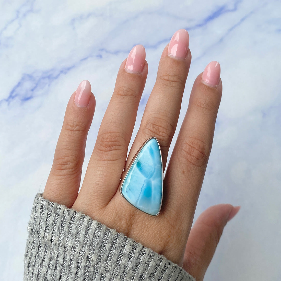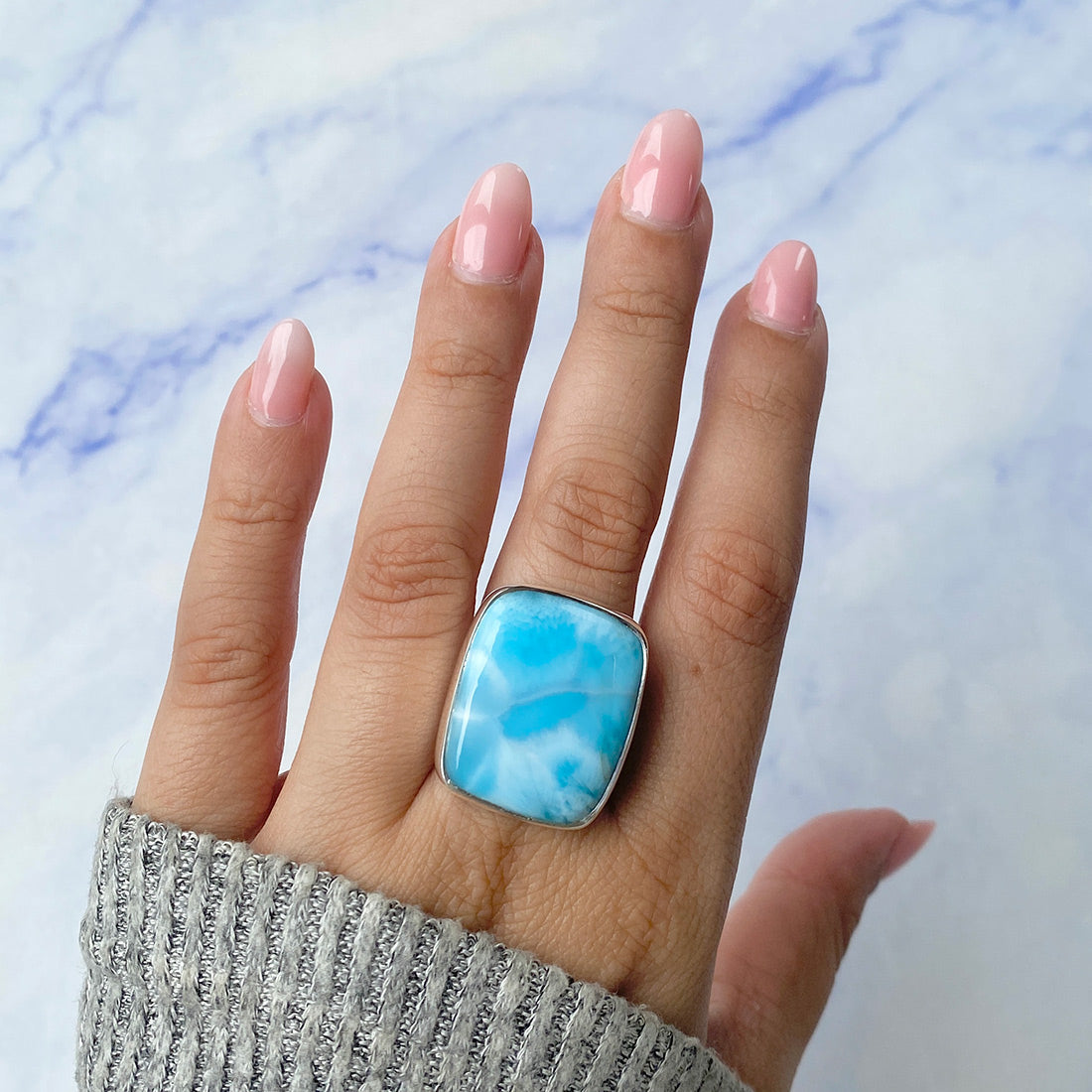 Larimar rings are thought to provide a number of therapeutic benefits. It is claimed to give relaxation and lessen tension and anxiety in the wearer by having a calming and soothing impact. Larimar's stunning blue hue is frequently connected to the sky and the ocean, fostering calm and peace. Some people think that wearing Larimar jewelry, such as Larimar bracelets, earrings, Larimar pendants, and necklaces, can aid in calming the mind and promoting inner peace.
