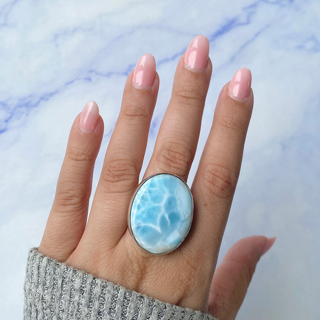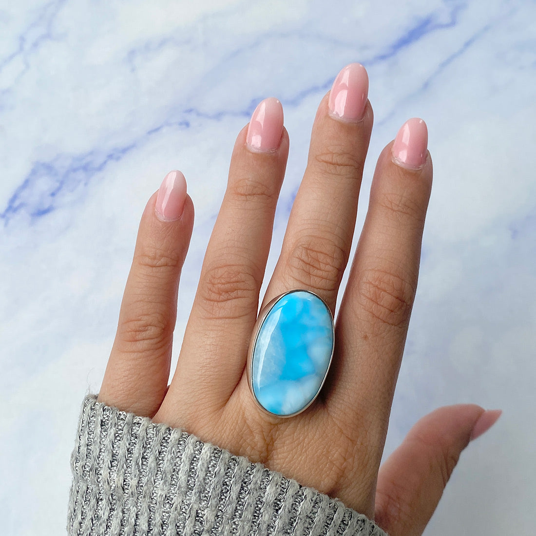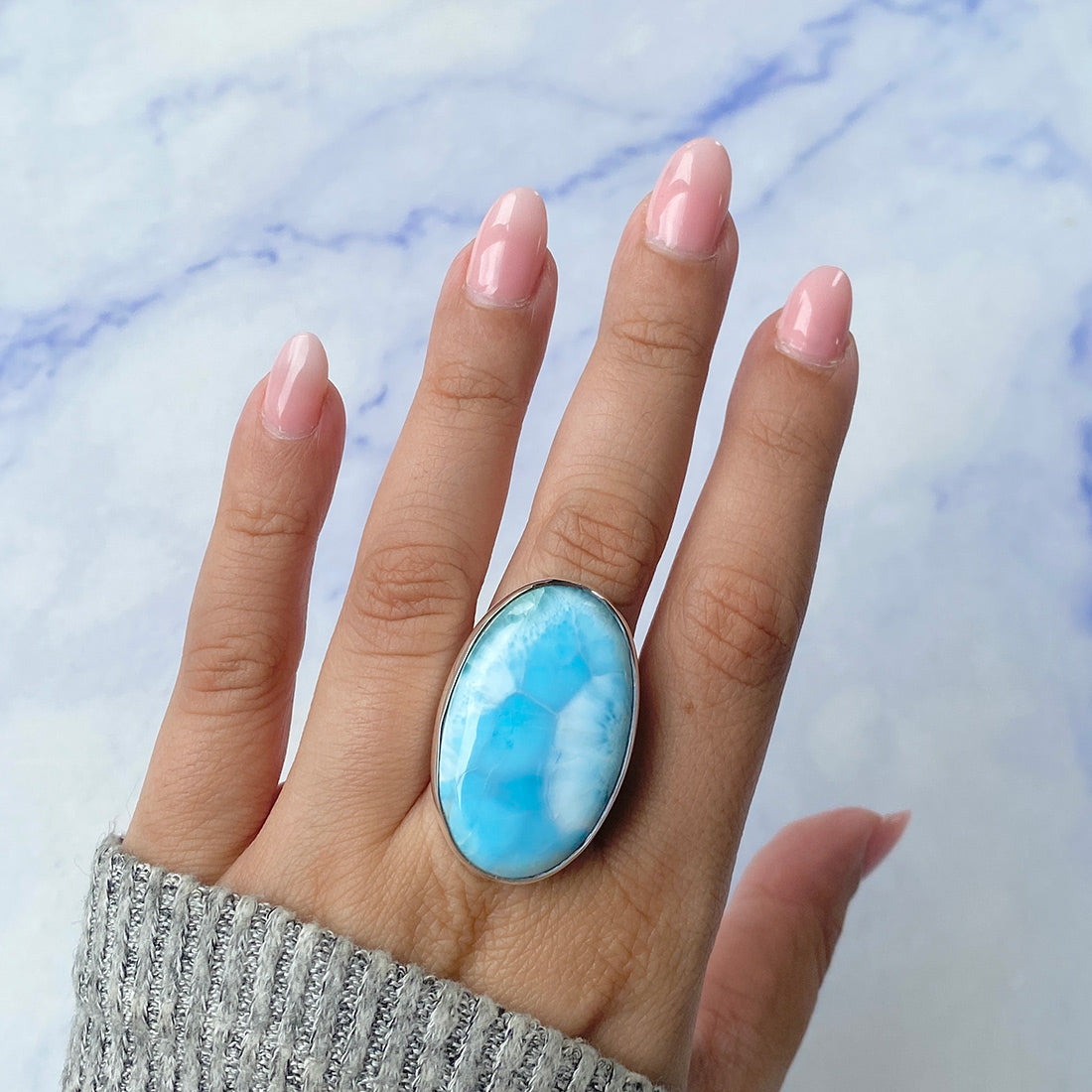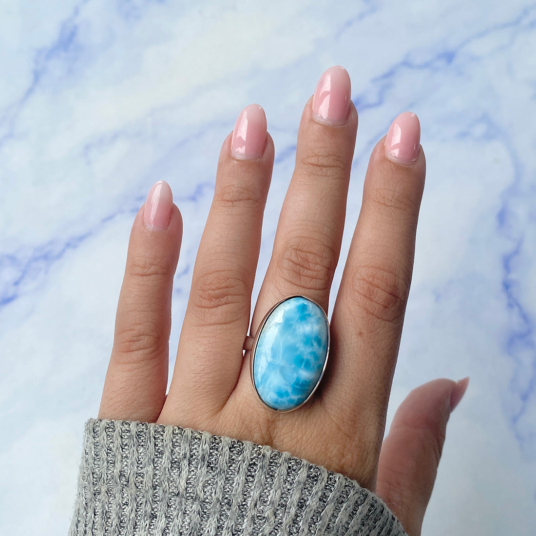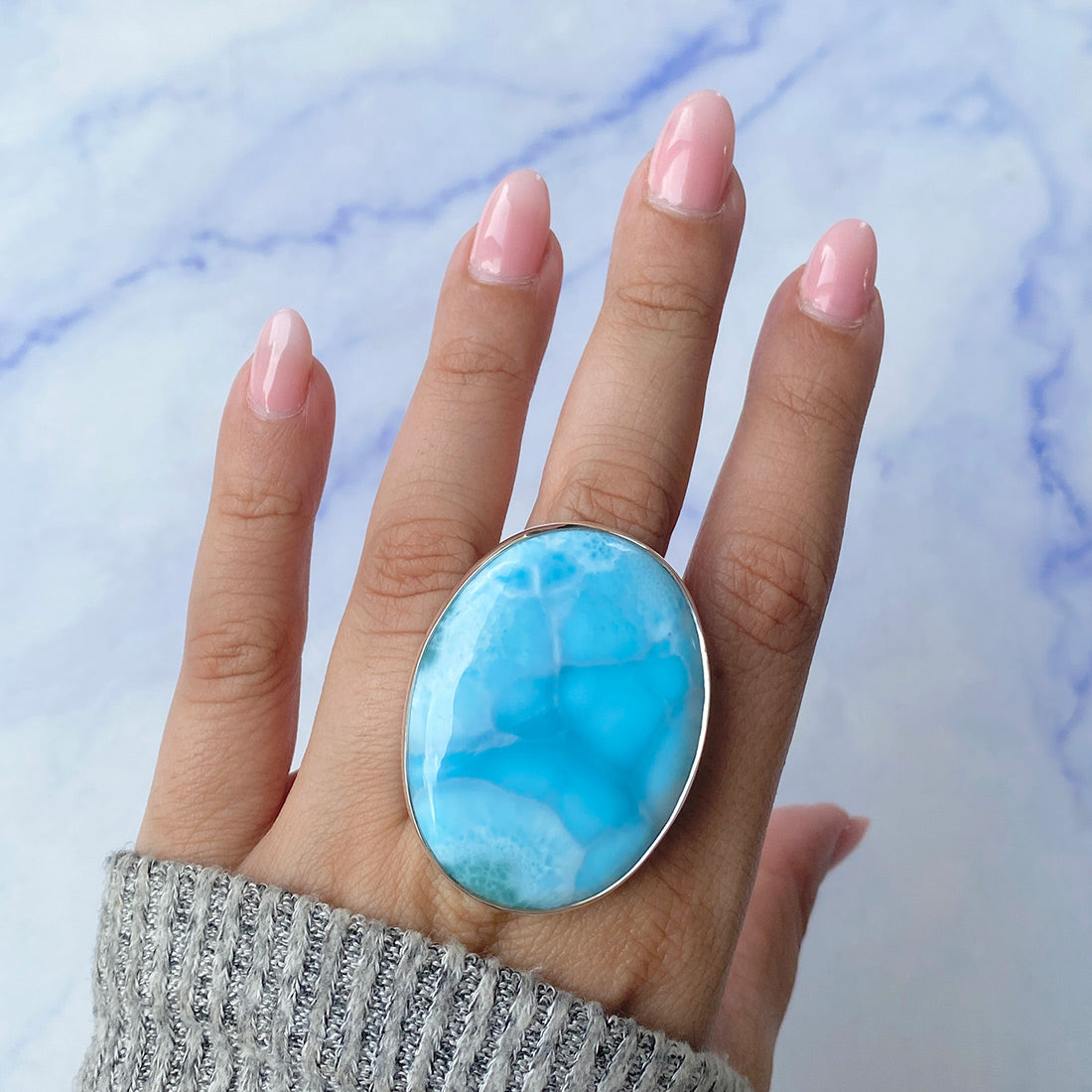 Larimar rings are thought to provide a number of therapeutic benefits. It is claimed to give relaxation and lessen tension and anxiety in the wearer by having a calming and soothing impact. Larimar's stunning blue hue is frequently connected to the sky and the ocean, fostering calm and peace. Some people think that wearing Larimar jewelry, such as Larimar bracelets, earrings, Larimar pendants, and necklaces, can aid in calming the mind and promoting inner peace.