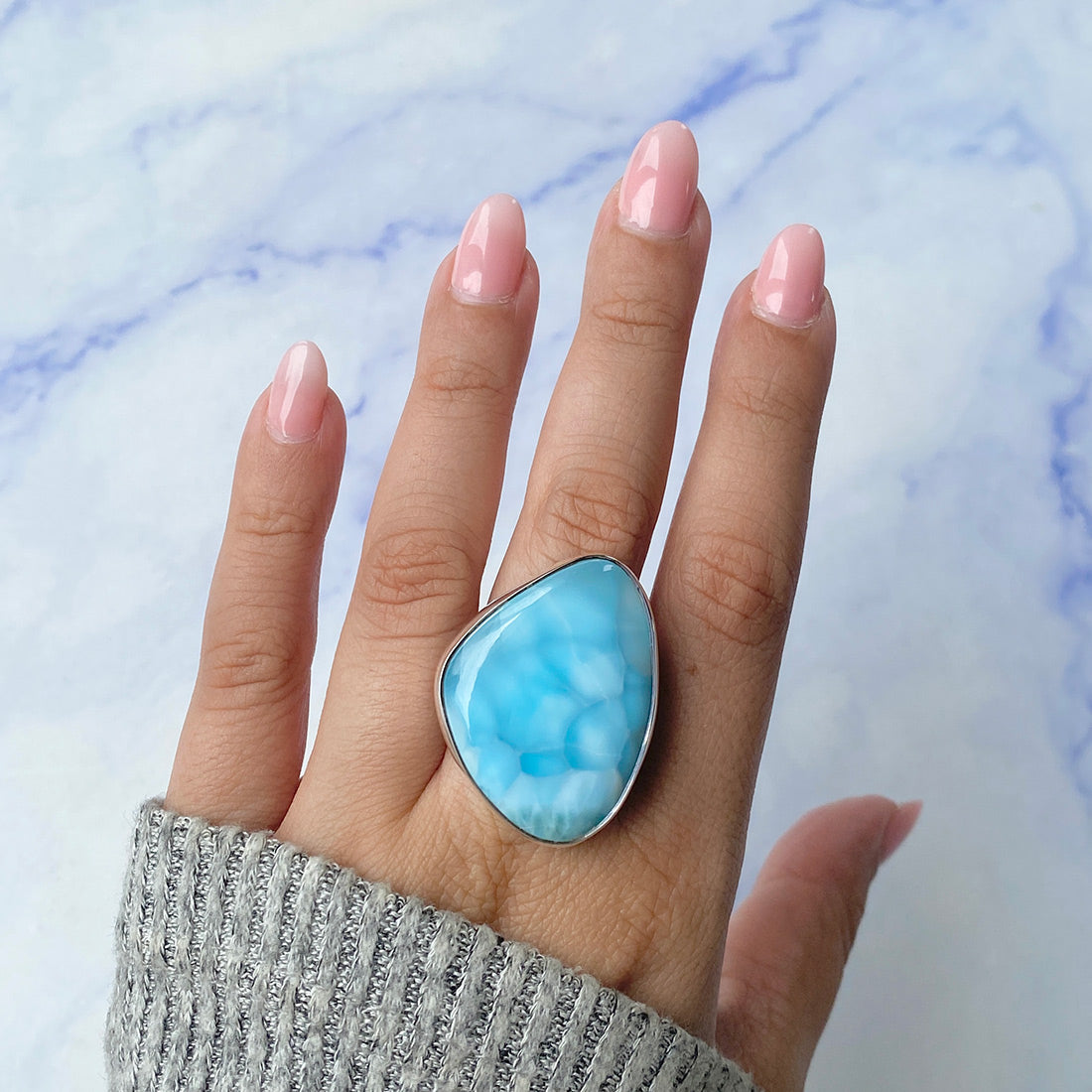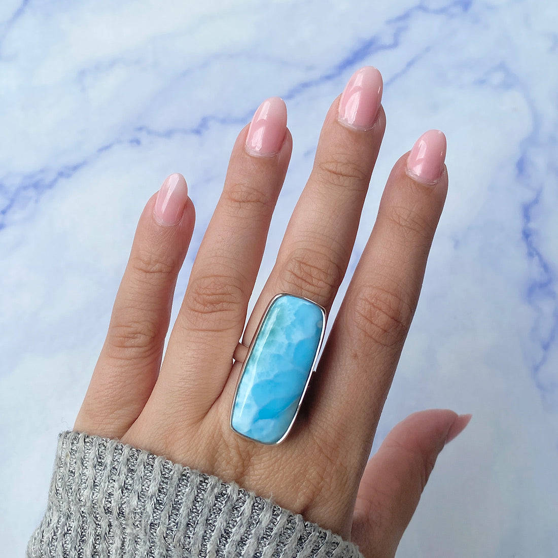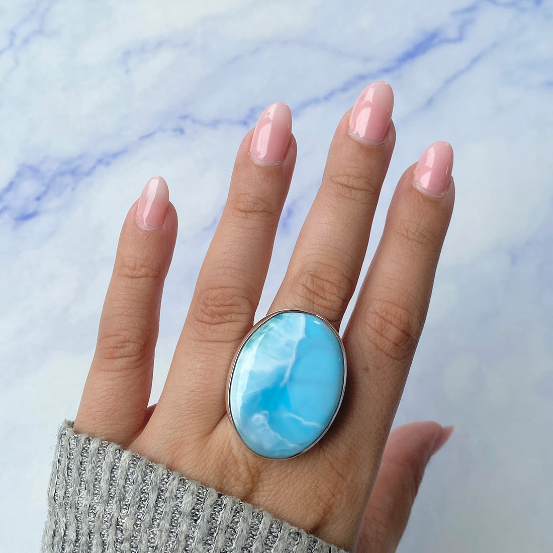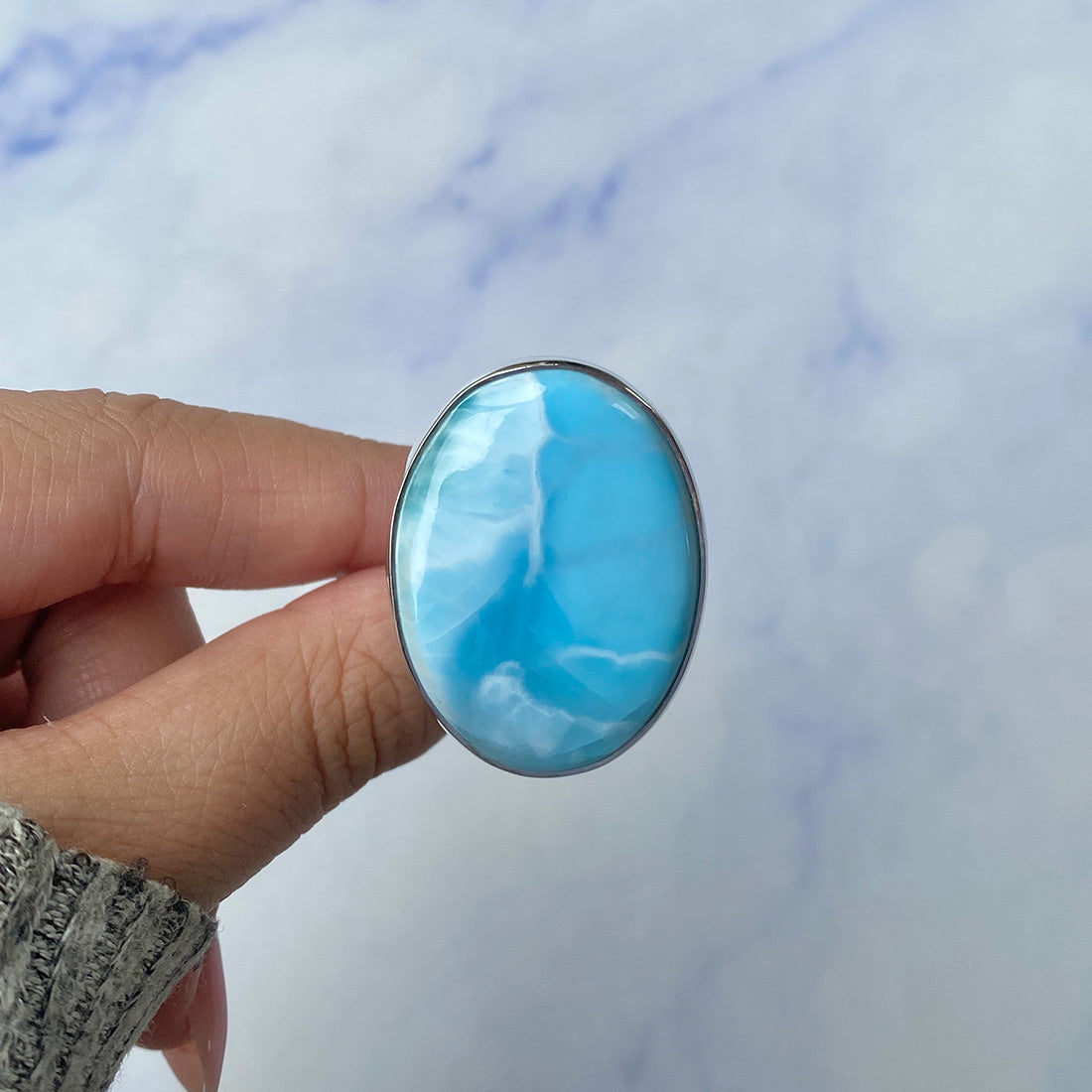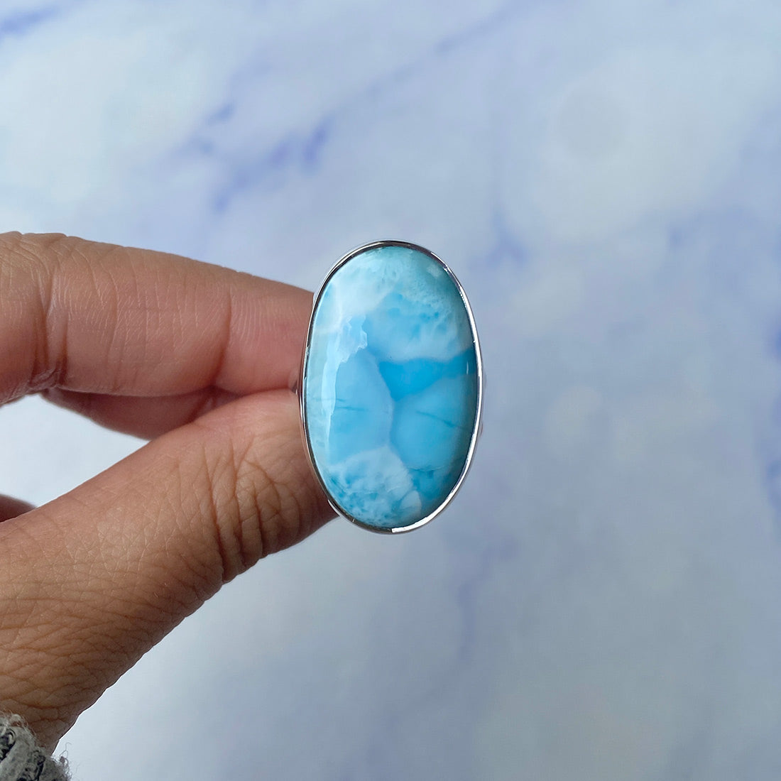 Larimar rings are thought to provide a number of therapeutic benefits. It is claimed to give relaxation and lessen tension and anxiety in the wearer by having a calming and soothing impact. Larimar's stunning blue hue is frequently connected to the sky and the ocean, fostering calm and peace. Some people think that wearing Larimar jewelry, such as Larimar bracelets, earrings, Larimar pendants, and necklaces, can aid in calming the mind and promoting inner peace.