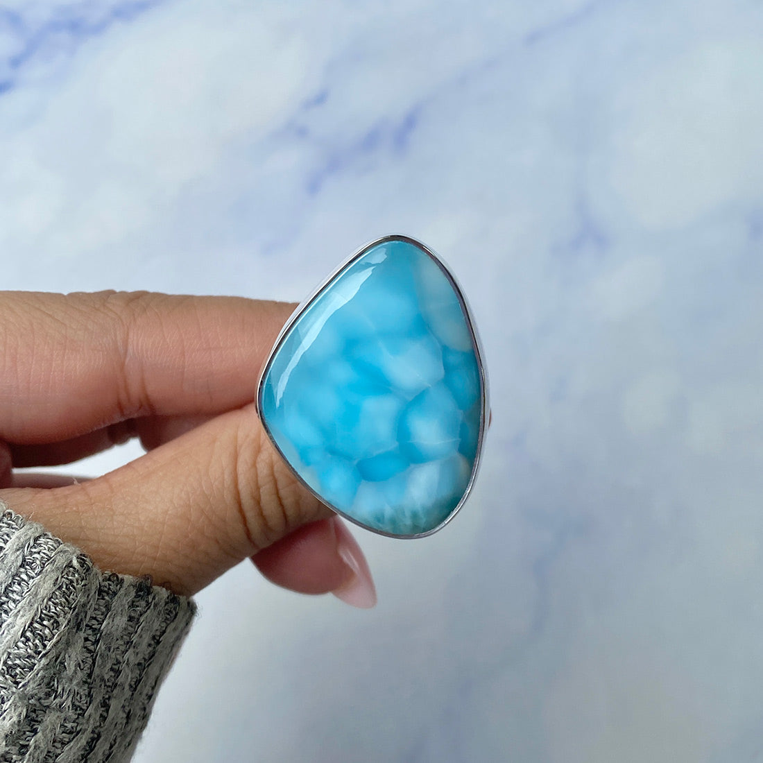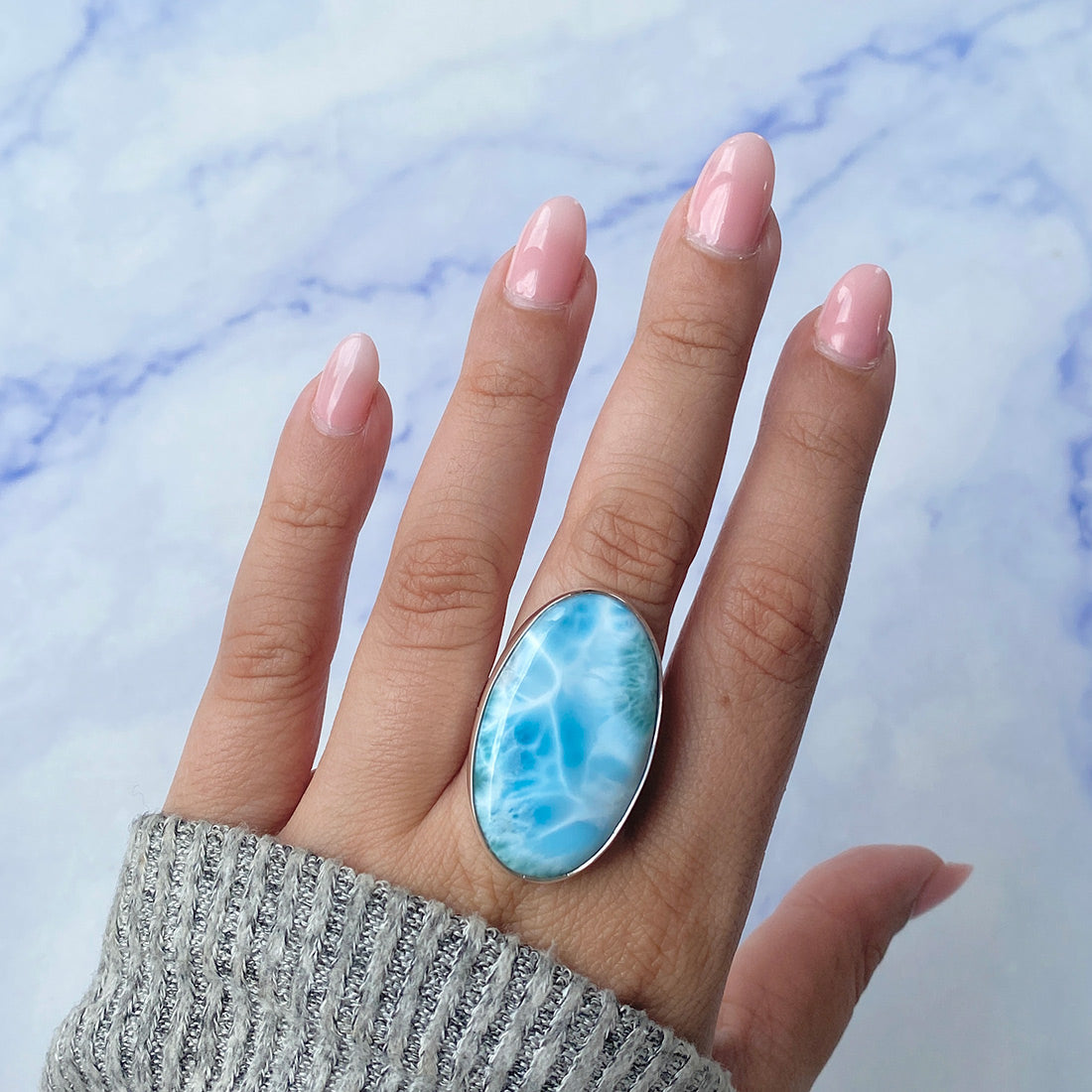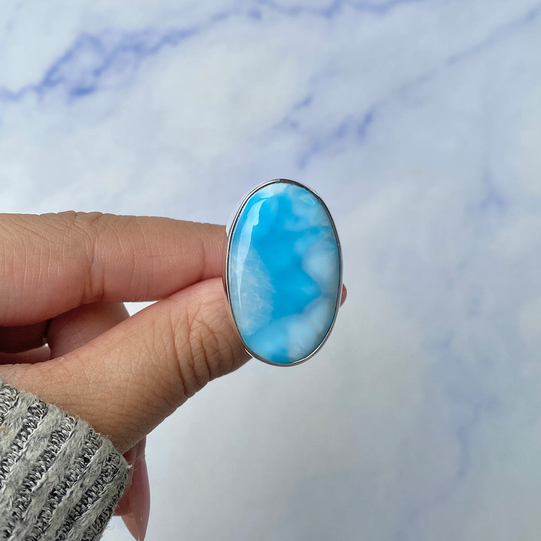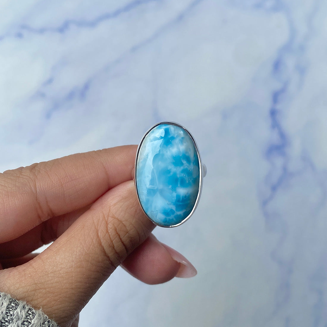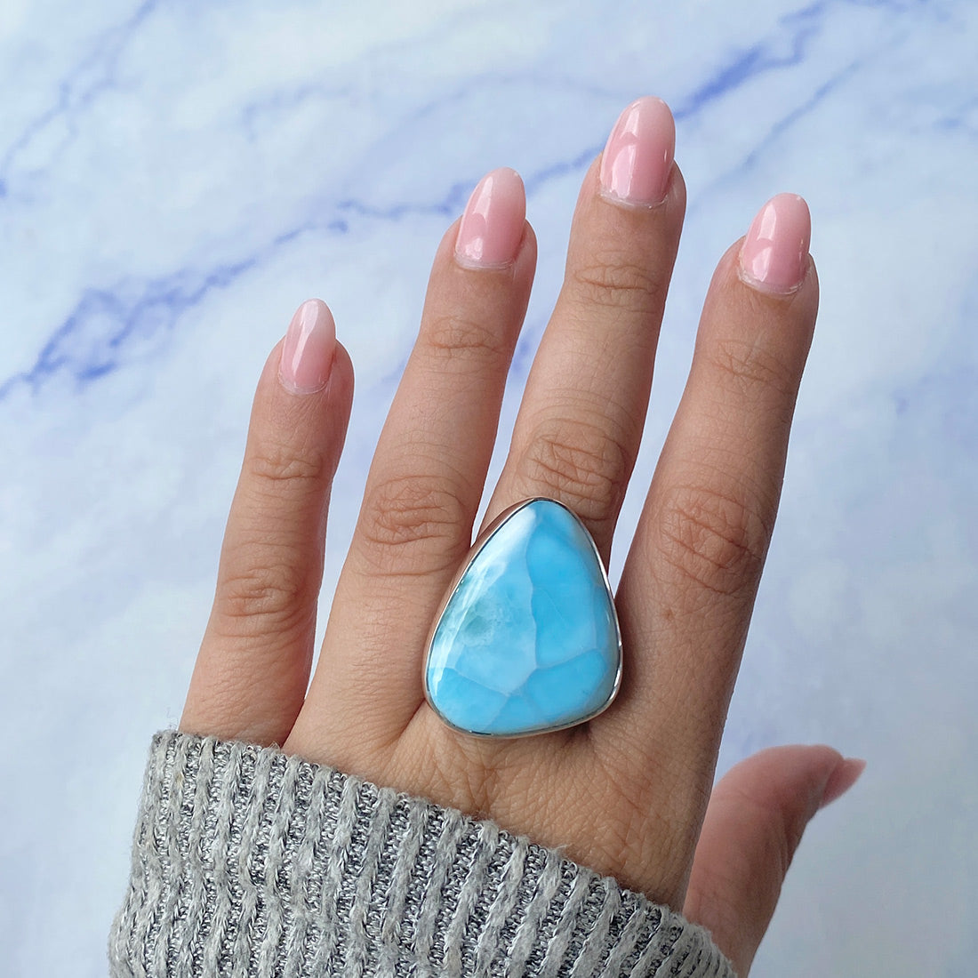 Larimar rings are thought to provide a number of therapeutic benefits. It is claimed to give relaxation and lessen tension and anxiety in the wearer by having a calming and soothing impact. Larimar's stunning blue hue is frequently connected to the sky and the ocean, fostering calm and peace. Some people think that wearing Larimar jewelry, such as Larimar bracelets, earrings, Larimar pendants, and necklaces, can aid in calming the mind and promoting inner peace.