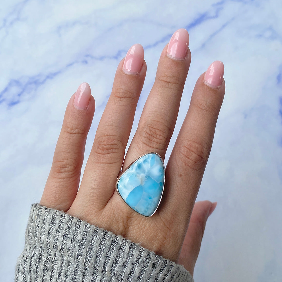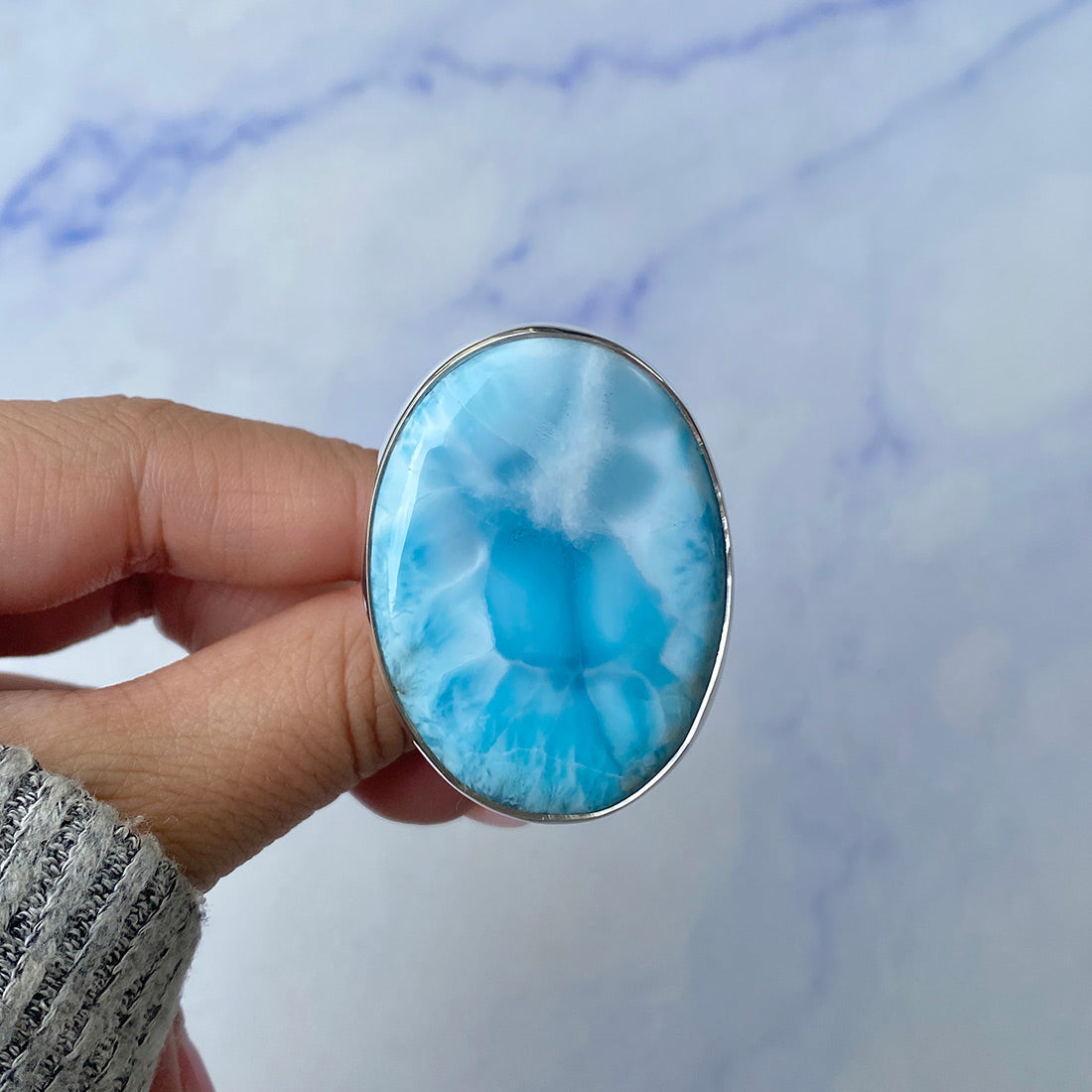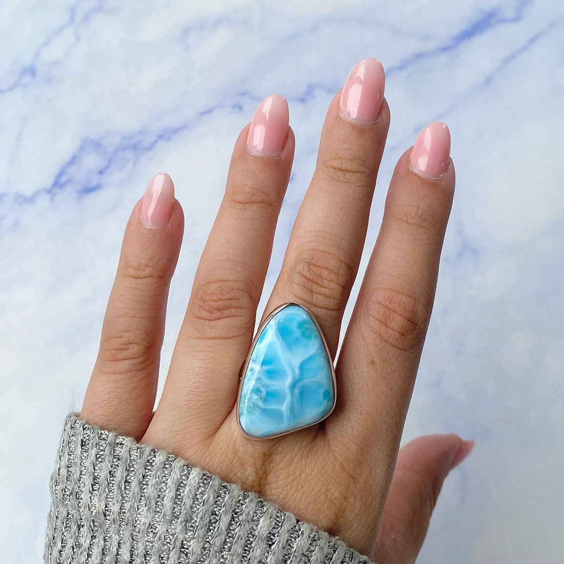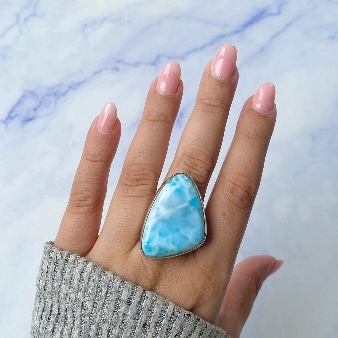 Larimar rings are thought to provide a number of therapeutic benefits. It is claimed to give relaxation and lessen tension and anxiety in the wearer by having a calming and soothing impact. Larimar's stunning blue hue is frequently connected to the sky and the ocean, fostering calm and peace. Some people think that wearing Larimar jewelry, such as Larimar bracelets, earrings, Larimar pendants, and necklaces, can aid in calming the mind and promoting inner peace.
