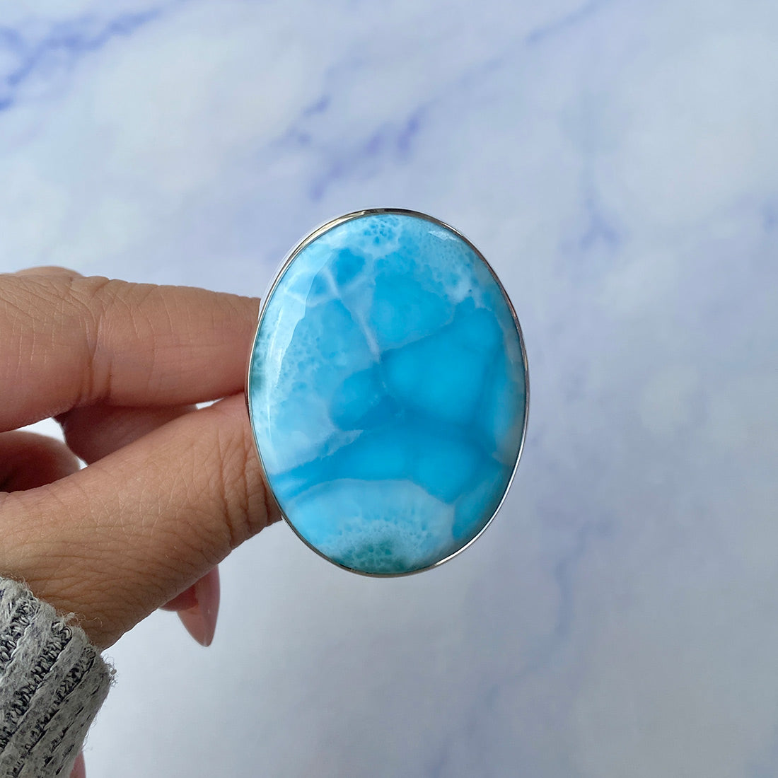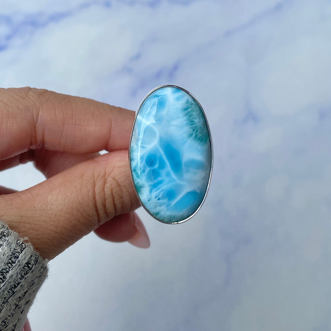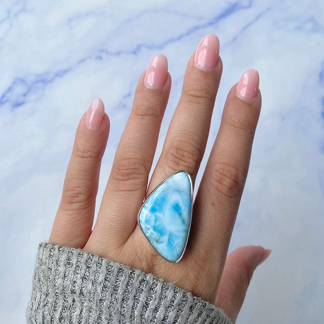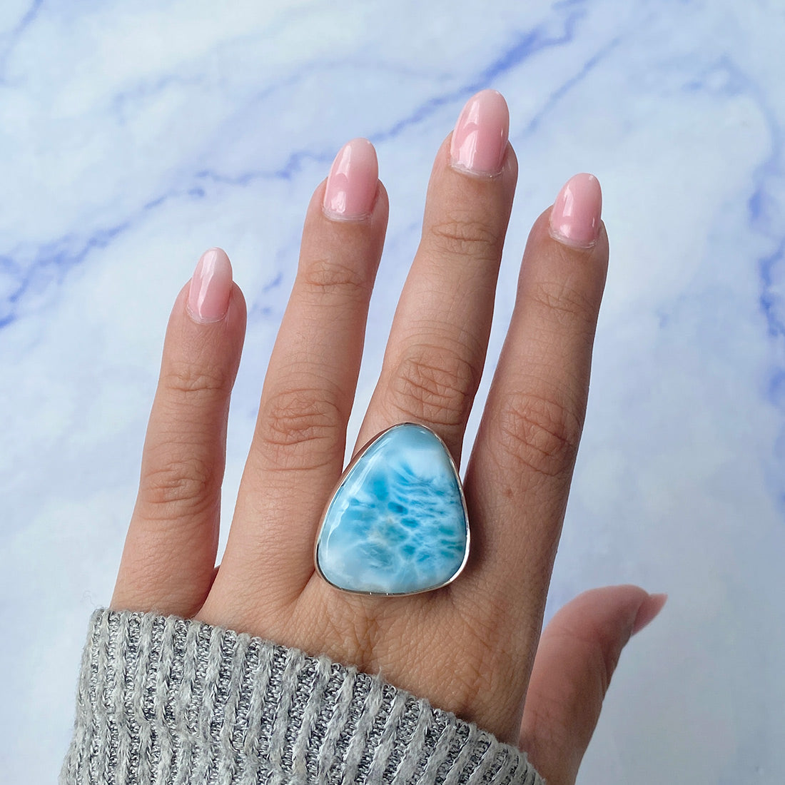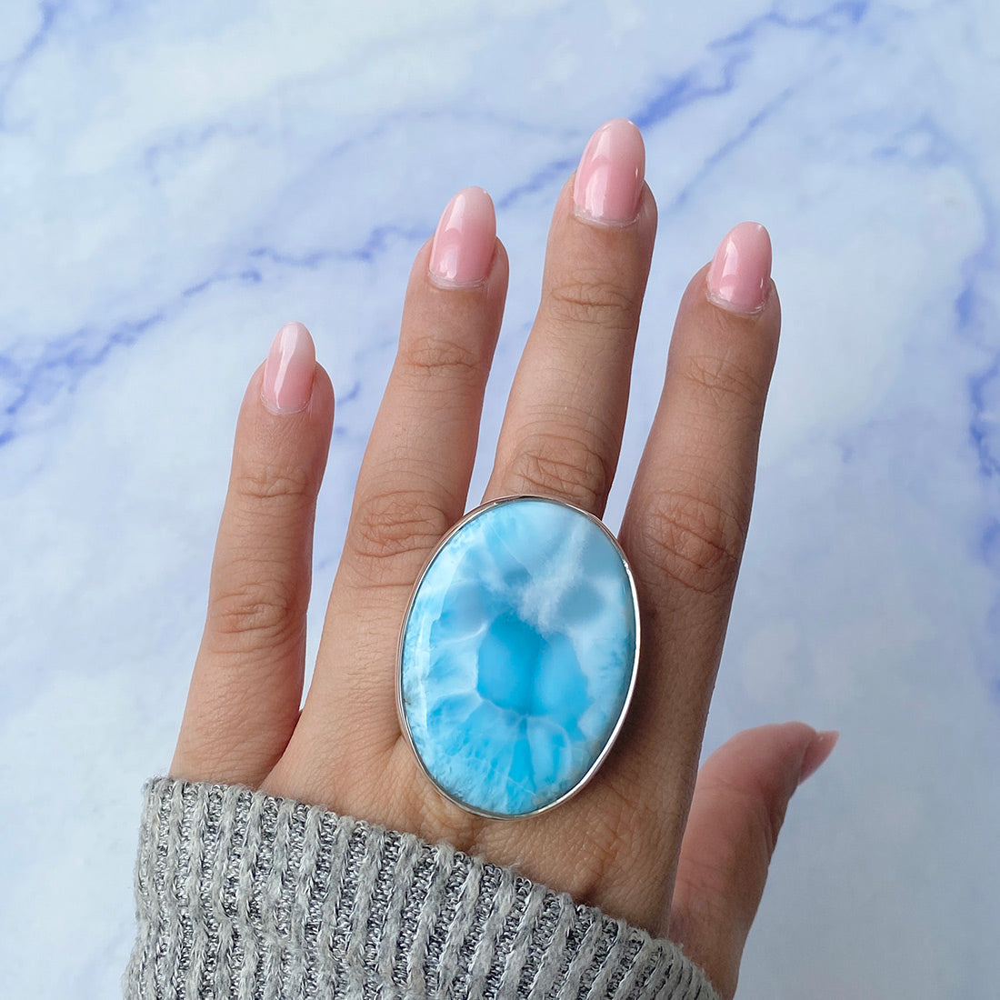 Larimar rings are thought to provide a number of therapeutic benefits. It is claimed to give relaxation and lessen tension and anxiety in the wearer by having a calming and soothing impact. Larimar's stunning blue hue is frequently connected to the sky and the ocean, fostering calm and peace. Some people think that wearing Larimar jewelry, such as Larimar bracelets, earrings, Larimar pendants, and necklaces, can aid in calming the mind and promoting inner peace.