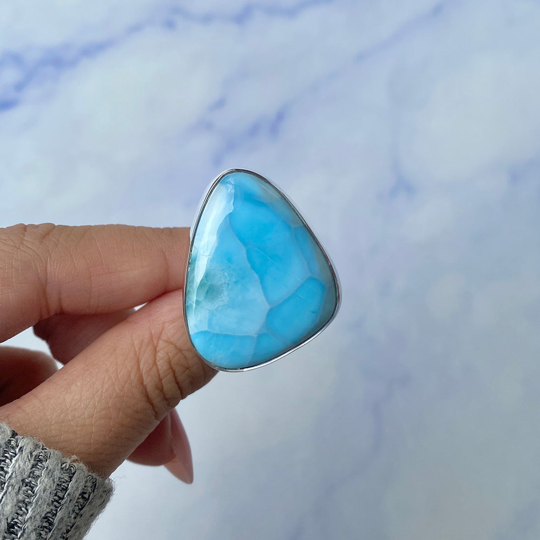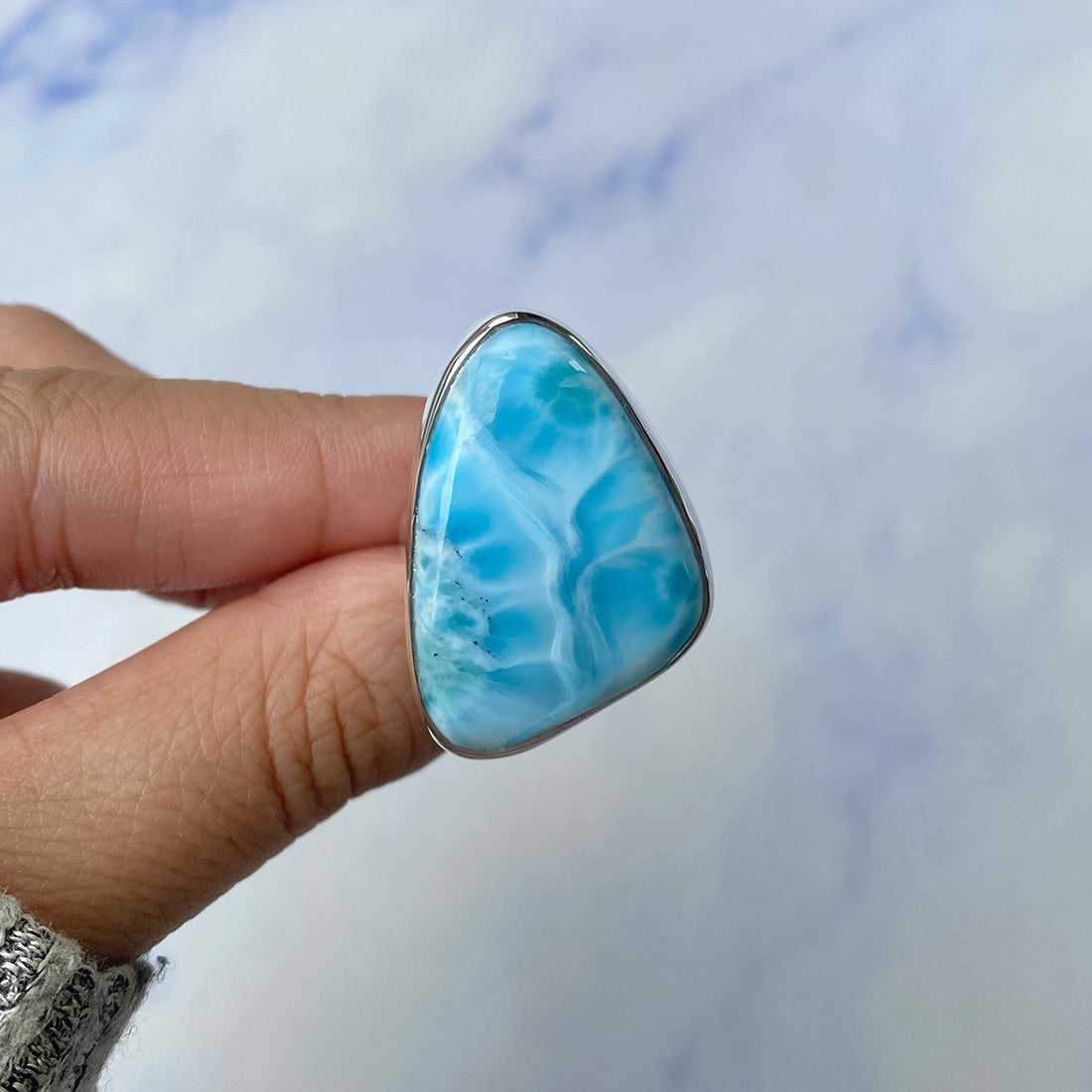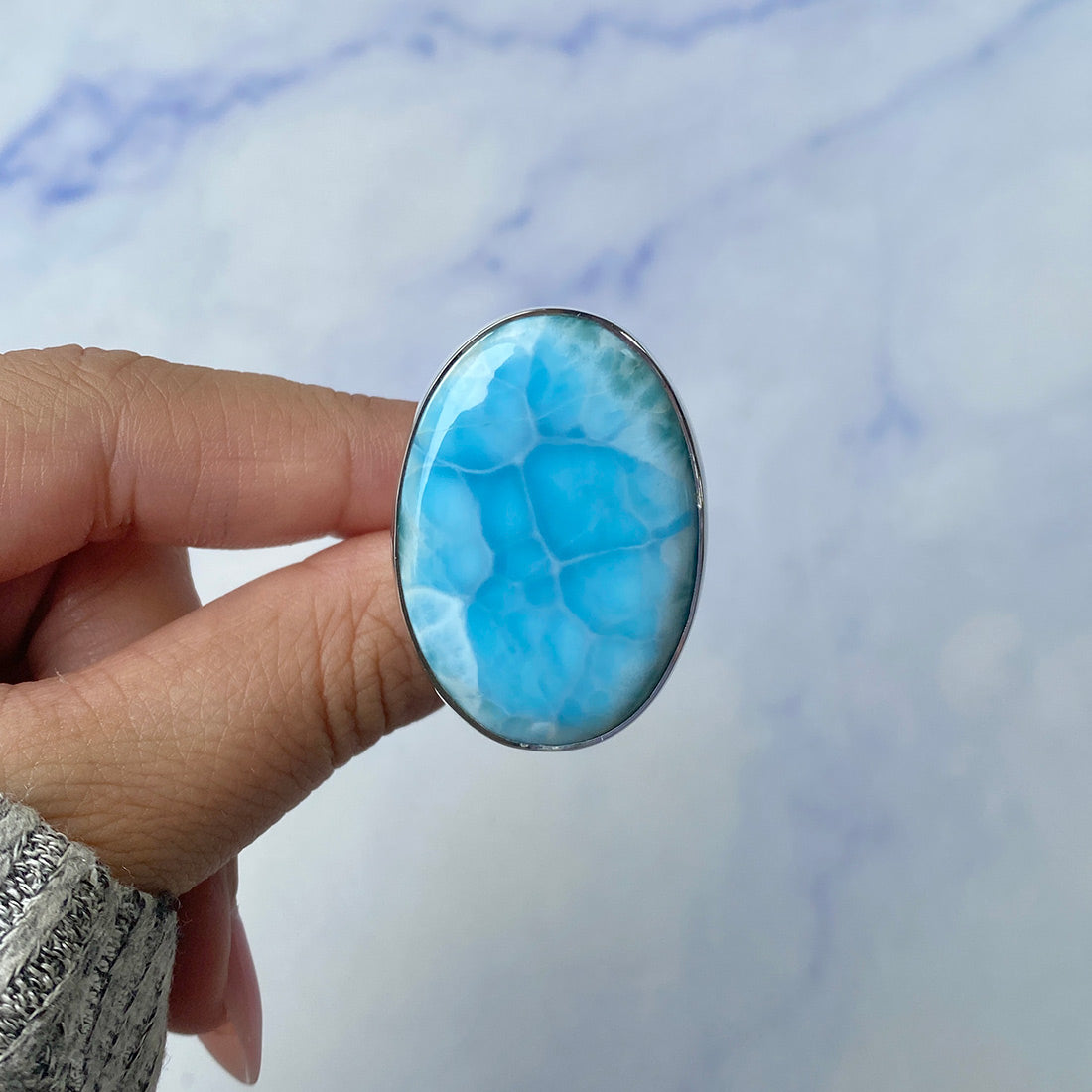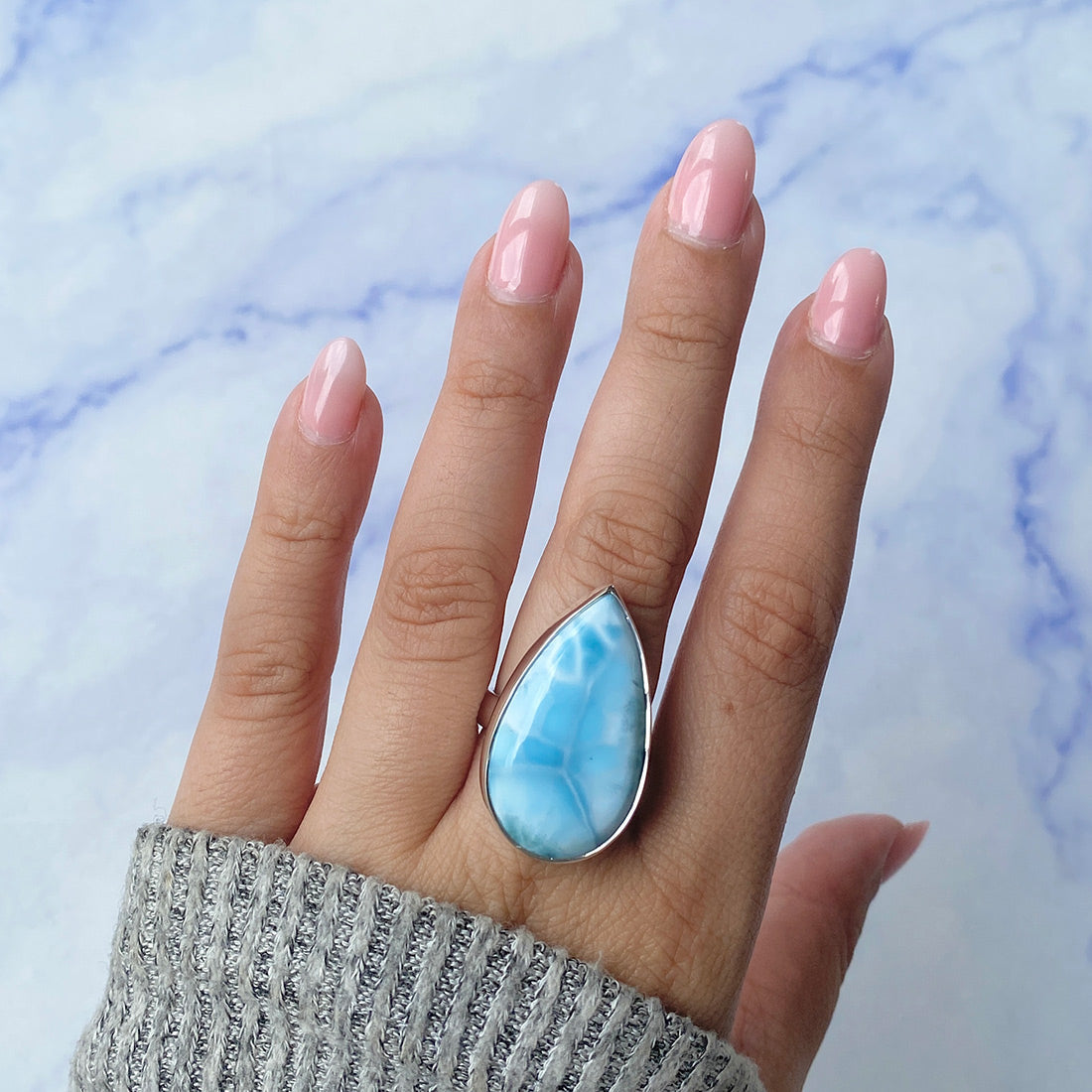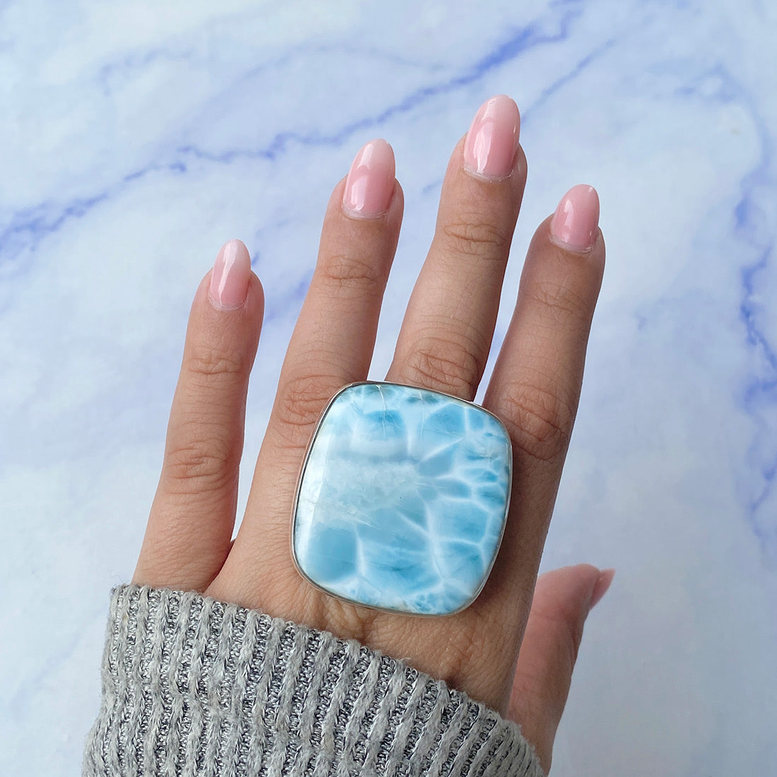 Larimar rings are thought to provide a number of therapeutic benefits. It is claimed to give relaxation and lessen tension and anxiety in the wearer by having a calming and soothing impact. Larimar's stunning blue hue is frequently connected to the sky and the ocean, fostering calm and peace. Some people think that wearing Larimar jewelry, such as Larimar bracelets, earrings, Larimar pendants, and necklaces, can aid in calming the mind and promoting inner peace.
