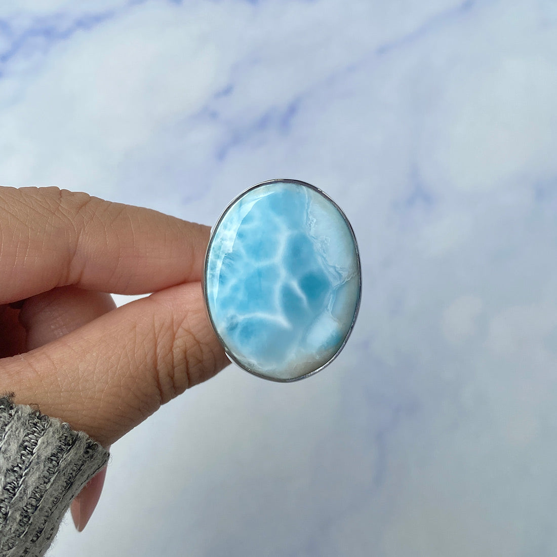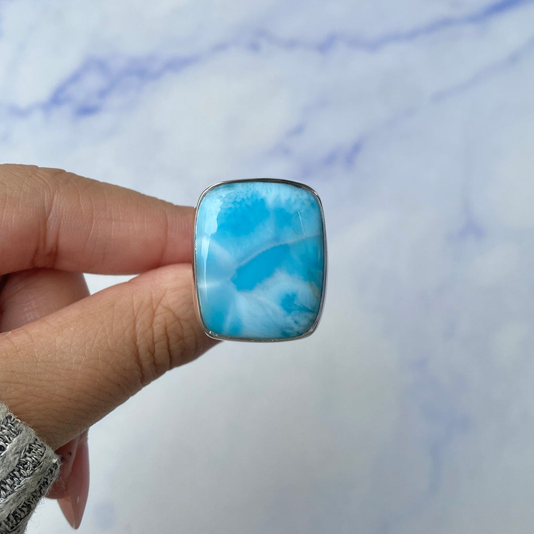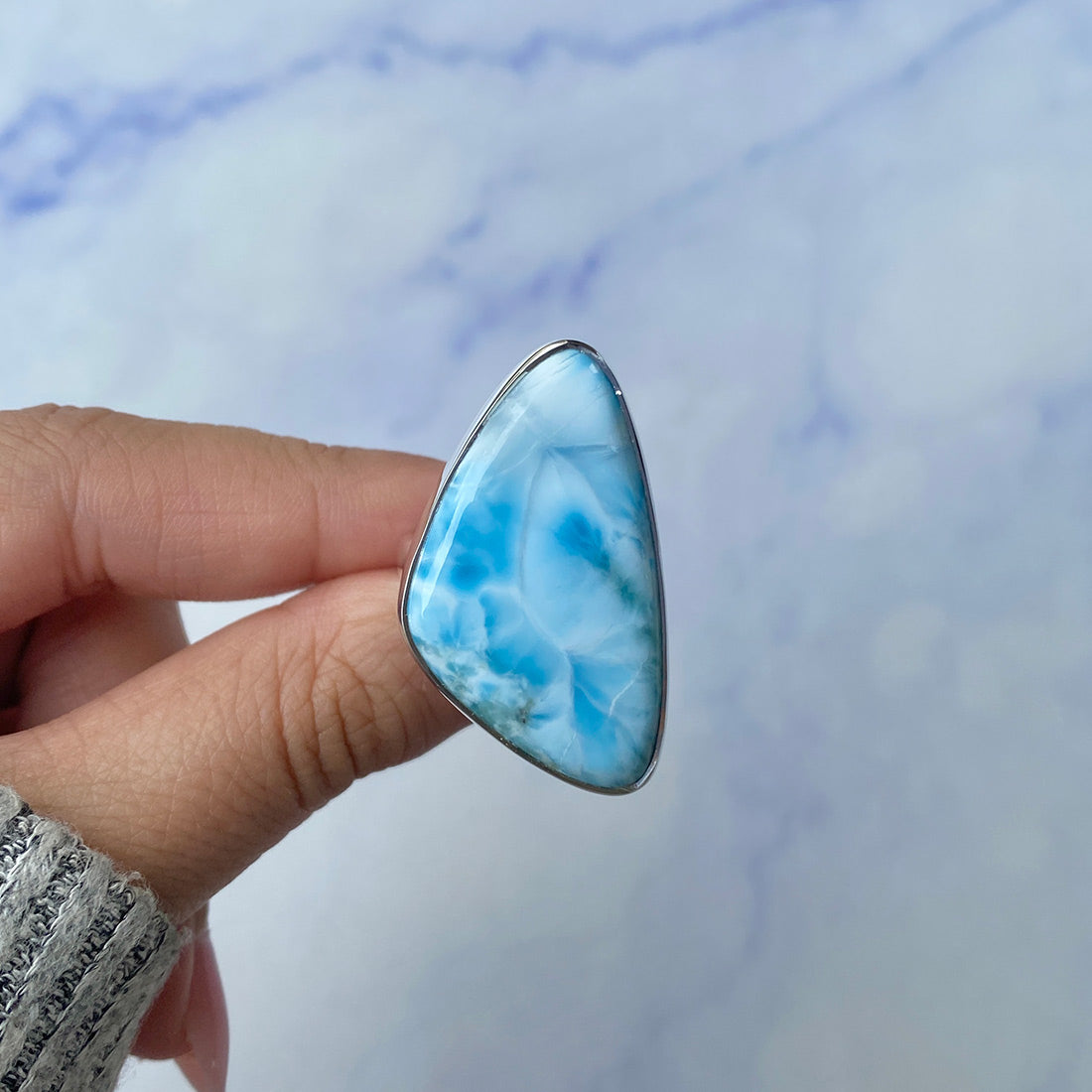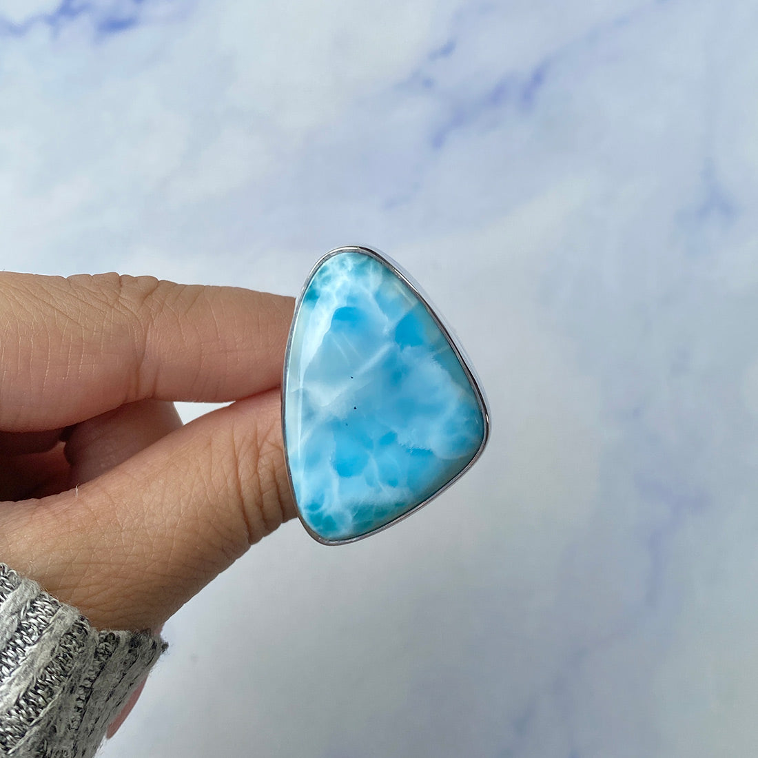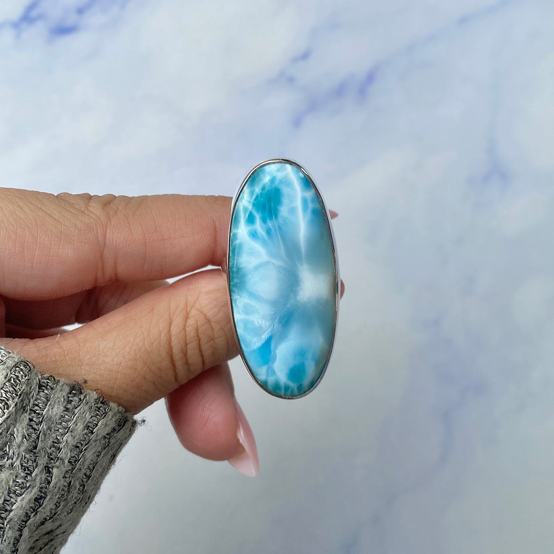 Larimar rings are thought to provide a number of therapeutic benefits. It is claimed to give relaxation and lessen tension and anxiety in the wearer by having a calming and soothing impact. Larimar's stunning blue hue is frequently connected to the sky and the ocean, fostering calm and peace. Some people think that wearing Larimar jewelry, such as Larimar bracelets, earrings, Larimar pendants, and necklaces, can aid in calming the mind and promoting inner peace.