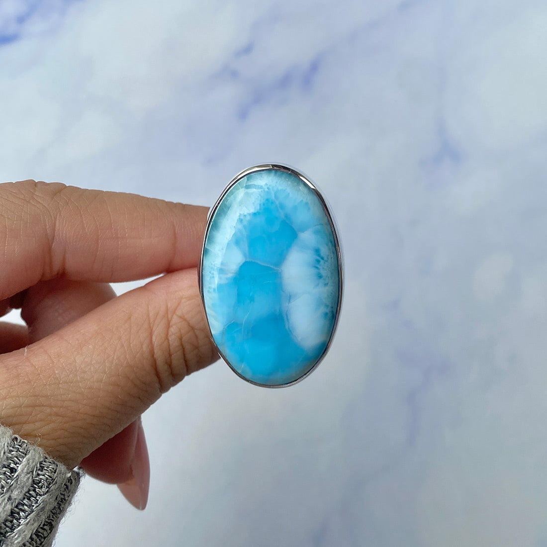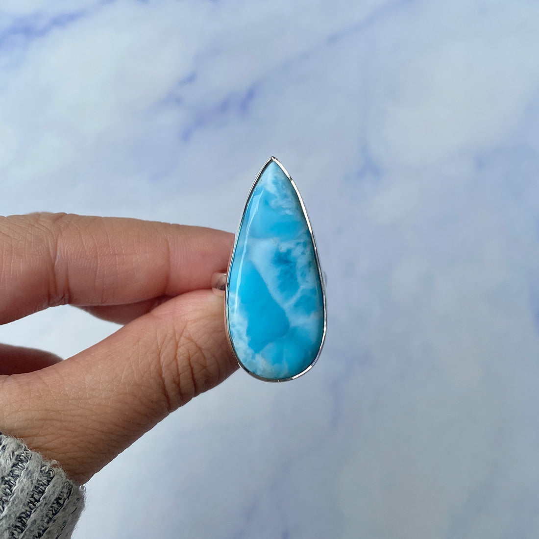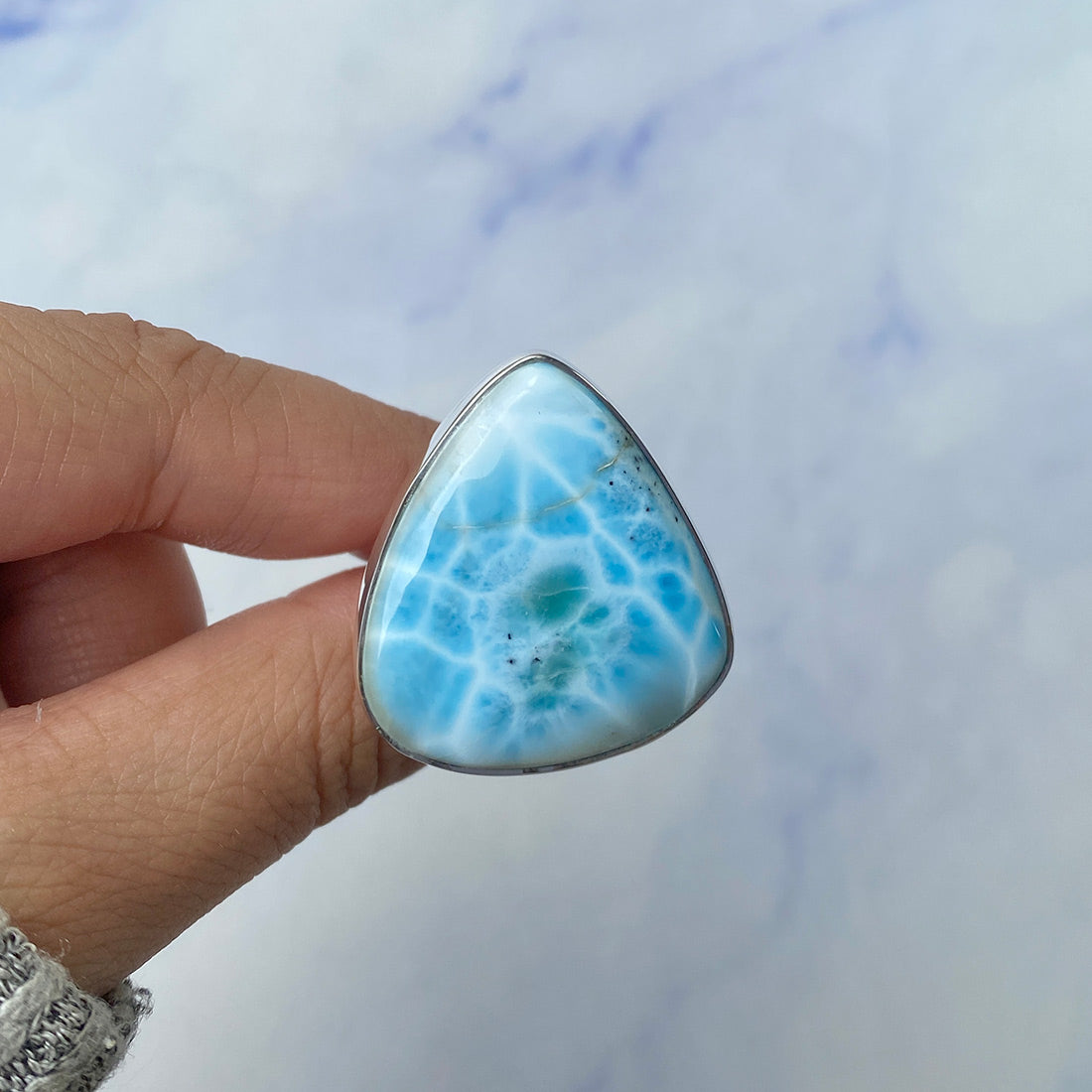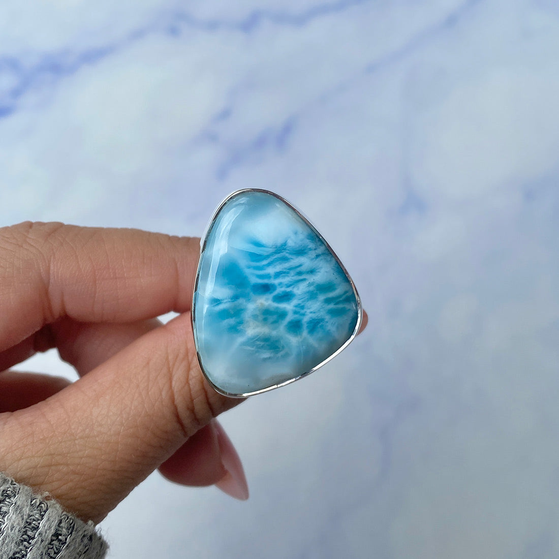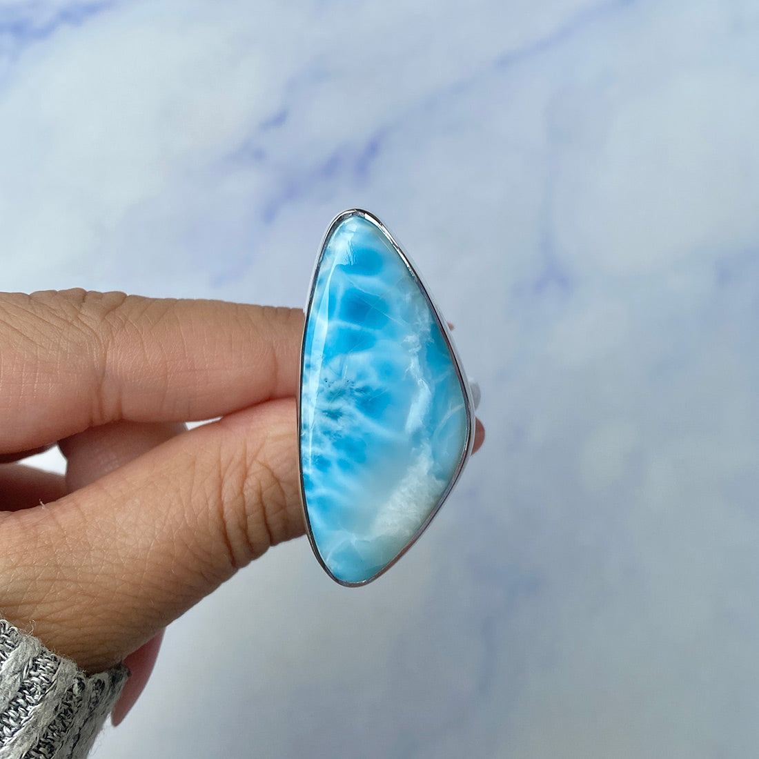 Larimar rings are thought to provide a number of therapeutic benefits. It is claimed to give relaxation and lessen tension and anxiety in the wearer by having a calming and soothing impact. Larimar's stunning blue hue is frequently connected to the sky and the ocean, fostering calm and peace. Some people think that wearing Larimar jewelry, such as Larimar bracelets, earrings, Larimar pendants, and necklaces, can aid in calming the mind and promoting inner peace.