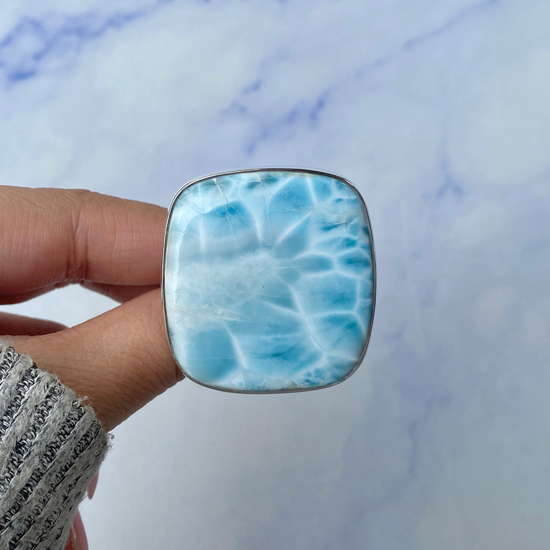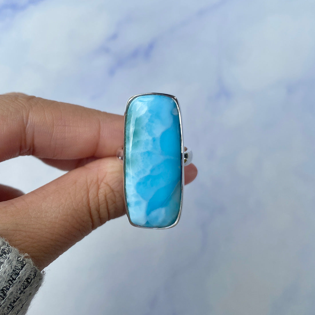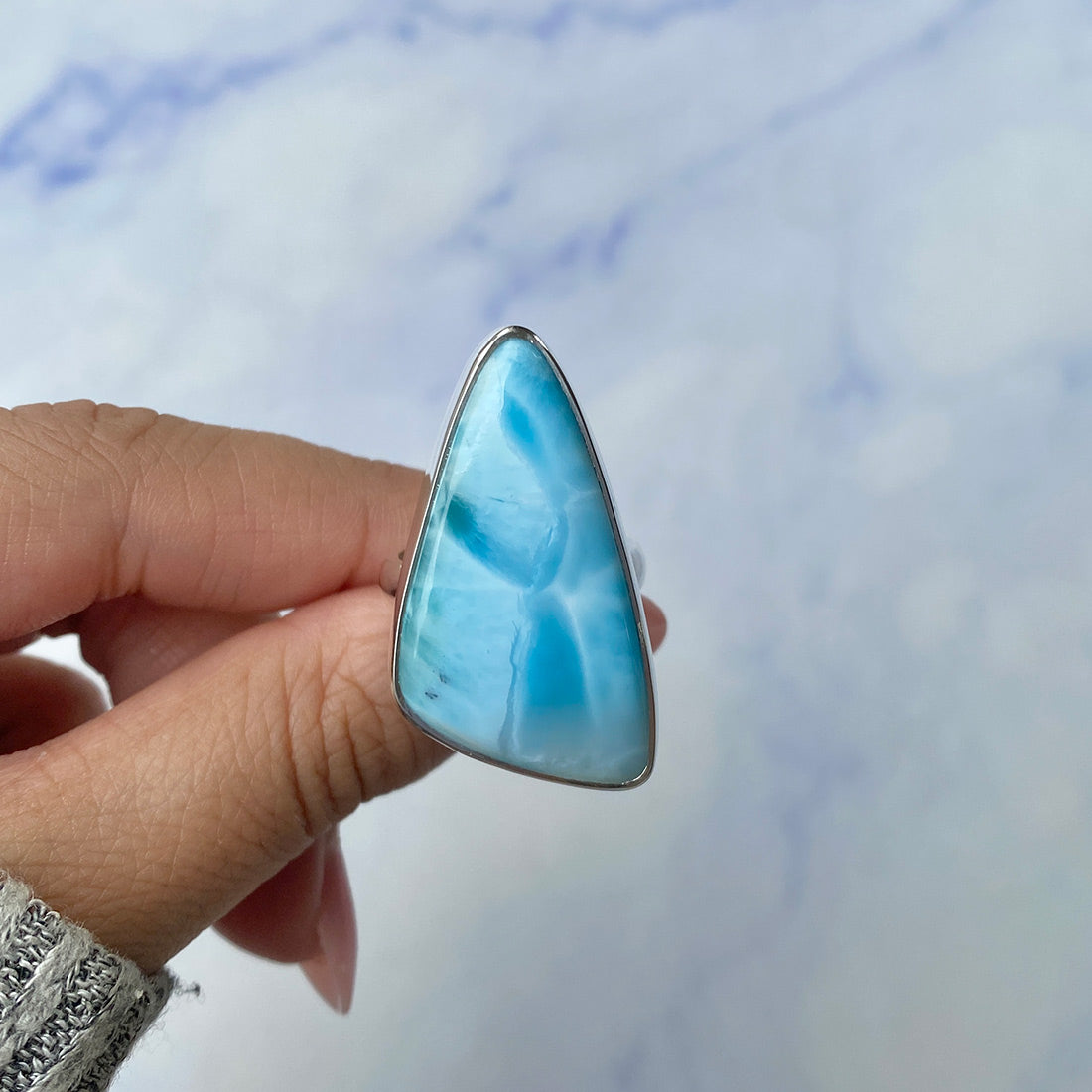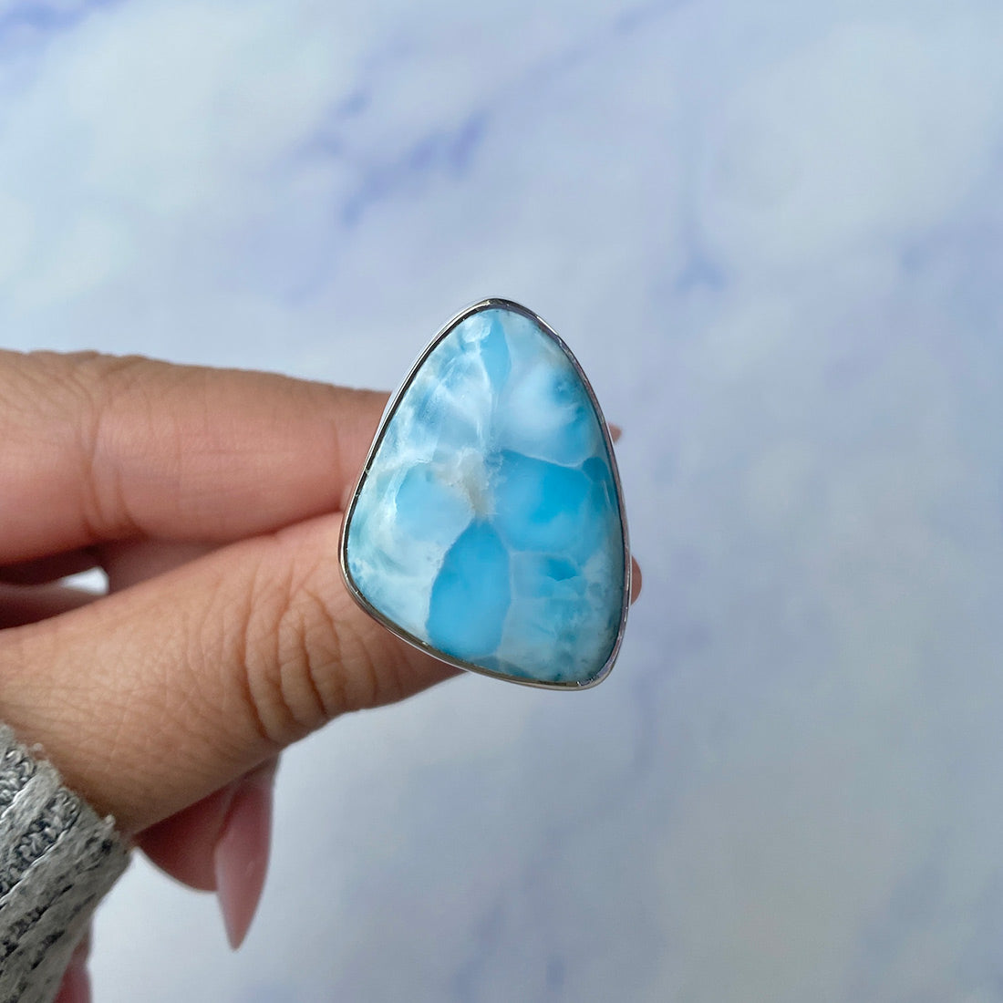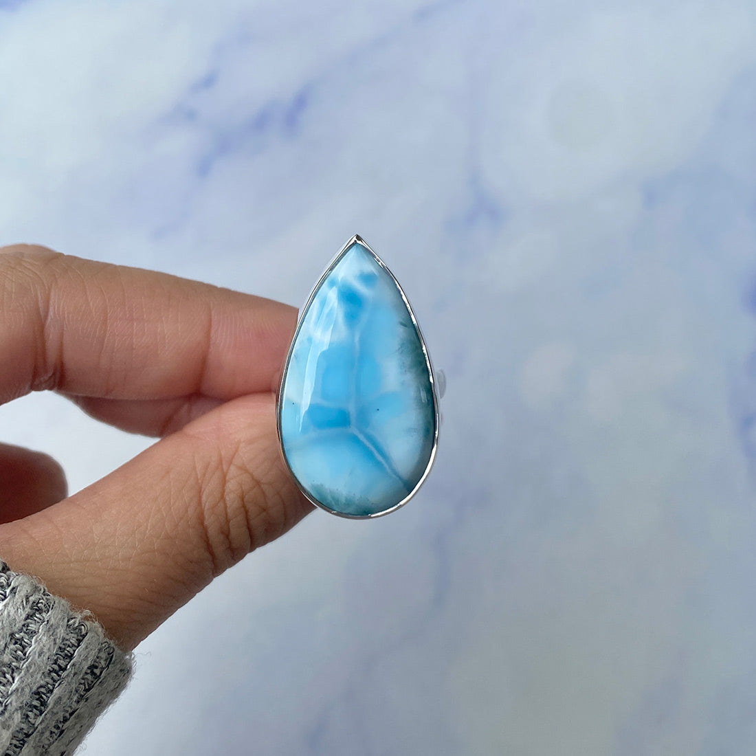 Larimar rings are thought to provide a number of therapeutic benefits. It is claimed to give relaxation and lessen tension and anxiety in the wearer by having a calming and soothing impact. Larimar's stunning blue hue is frequently connected to the sky and the ocean, fostering calm and peace. Some people think that wearing Larimar jewelry, such as Larimar bracelets, earrings, Larimar pendants, and necklaces, can aid in calming the mind and promoting inner peace.
