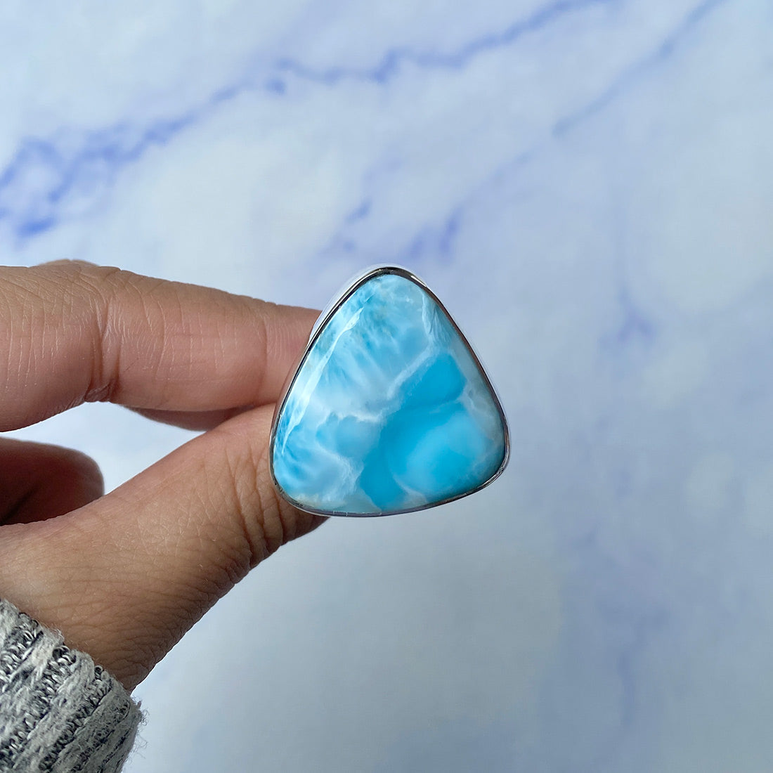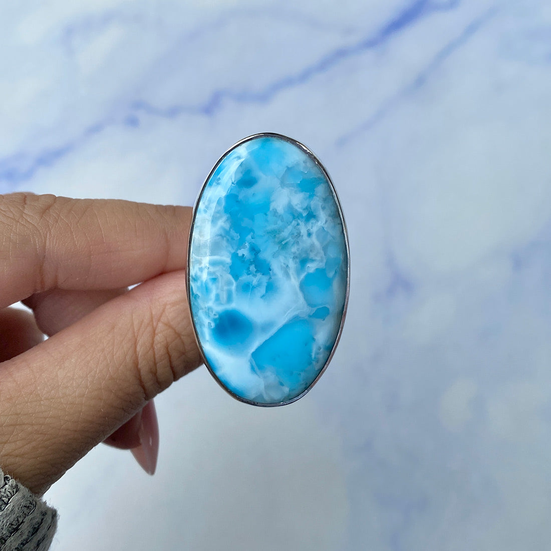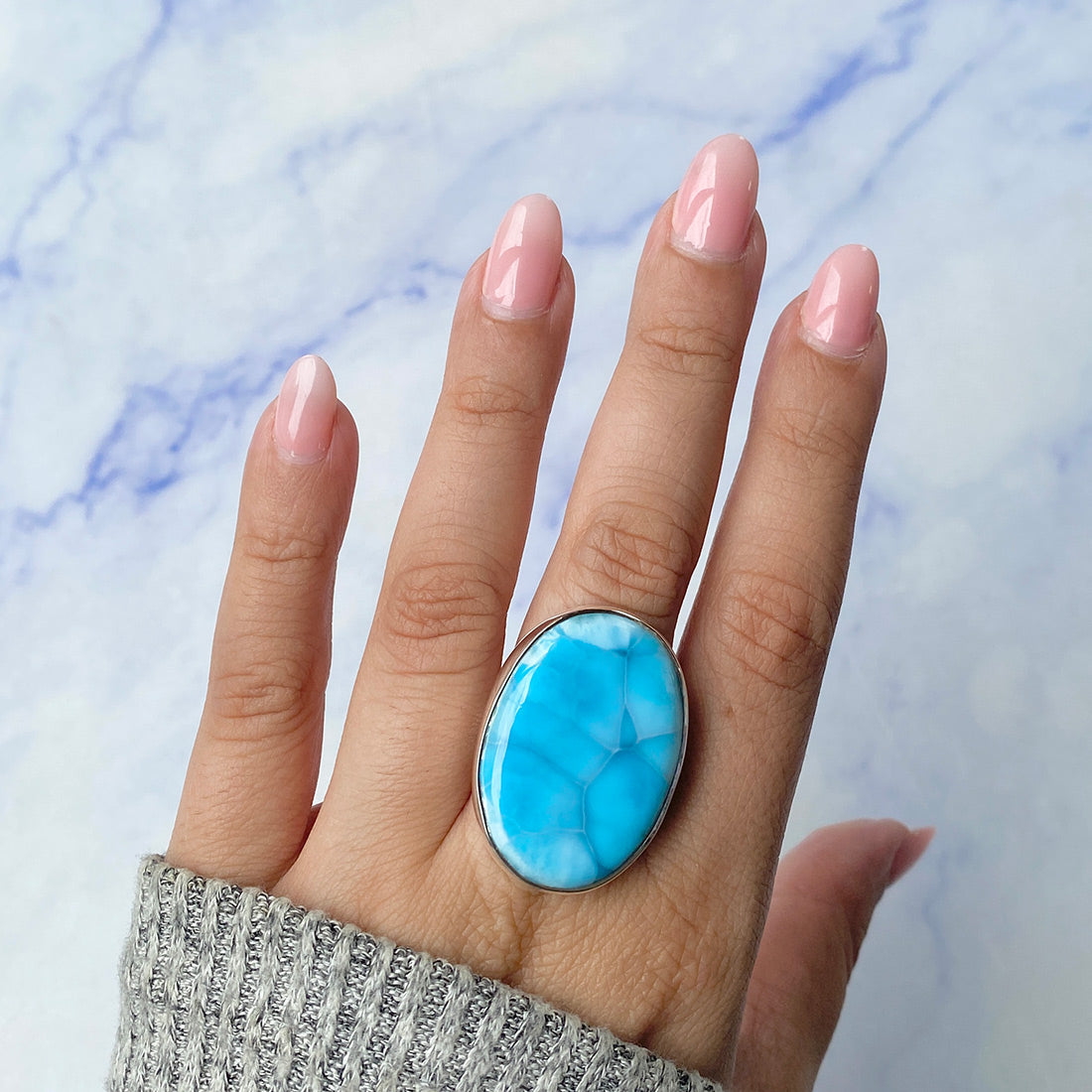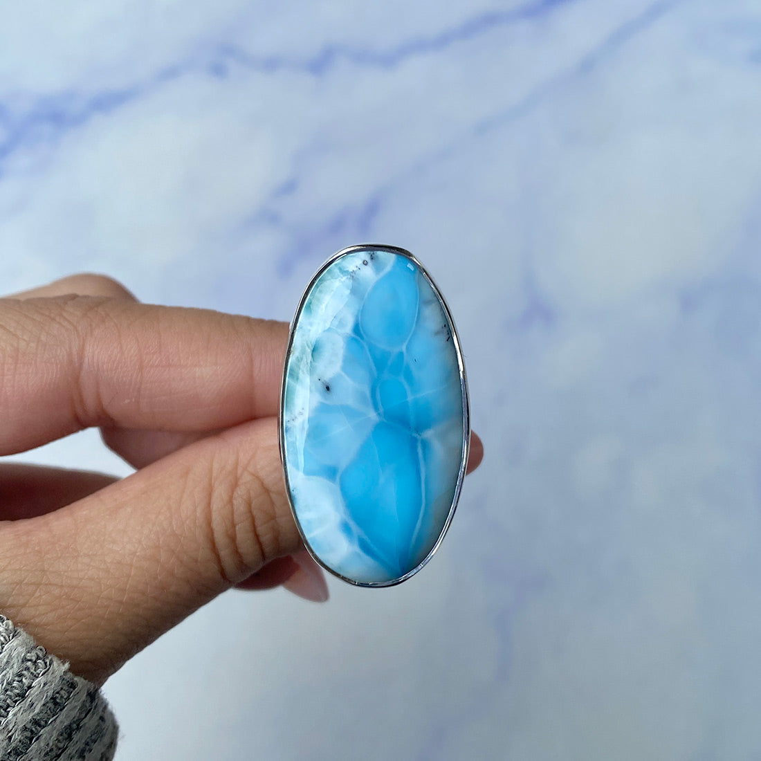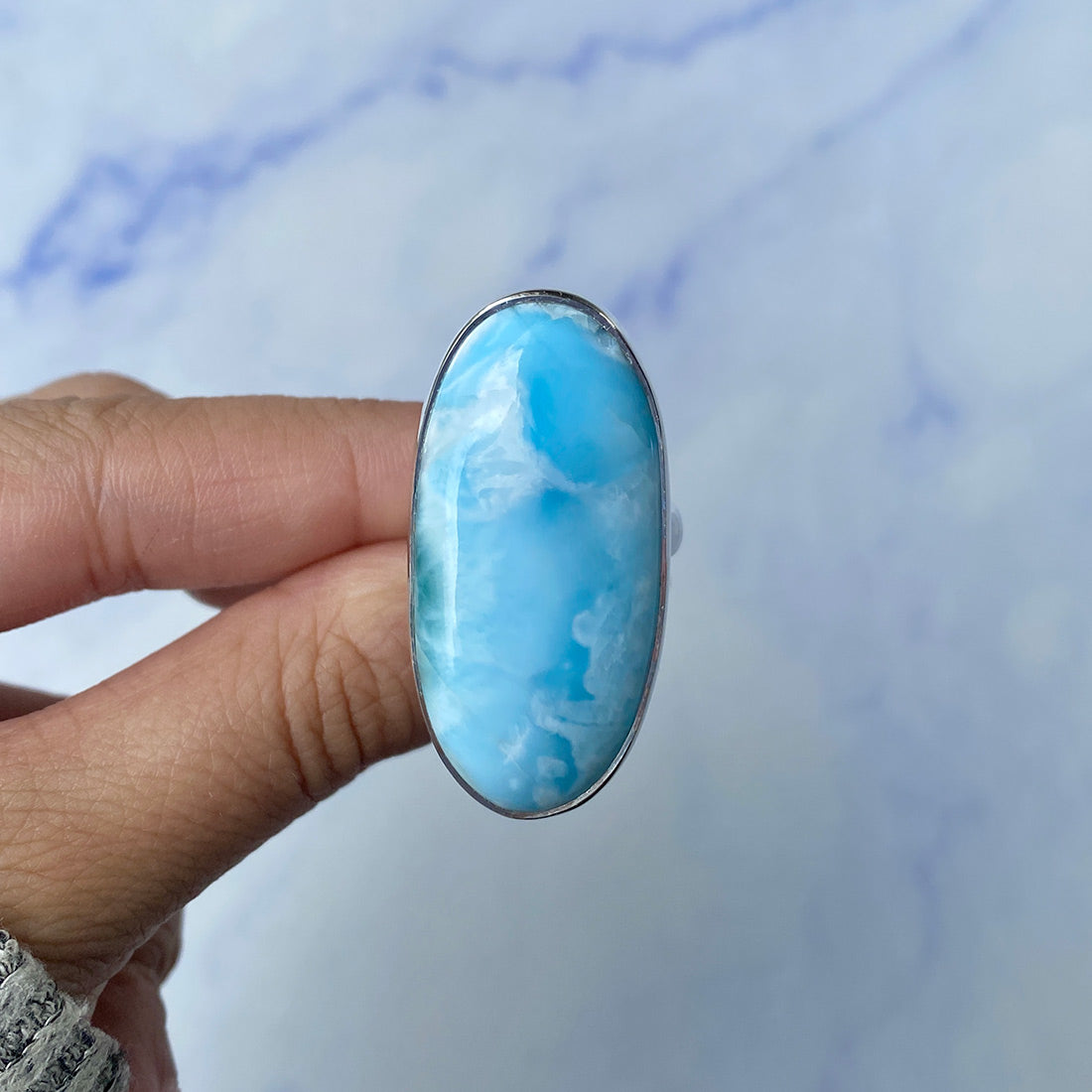 Larimar rings are thought to provide a number of therapeutic benefits. It is claimed to give relaxation and lessen tension and anxiety in the wearer by having a calming and soothing impact. Larimar's stunning blue hue is frequently connected to the sky and the ocean, fostering calm and peace. Some people think that wearing Larimar jewelry, such as Larimar bracelets, earrings, Larimar pendants, and necklaces, can aid in calming the mind and promoting inner peace.