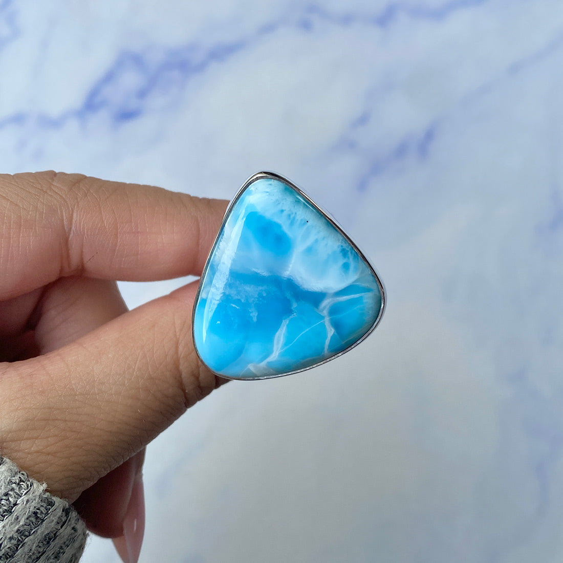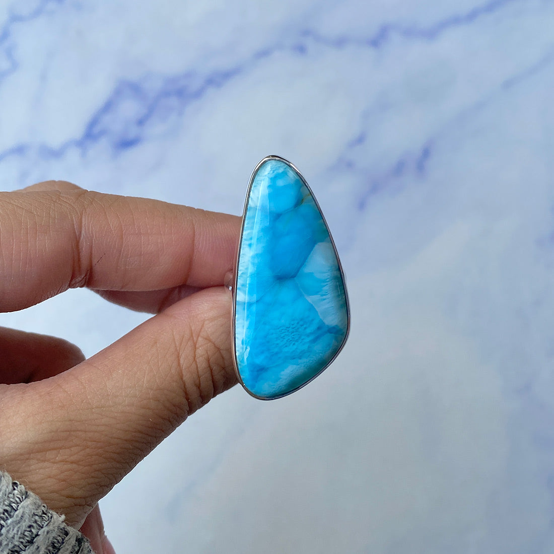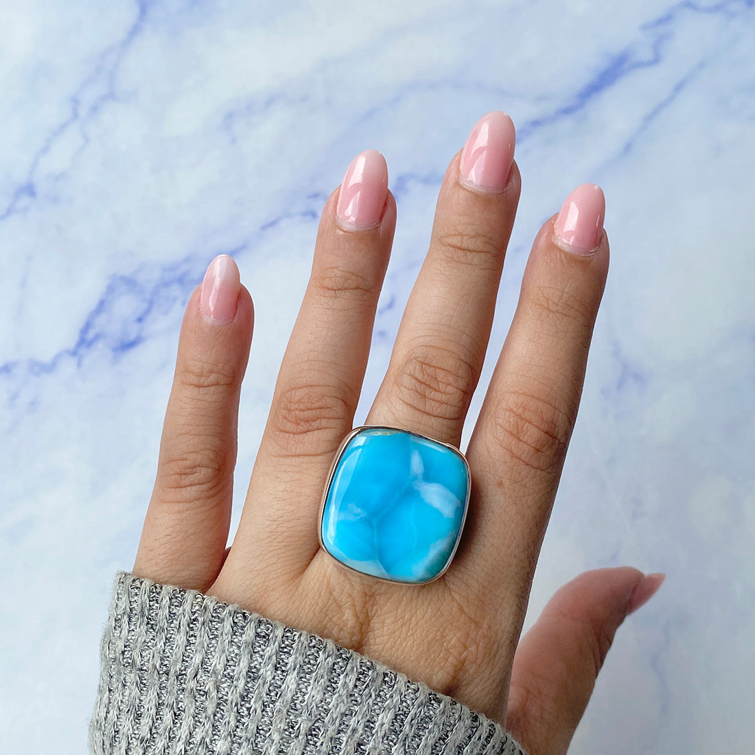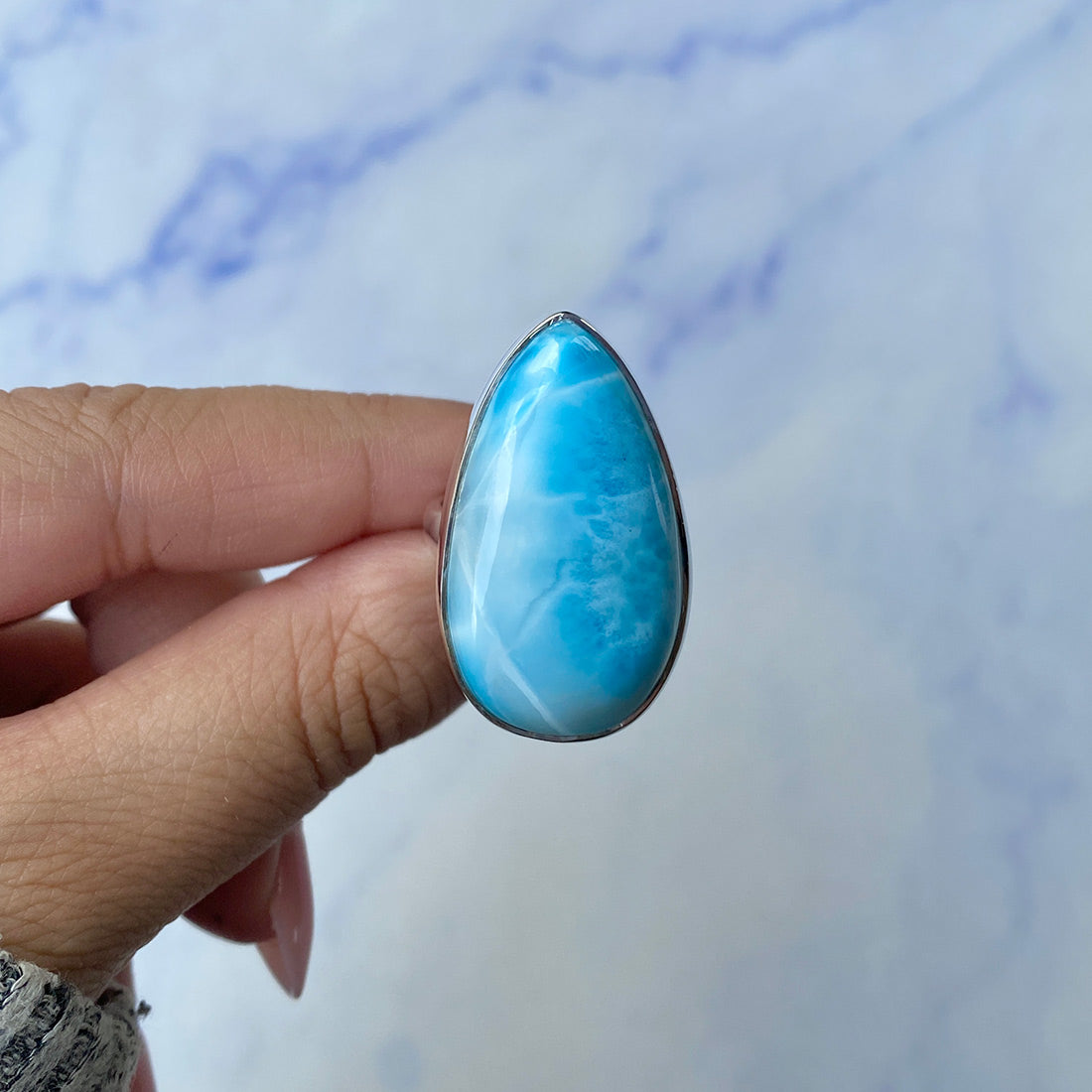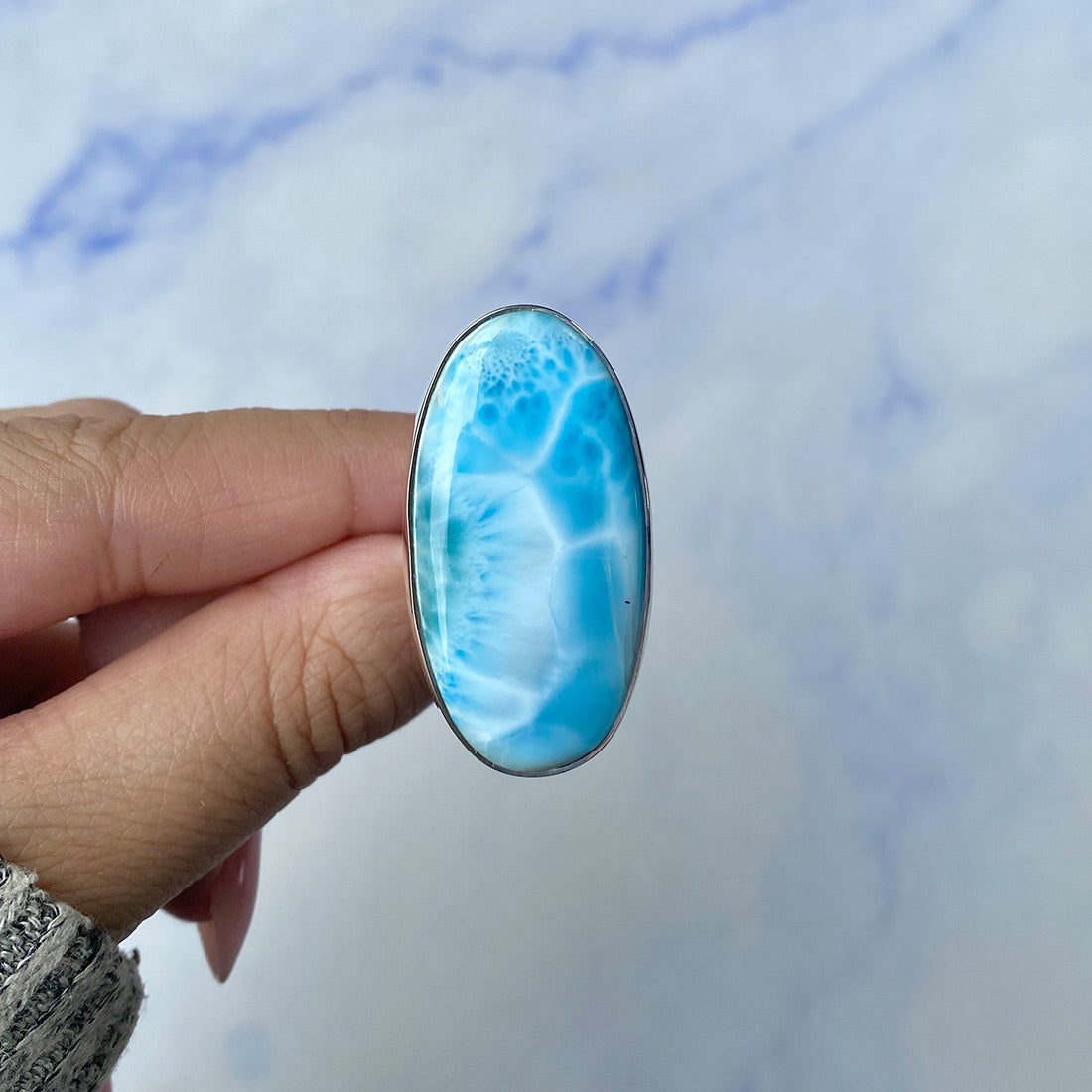 Larimar rings are thought to provide a number of therapeutic benefits. It is claimed to give relaxation and lessen tension and anxiety in the wearer by having a calming and soothing impact. Larimar's stunning blue hue is frequently connected to the sky and the ocean, fostering calm and peace. Some people think that wearing Larimar jewelry, such as Larimar bracelets, earrings, Larimar pendants, and necklaces, can aid in calming the mind and promoting inner peace.