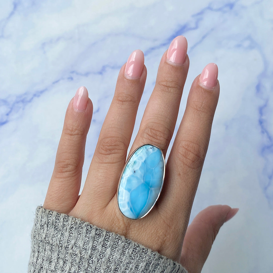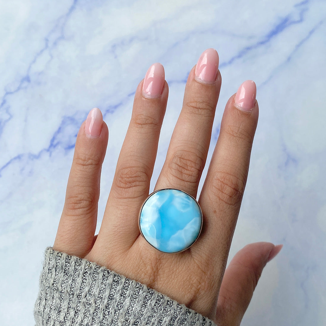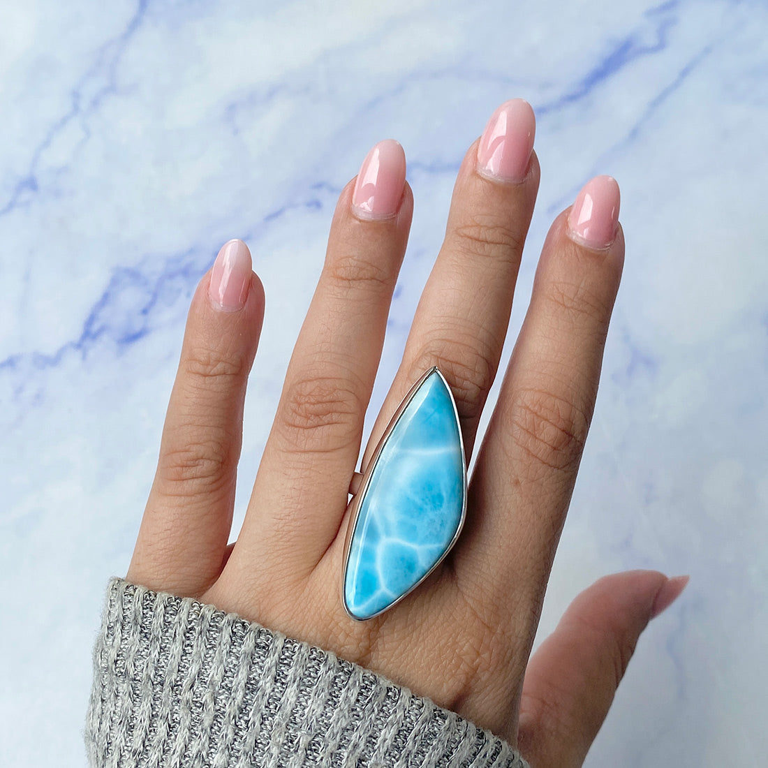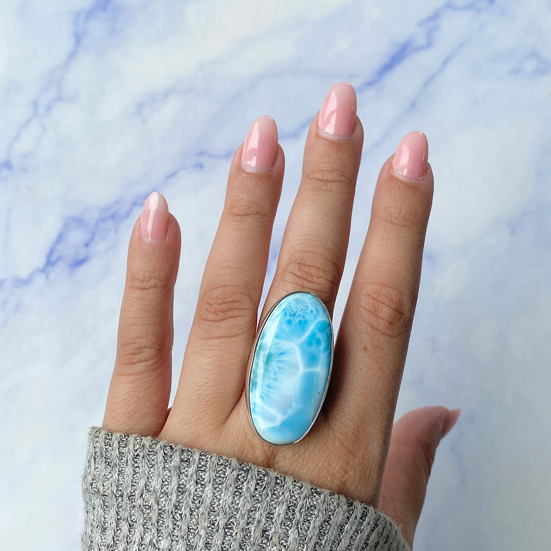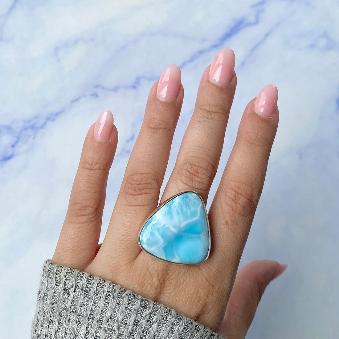 Larimar rings are thought to provide a number of therapeutic benefits. It is claimed to give relaxation and lessen tension and anxiety in the wearer by having a calming and soothing impact. Larimar's stunning blue hue is frequently connected to the sky and the ocean, fostering calm and peace. Some people think that wearing Larimar jewelry, such as Larimar bracelets, earrings, Larimar pendants, and necklaces, can aid in calming the mind and promoting inner peace.