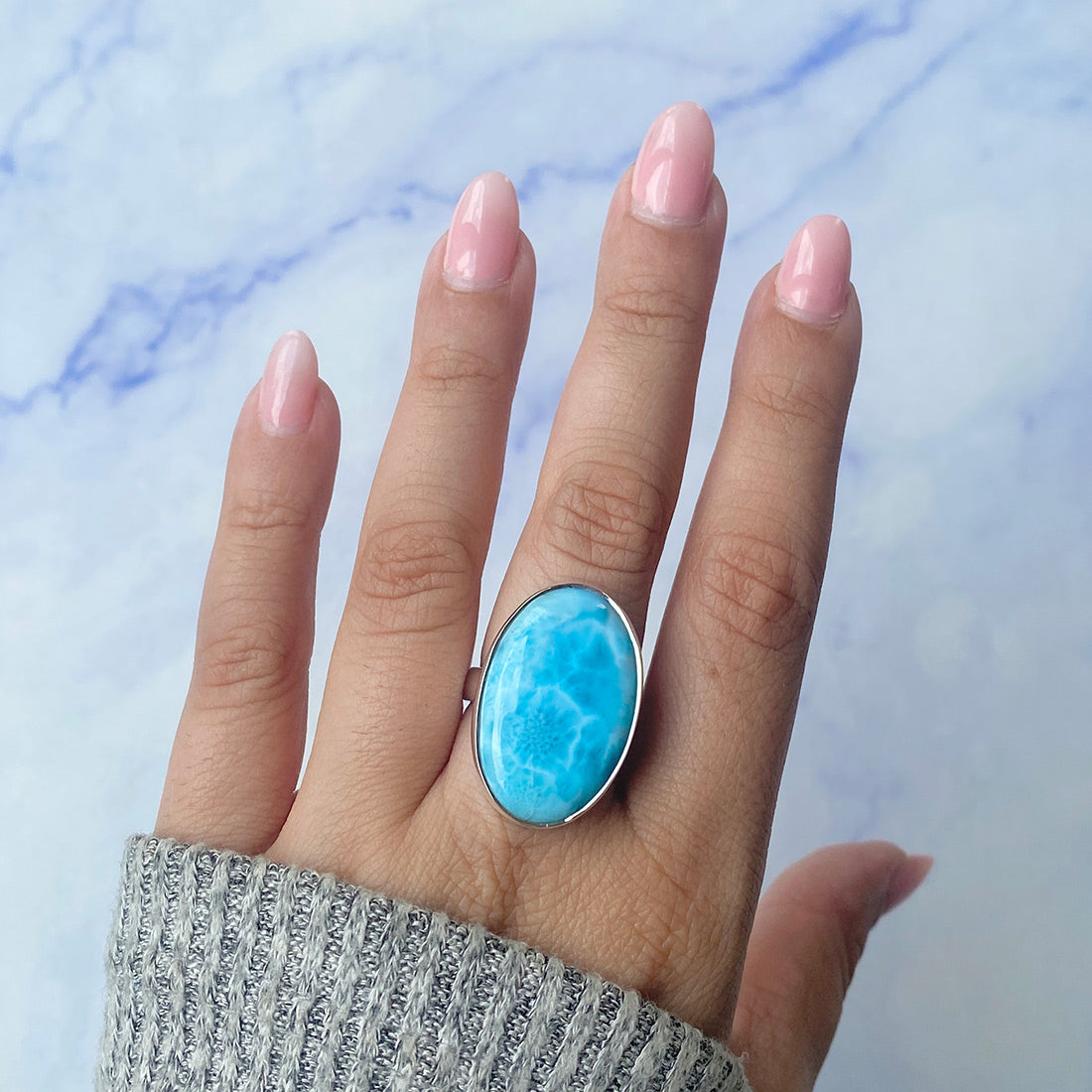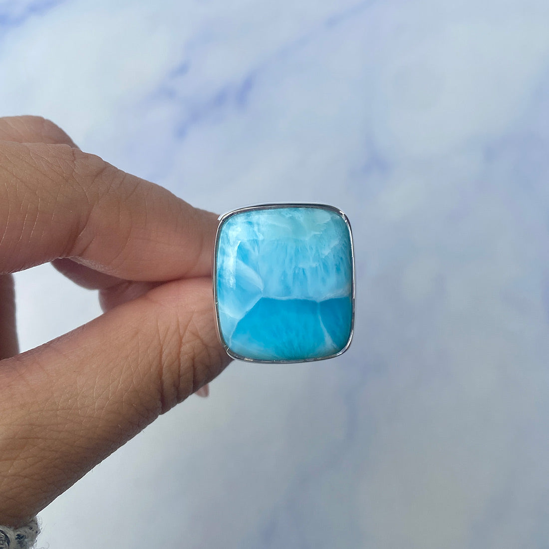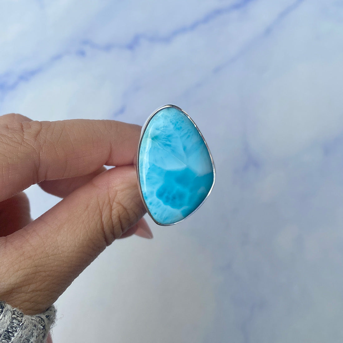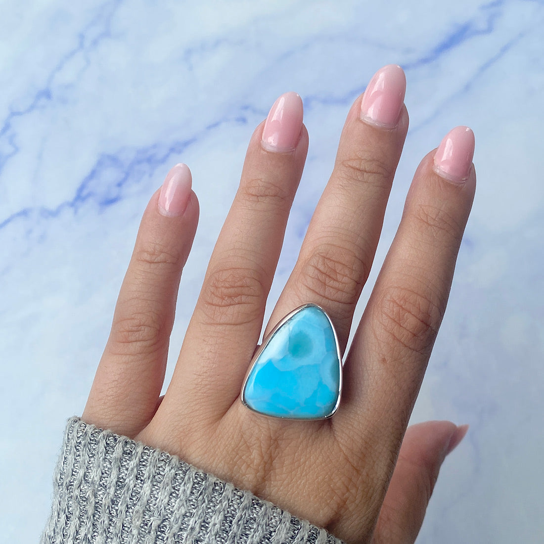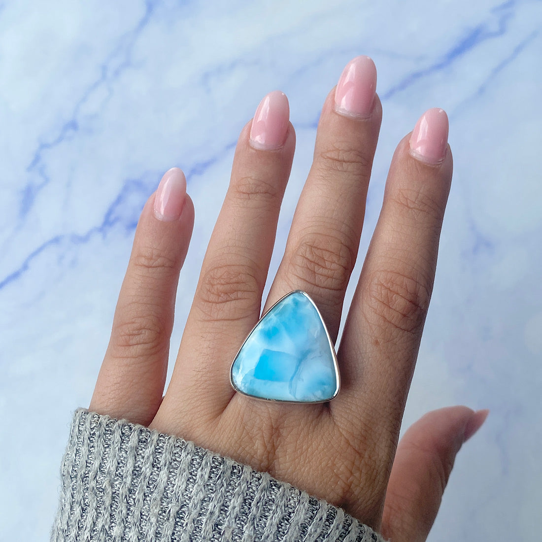 Larimar rings are thought to provide a number of therapeutic benefits. It is claimed to give relaxation and lessen tension and anxiety in the wearer by having a calming and soothing impact. Larimar's stunning blue hue is frequently connected to the sky and the ocean, fostering calm and peace. Some people think that wearing Larimar jewelry, such as Larimar bracelets, earrings, Larimar pendants, and necklaces, can aid in calming the mind and promoting inner peace.