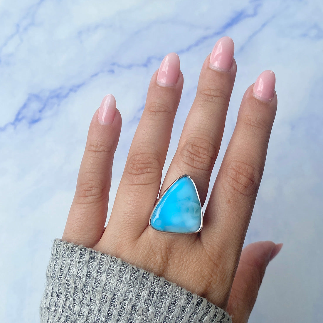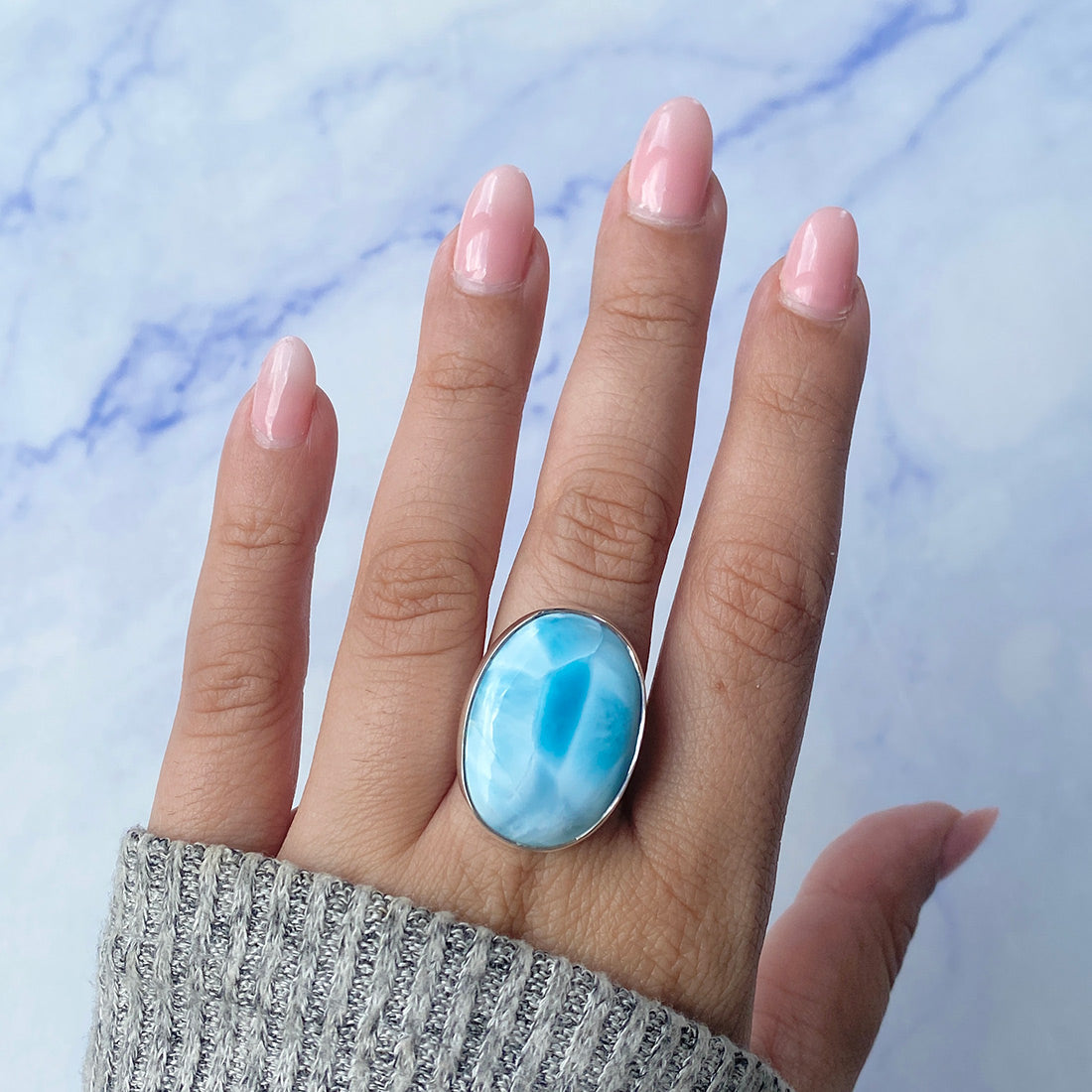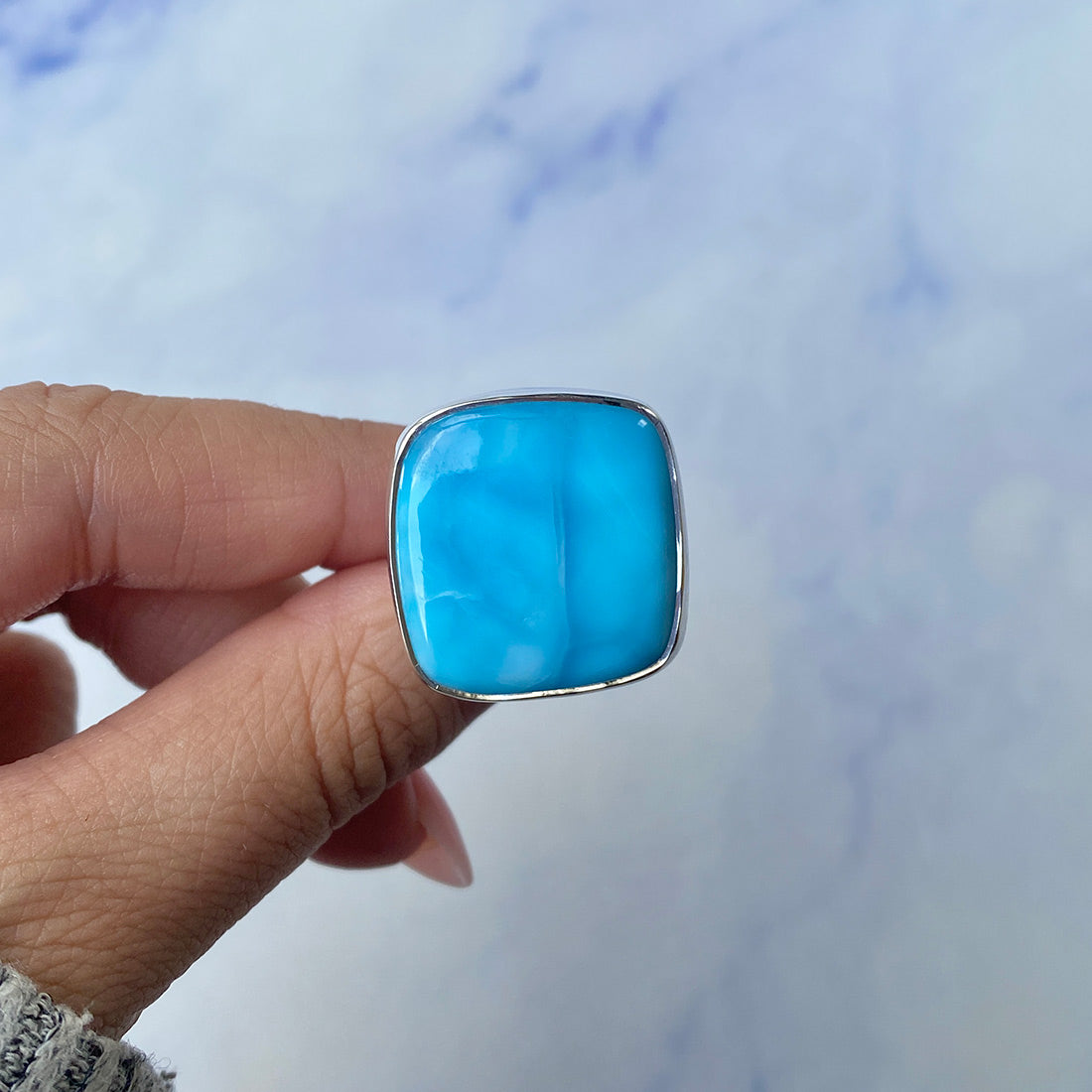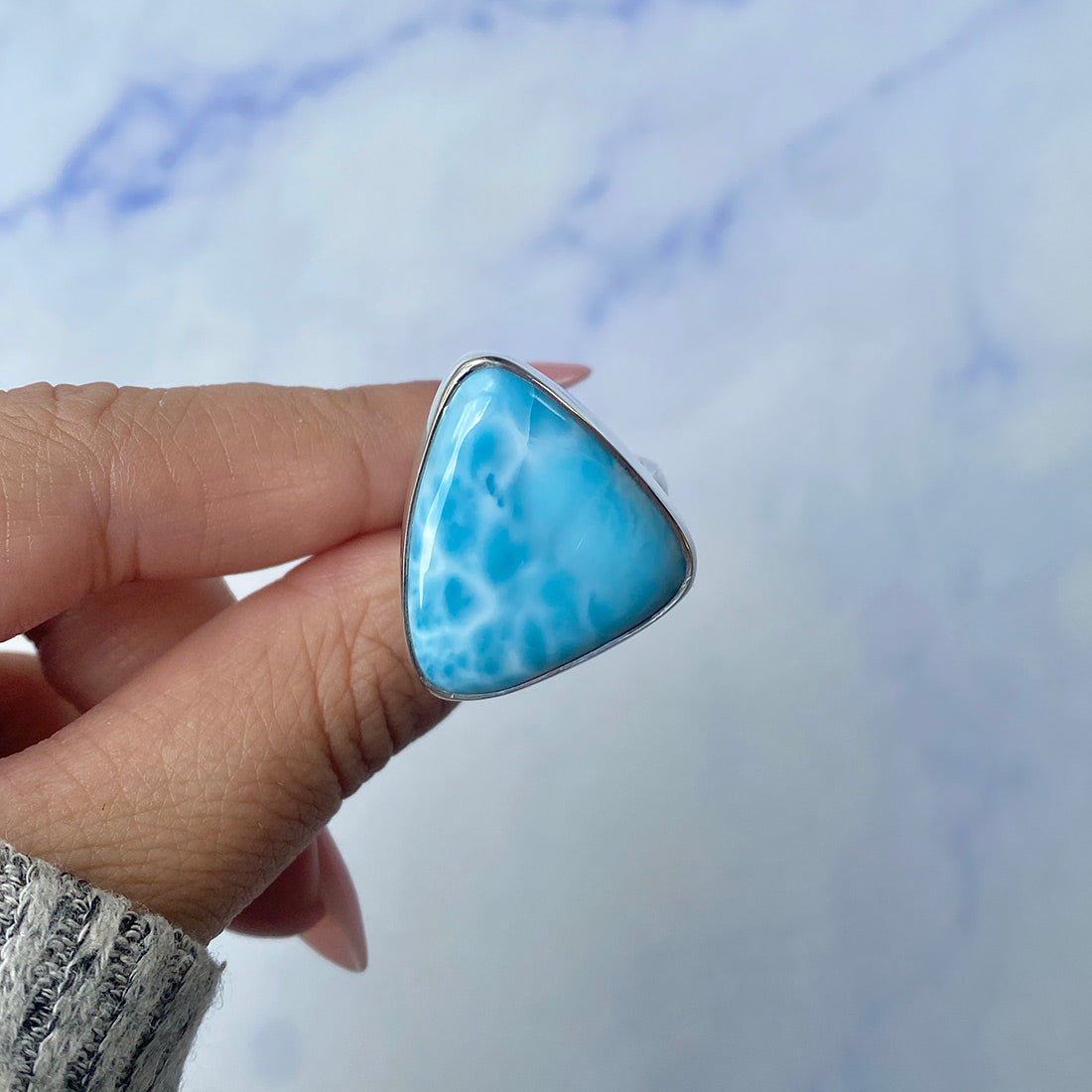 Larimar rings are thought to provide a number of therapeutic benefits. It is claimed to give relaxation and lessen tension and anxiety in the wearer by having a calming and soothing impact. Larimar's stunning blue hue is frequently connected to the sky and the ocean, fostering calm and peace. Some people think that wearing Larimar jewelry, such as Larimar bracelets, earrings, Larimar pendants, and necklaces, can aid in calming the mind and promoting inner peace.